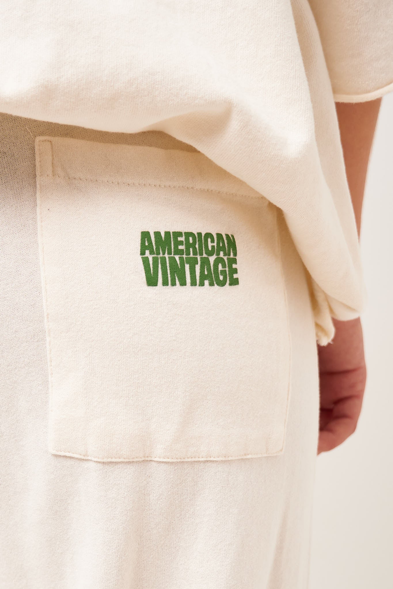 Gixy T-Shirt White from American Vintage. These pants are made of cotton. They are designed in a loose fit with raw edges at the bottom. The pants have side pockets and a back pocket with a printed American Vintage logo. The pants have elastic and a drawstring at the waist.