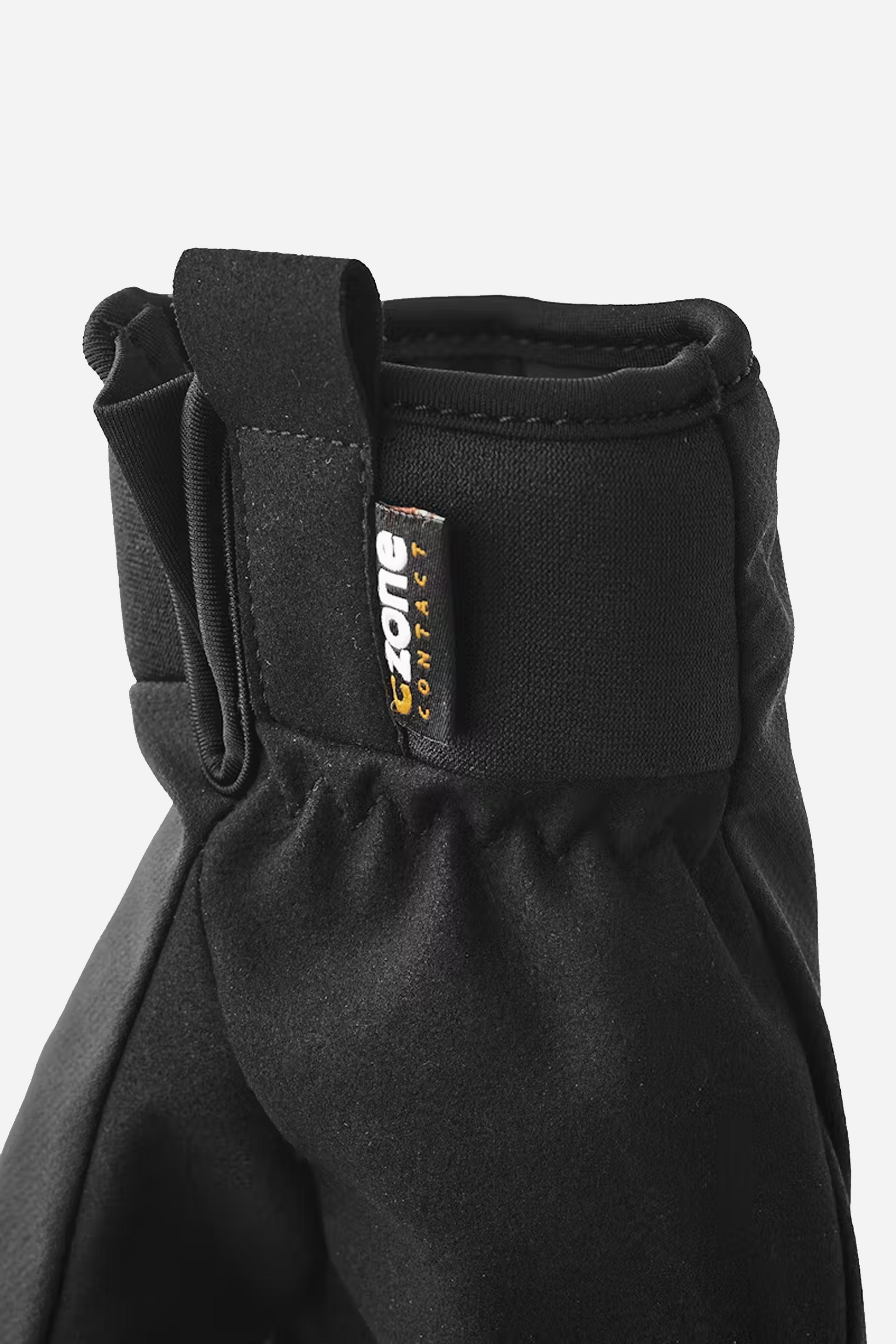 ZCone Bike Mistral 5-Finger Black from Hestra. These gloves are made of a polyester blend with elastic. They are designed with a reflector Hestra logo, and a snug fit. The gloves are lined with fleece, and are windproof and waterproof.