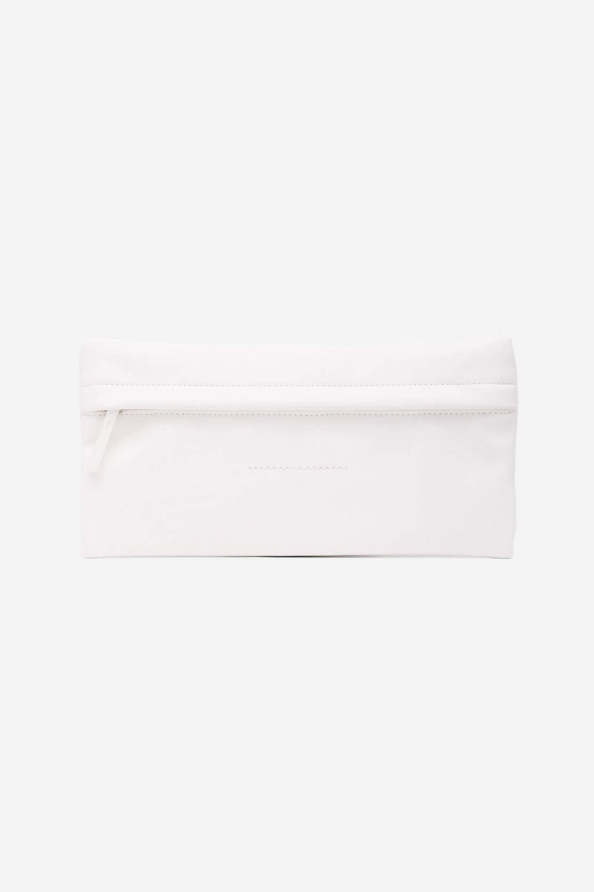 Numeric Label Clutch White from MM6 Maison Margiela. This bag is made of polyester. It is designed with a compartment that opens with a zipper on the back. The bag has a printed MM6 Maison Margiela logo on the front.