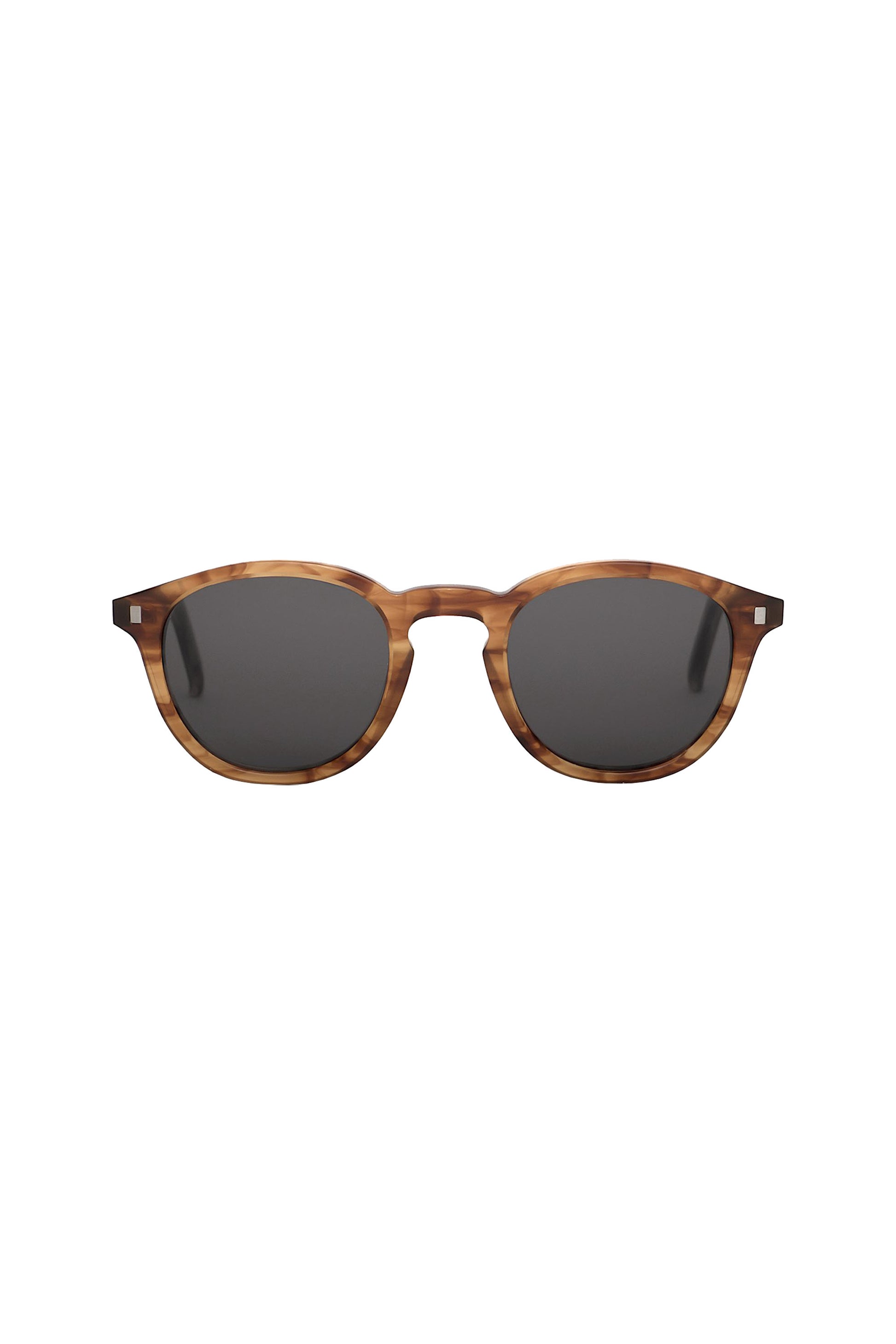 Nelson in Amber/Grey Solid Lens from Monokel Eyewear. These sunglasses are handcrafted in premium plant-based acetate and are designed with Carl Zeiss Vision lenses that ensure 100% UV protection. The sunglasses come in a box with case and polishing cloth.