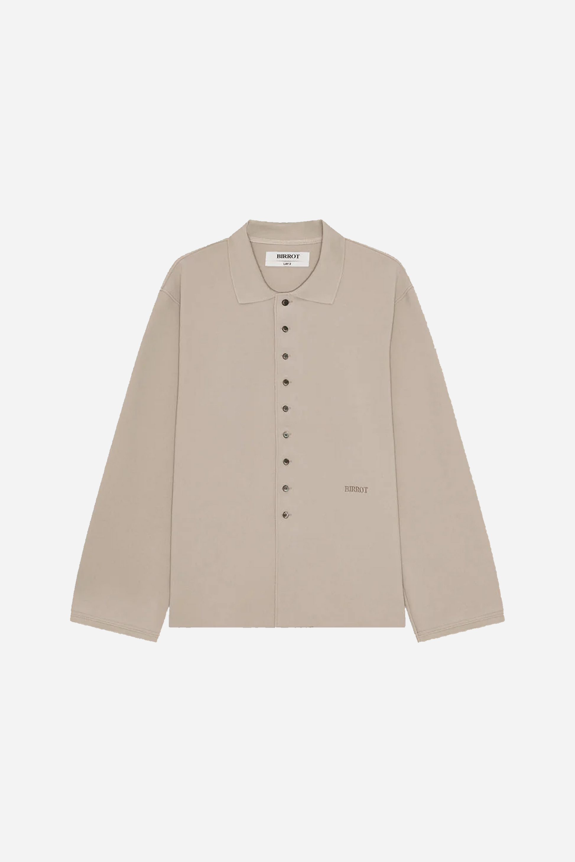 Lay2 Rib Collared Shirt Sand from BIRROT. This shirt is made from a heavy polyester blend. It is designed with a slim fit, loose sleeves, a collar and an embroidered BIRROT logo on the left front. The shirt closes with buttons at the front.