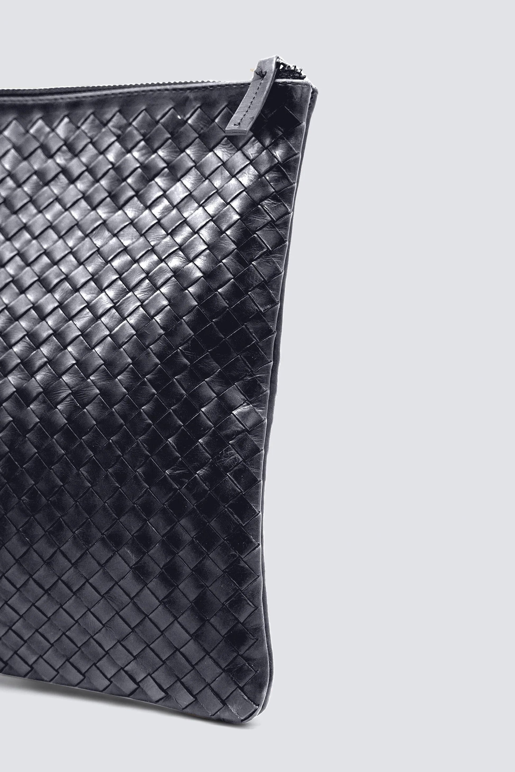 A4 Pochette Black from Dragon Diffusion. This small bag is handmade and is designed in braided leather. It can be used as a cover for a MacBook 13" and is designed with two smaller pockets inside. The bag closes with a zipper.
