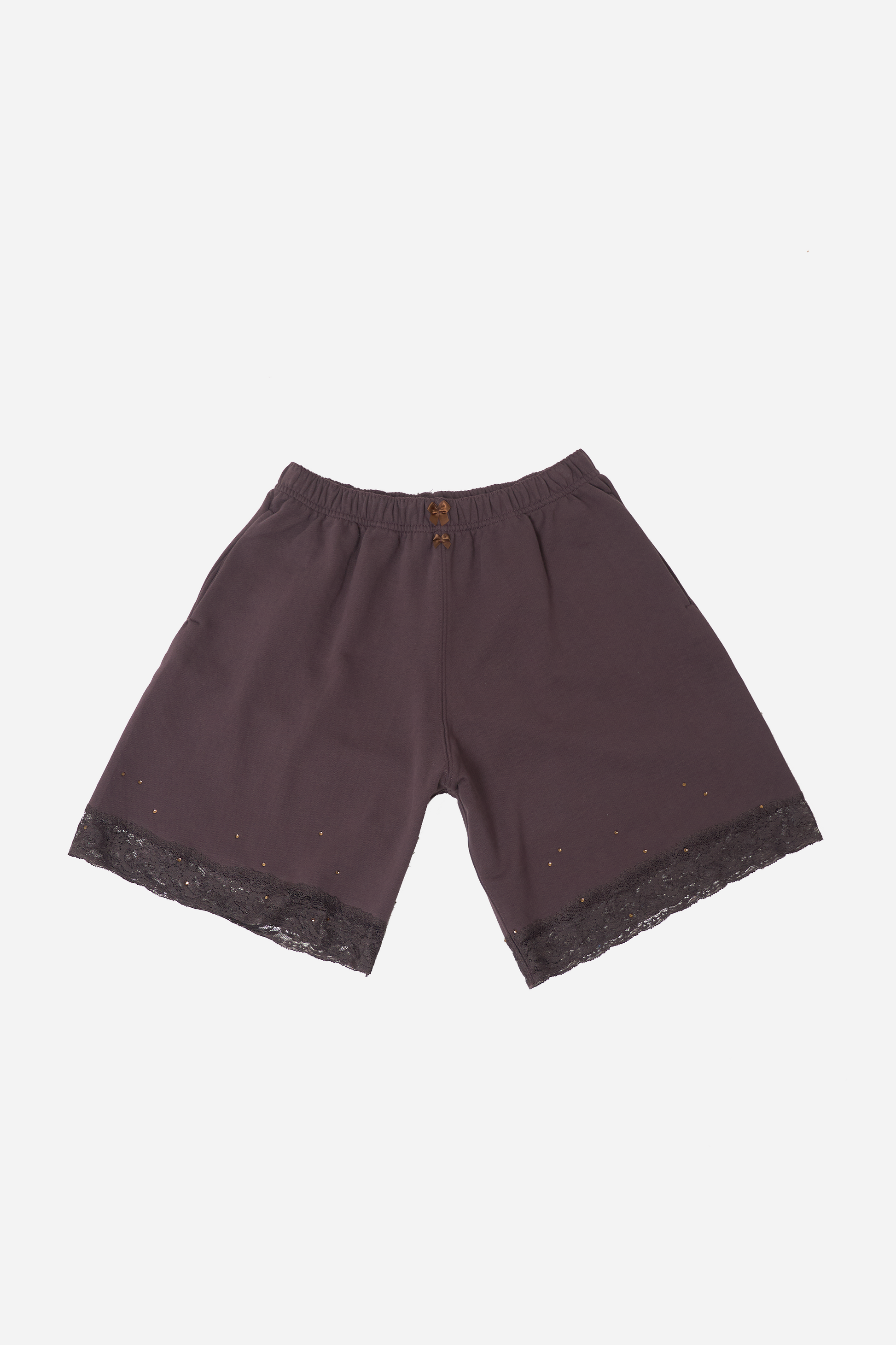 Lace Bermuda Sweatshorts Cocoa Brown from gabi gamél. These shorts are made of cotton. They are designed with lace details and rhinestones at the bottom, side pockets, bows at the front and elastic at the waist.