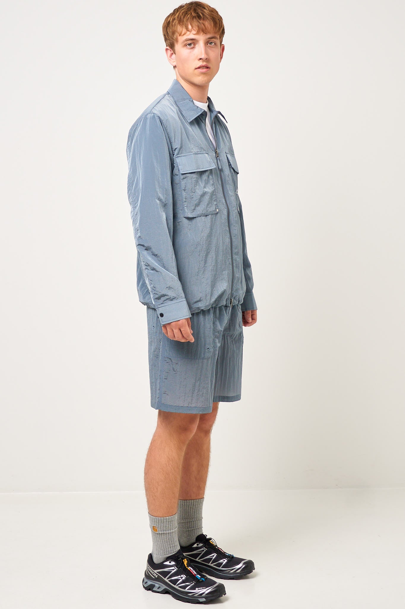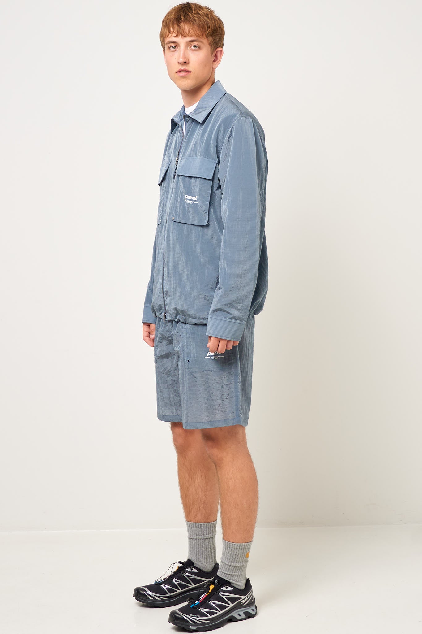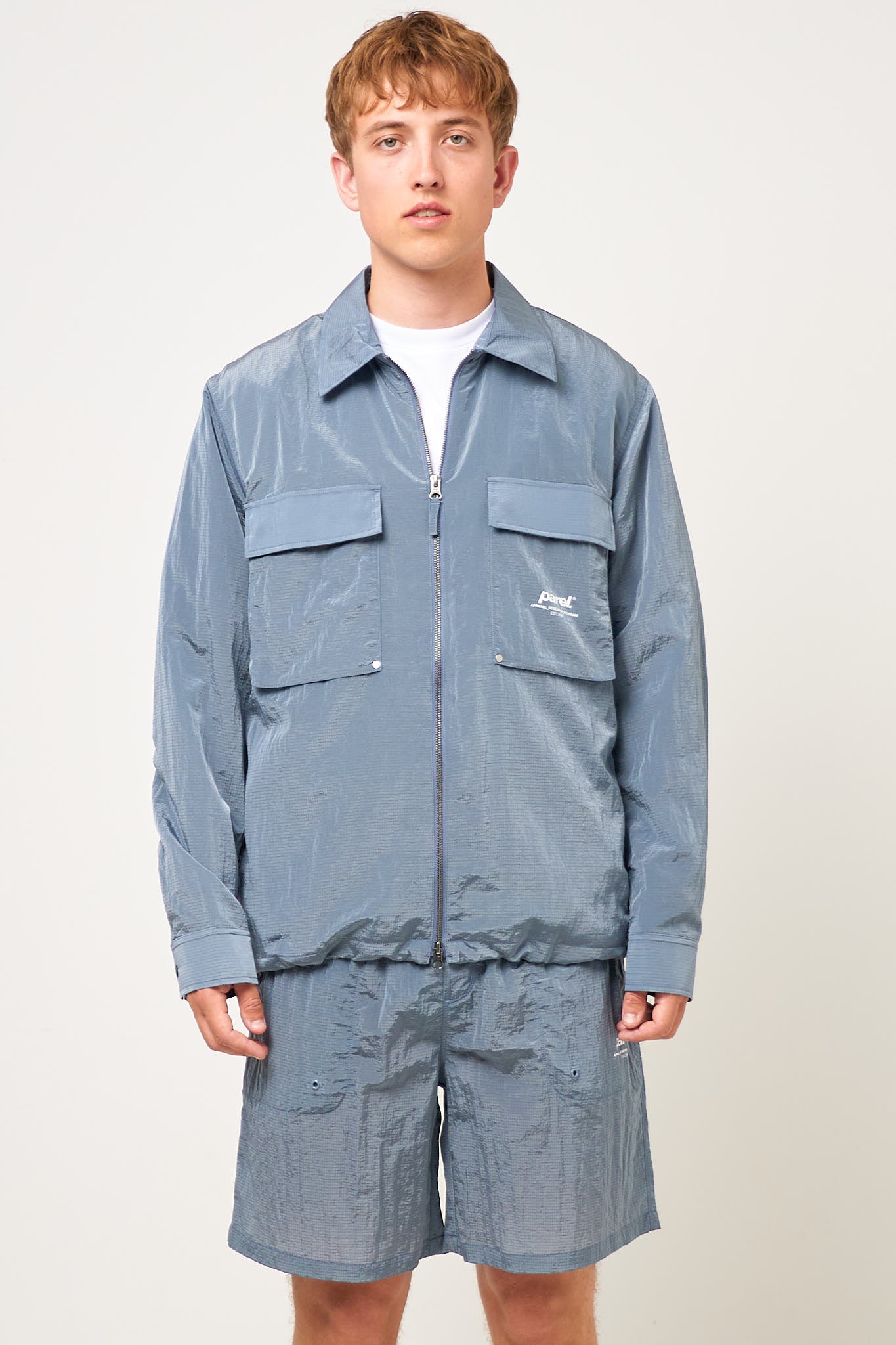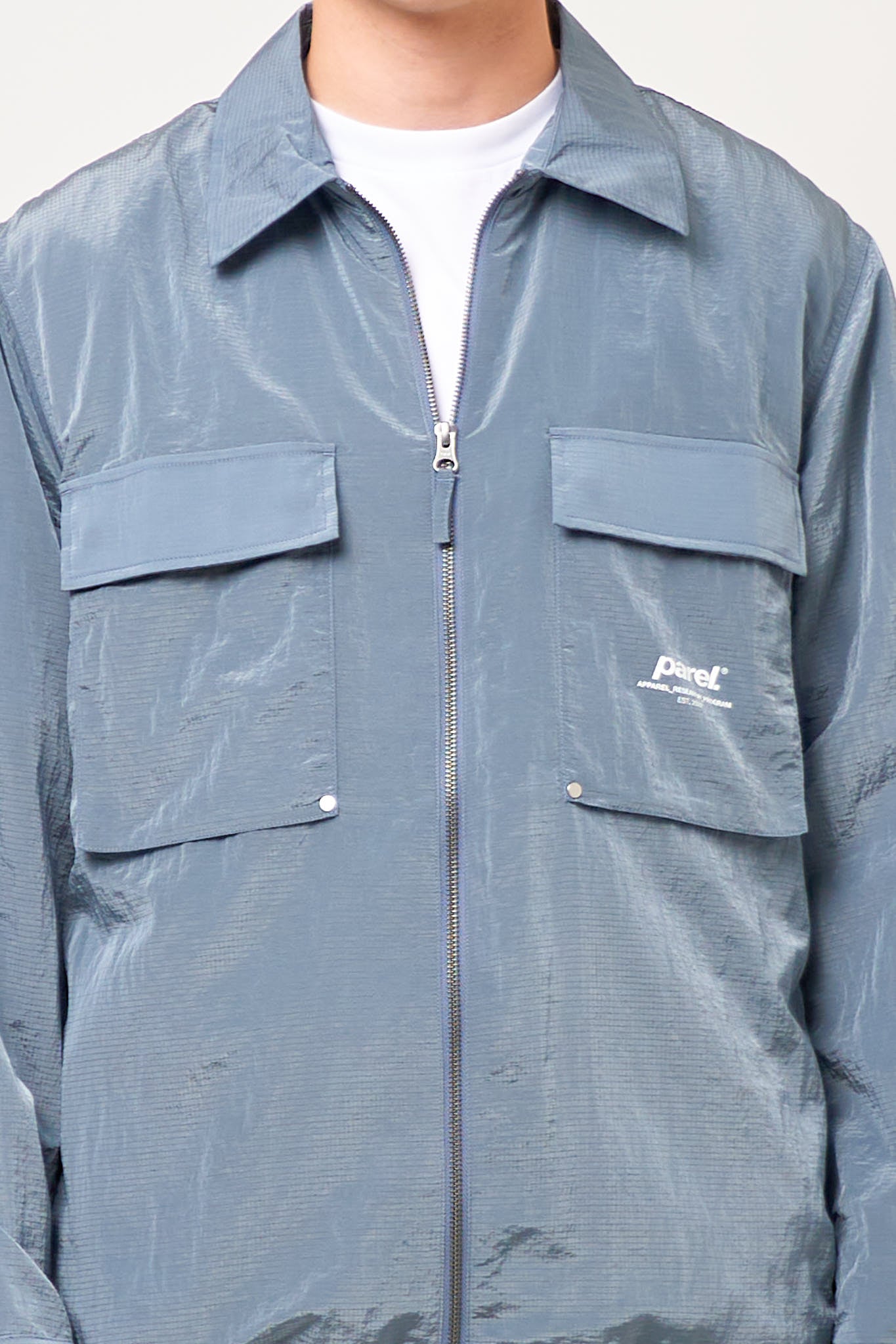 Faro Luma Overshirt Steel Blue from Parel Studios. This shirt is made of a thin nylon. It is designed with two larger pockets at the front that close with a flap. The shirt closes with a zipper, and has a printed Parel Studios logo on the left front pocket on the side.