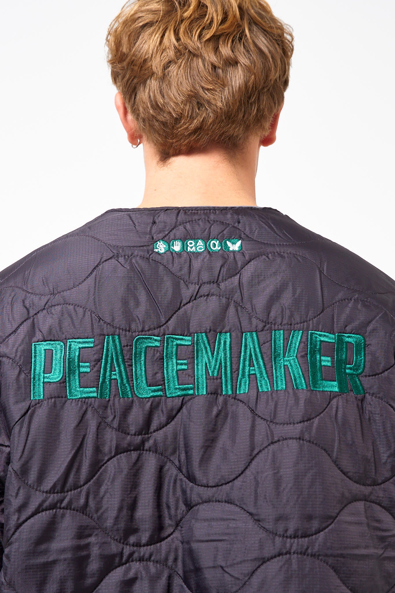Combat Liner Black from OAMC Peacemaker. This jacket is made of a shiny polyester. It has a deep v-neck and closes with buttons. The jacket is designed with the OAMC Peacemaker logo on the front and a larger embroidered logo on the back.
