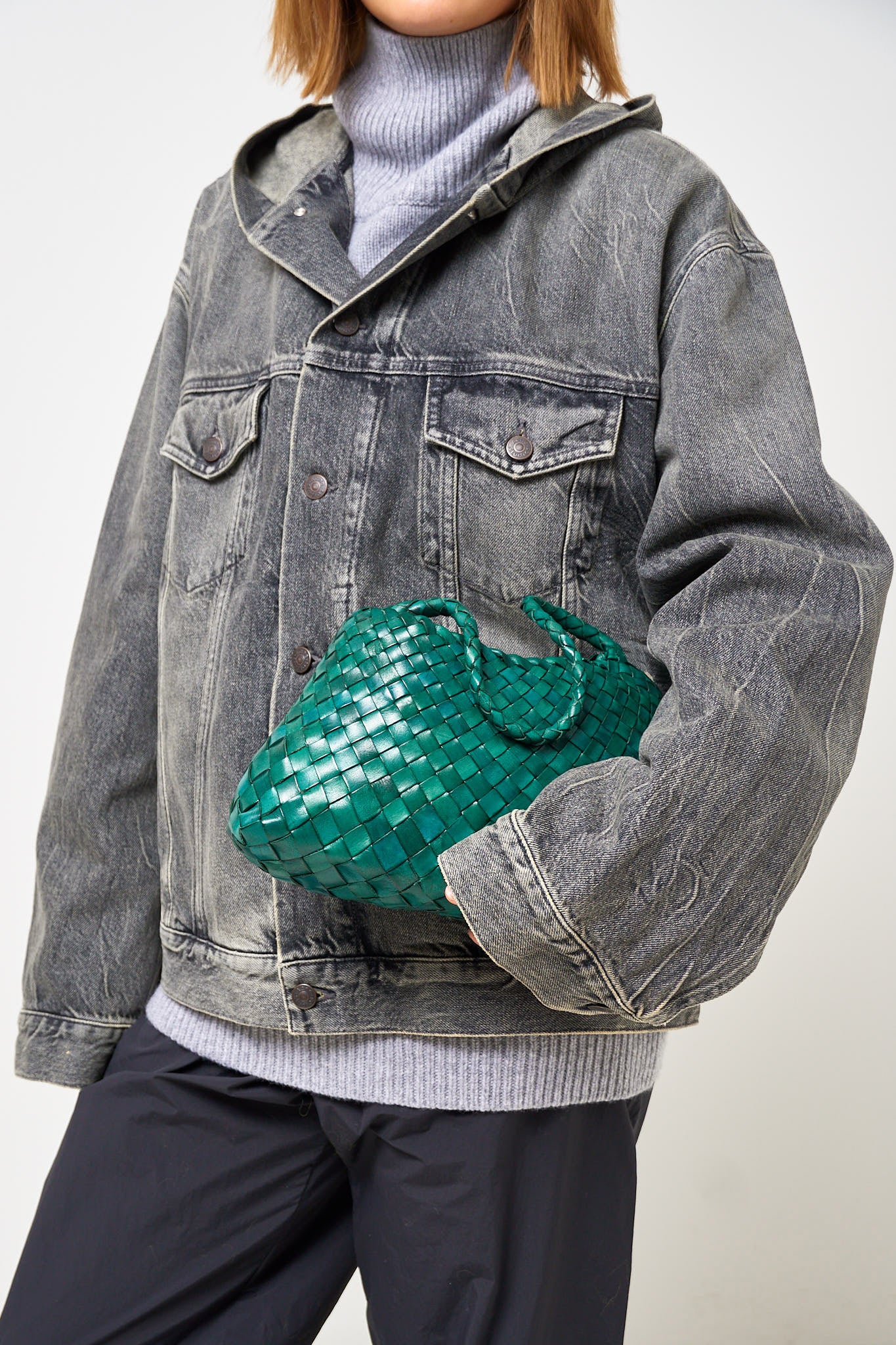 Rosanna Bag Forest Green fra Dragon Diffusion. Denne taske er håndlavet i Indien og er designet i flettet læder. Tasken har et stort indvendigt rum, et vedhæng og en enkelt strop.