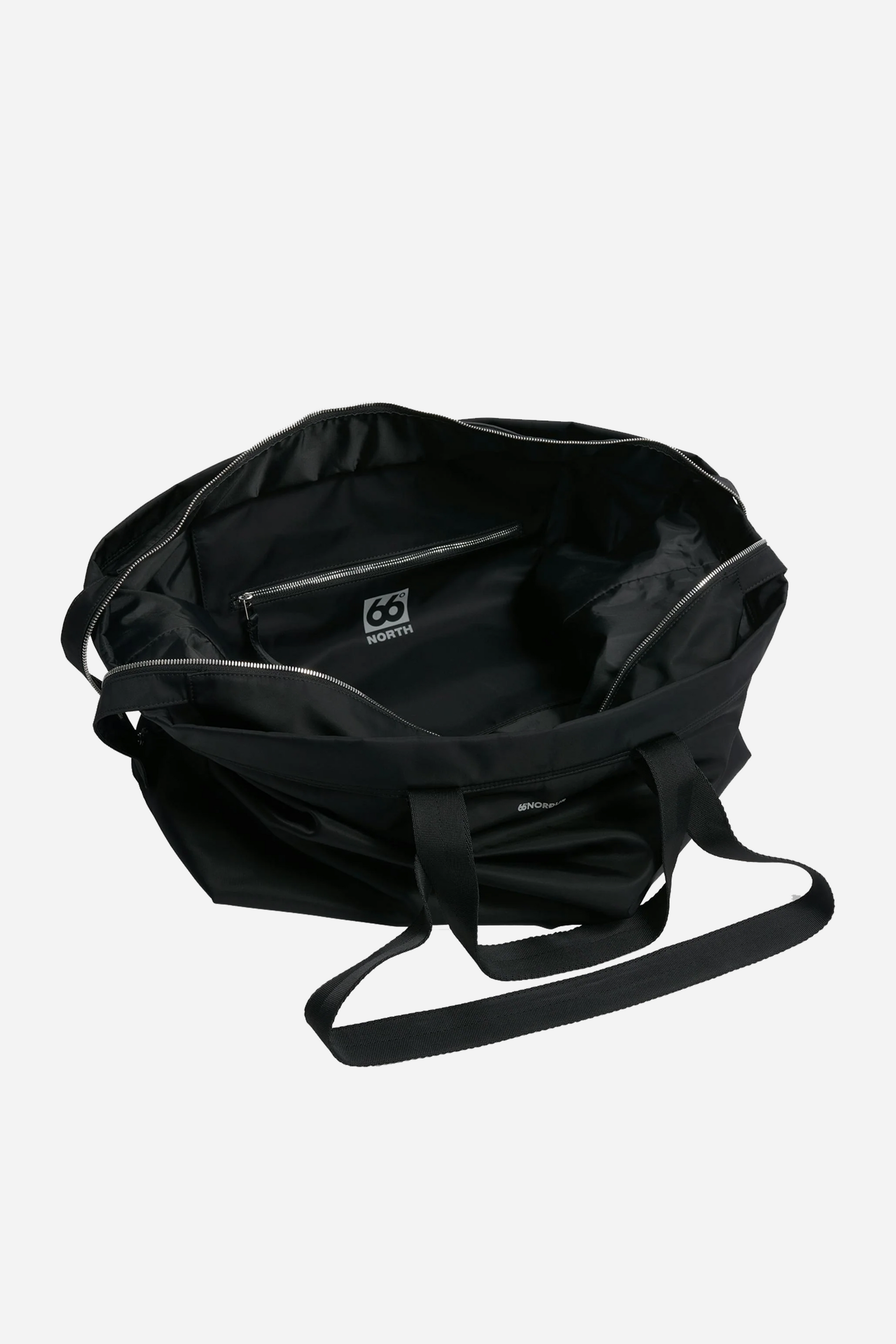 Hringbraut Tote Bag Black fra 66°North. Denne taske er fremstillet i genanvendt polyester. Den er designet med et stort rum, og et rum i siden, der lukkes med lynlås. Taskens størrelse kan justeres i siderne, har et håndtag og skulderstropper, og med lukkes med lynlås i toppen. Tasken har et 66°North logo fortil og indvendigt.