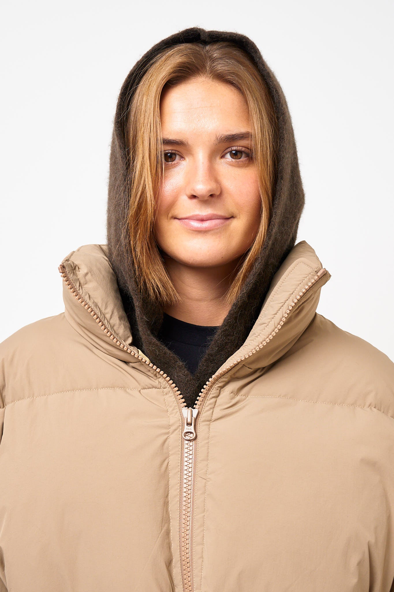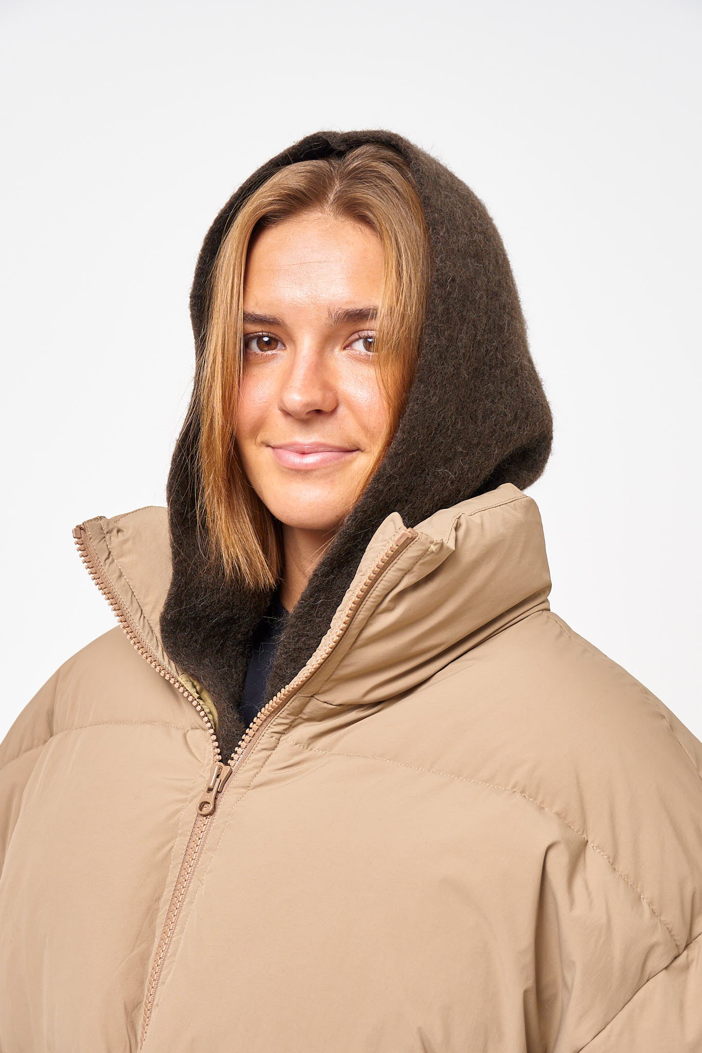 Vitow Beanie Coffee Melange fra American Vintage. Denne hue er fremstillet i en uld bladning. Den er designet med en hætte, og et for og bagstykke.