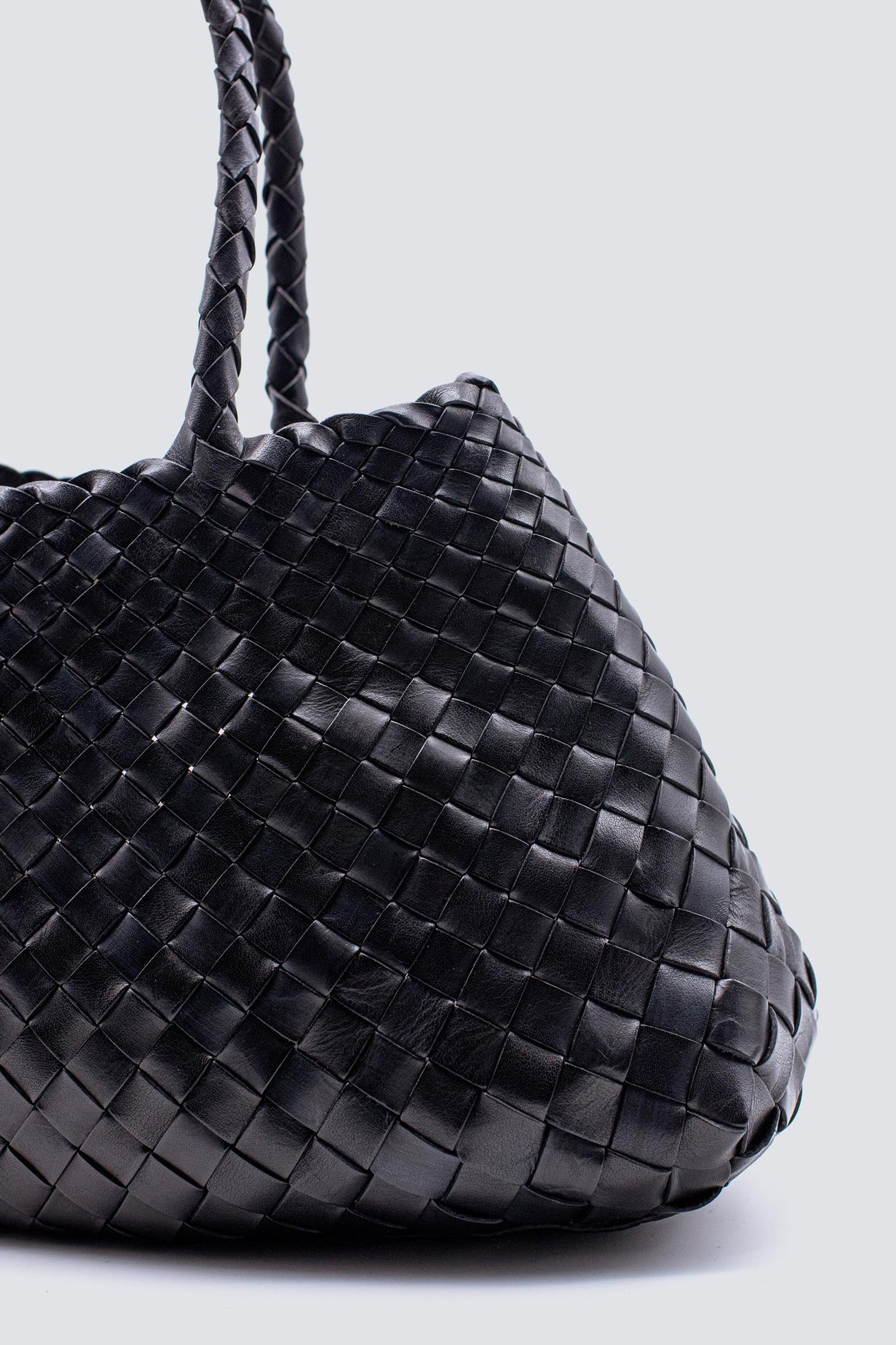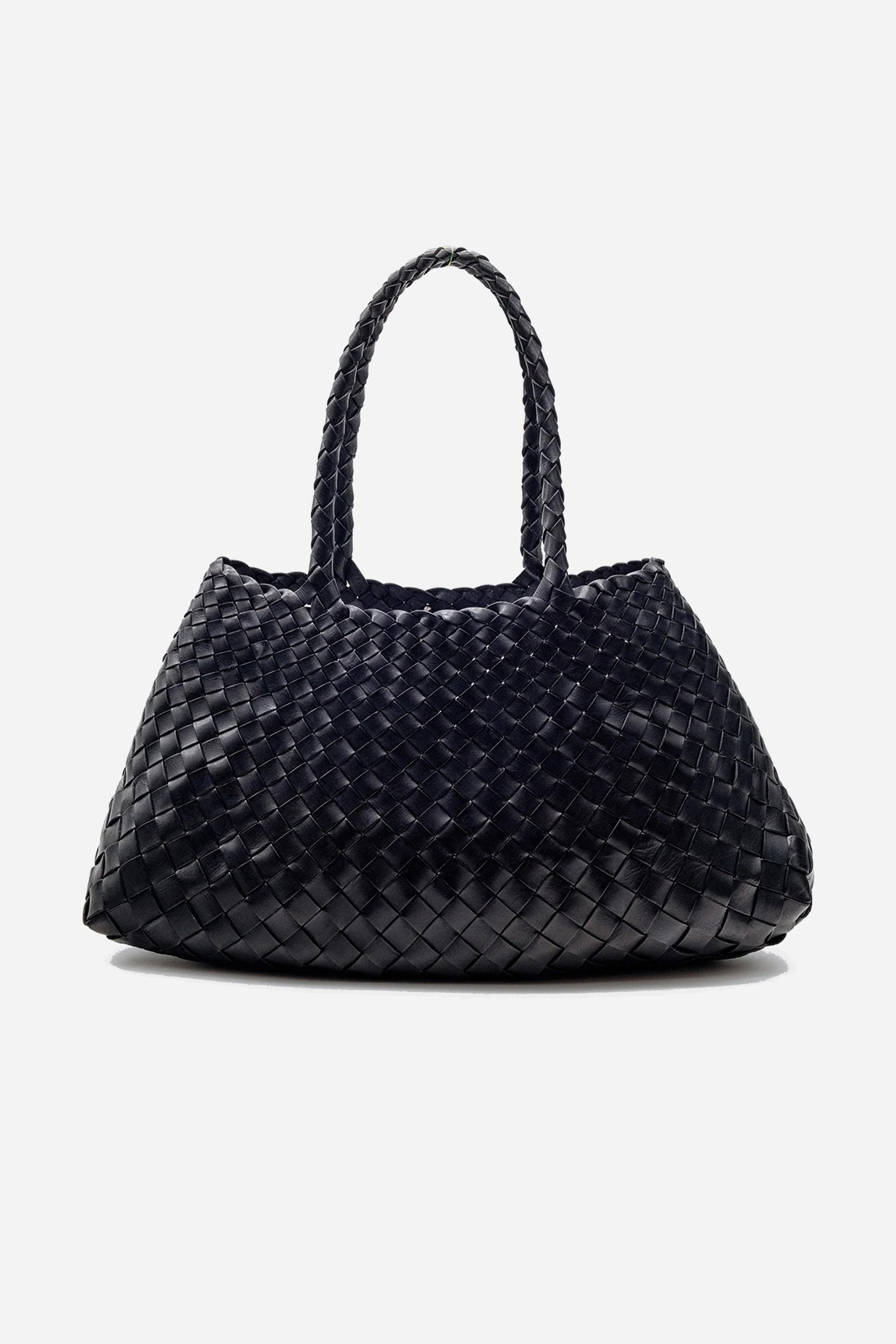 Santa Croce Bag Big Black fra Dragon Diffusion. Denne taske er håndlavet i Indien og er designet i flettet læder. Tasken har et stort indvendigt rum, et vedhæng og to stropper.