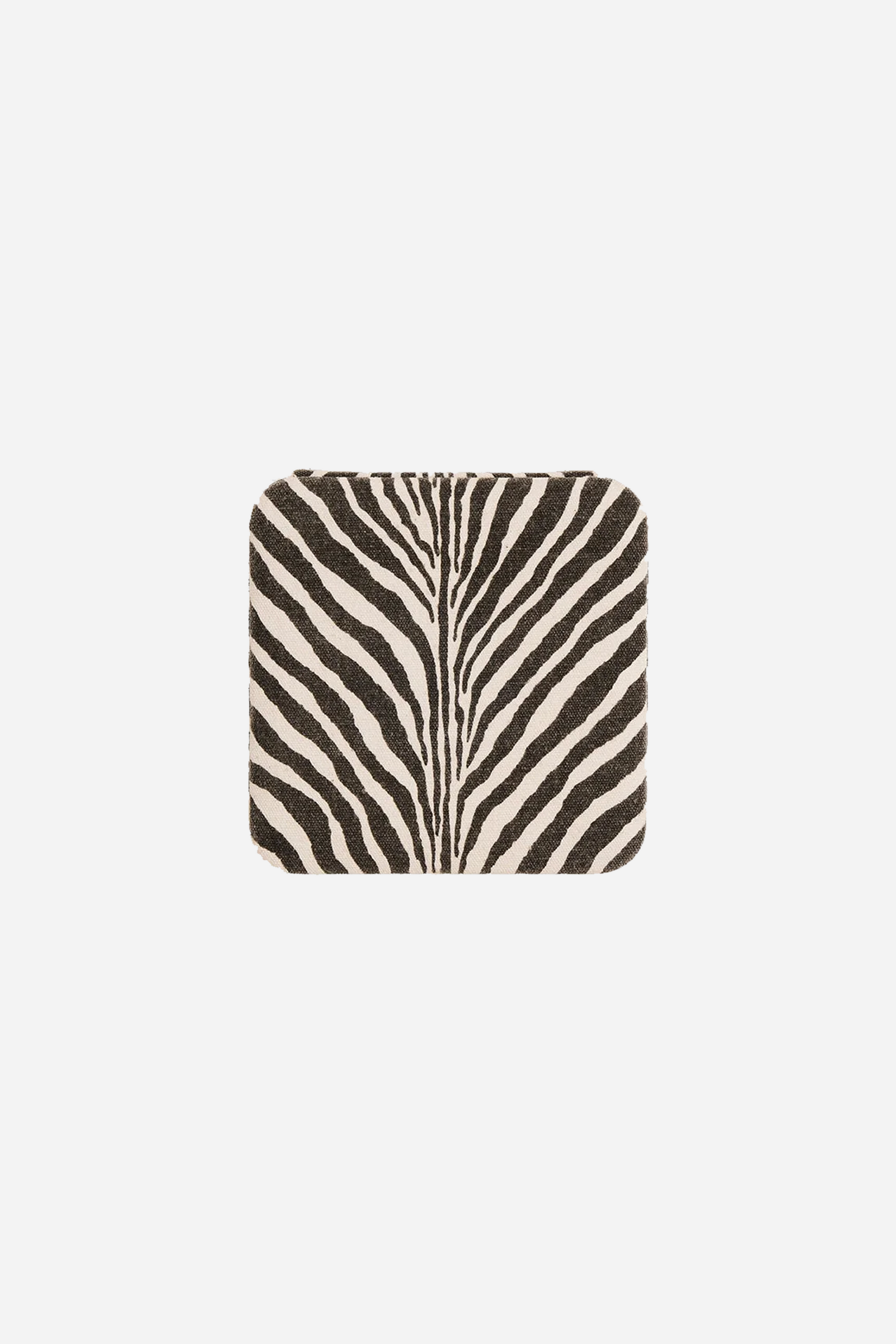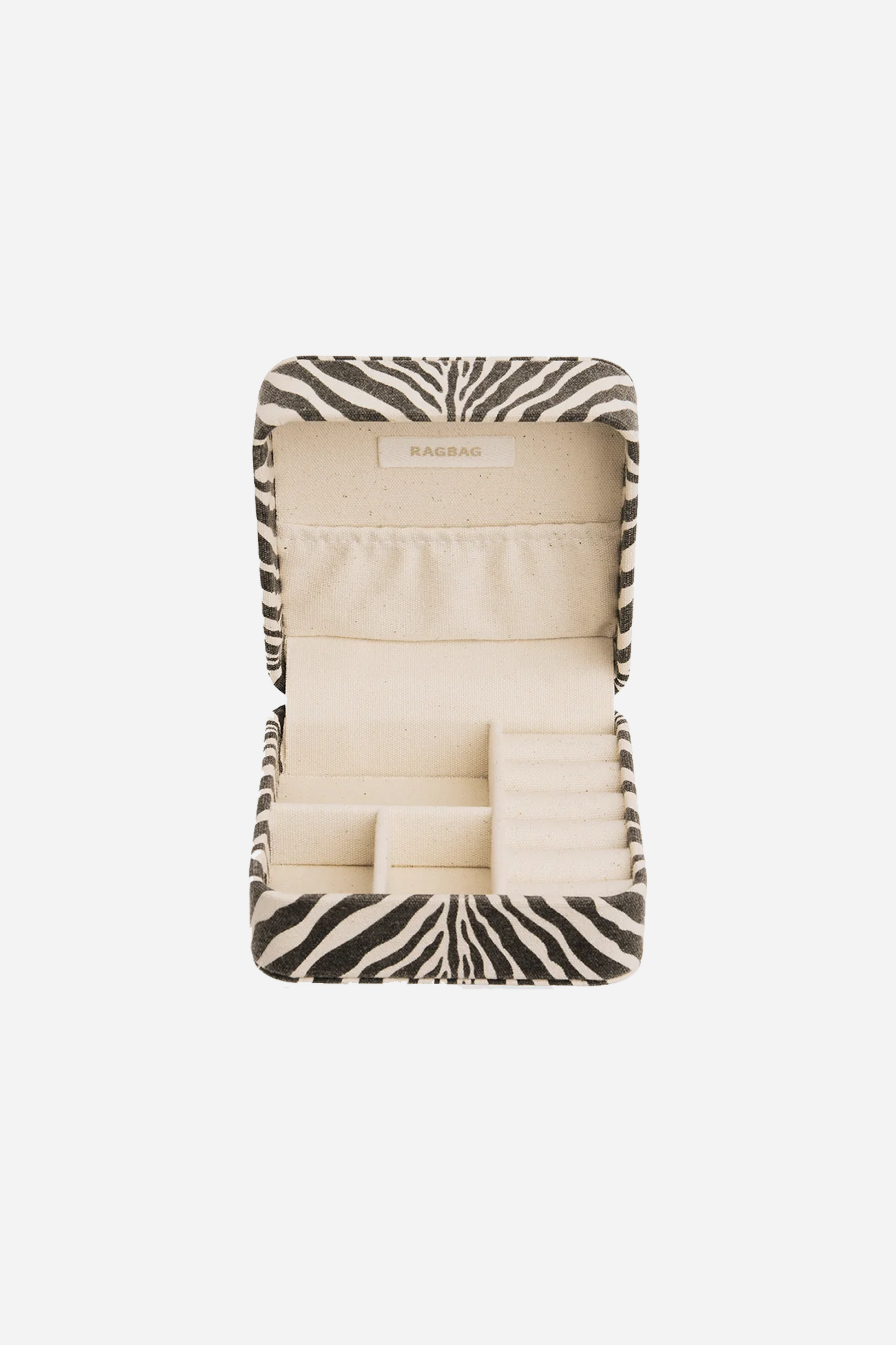 Jewelry Travel Box Zebra fra RAGBAG. Dette smykkeskrin er fremstillet i bomuld. Smykkeskrinet er designet med fire opdelte rum, og har indvendigt lomme i toppen med et RAGBAG logo.