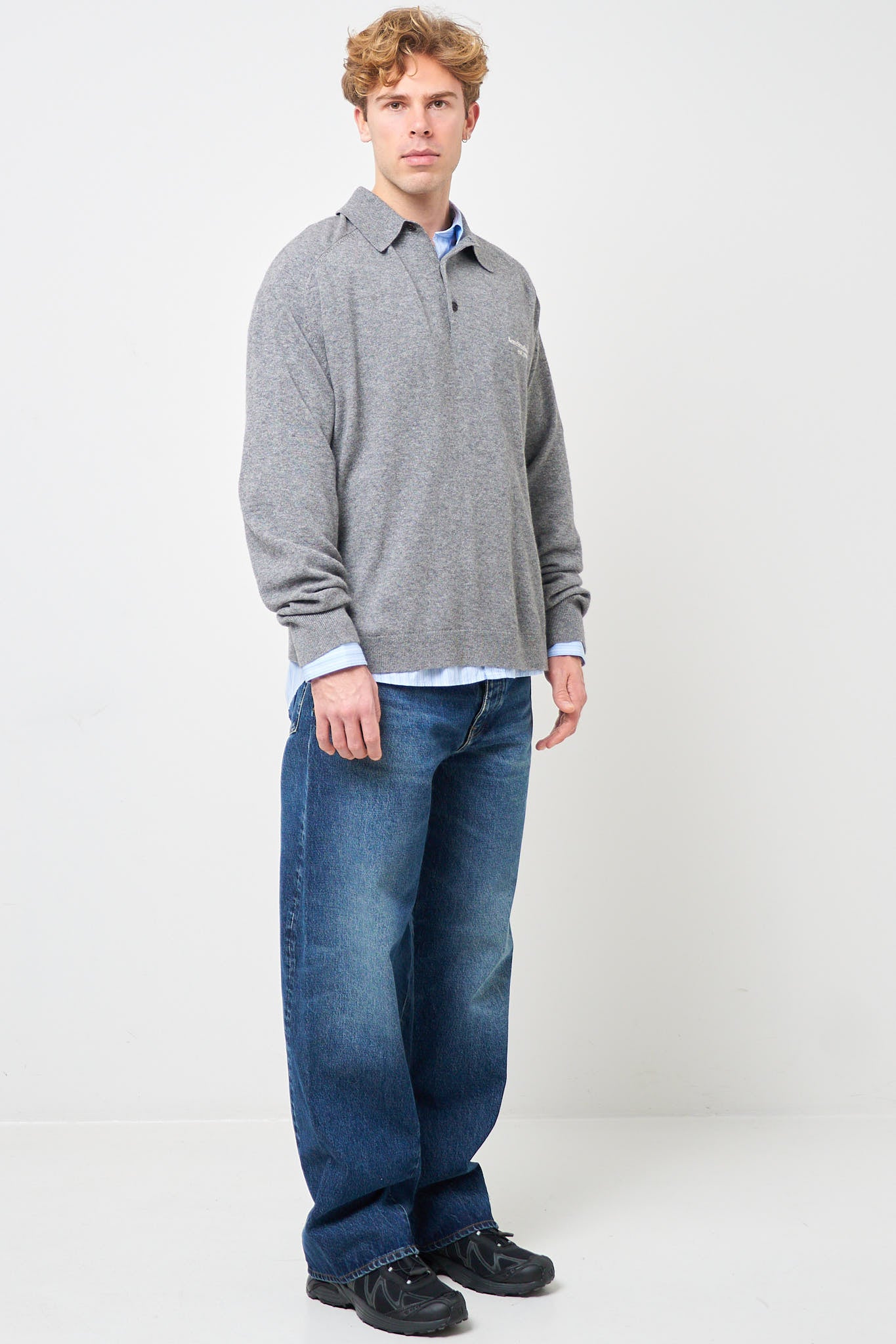 1996' Wool Polo Dark Grey fra Acne Studios. Denne strik er fremstillet i en yakuldsblanding. Den har en oversized pasform med lange ærmer i rib, knapper i halsen og en bred krave. Strikken har et Acne Studios logo på brystet.