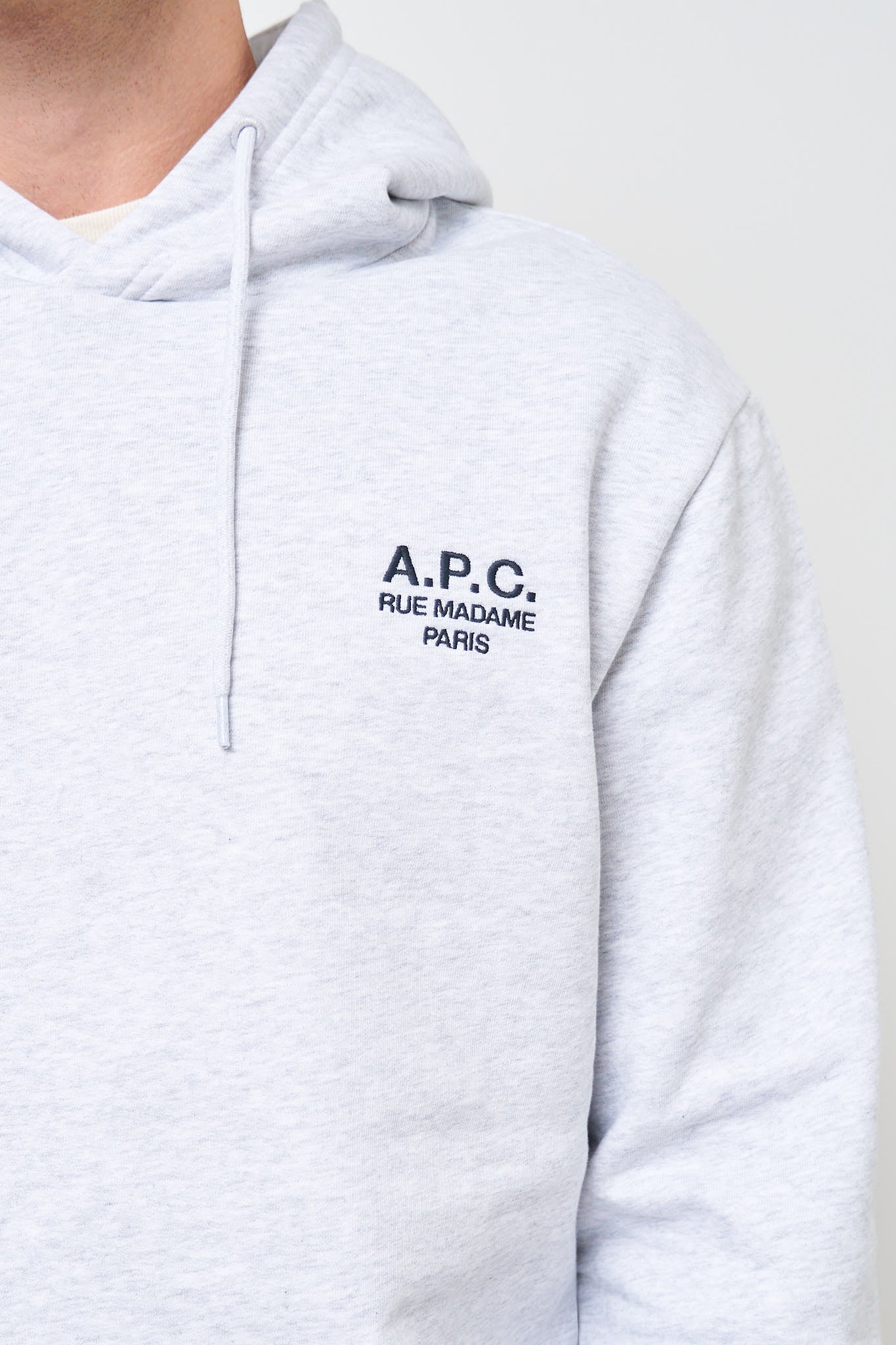 Standard Rue Madame Hoodie Gris Chine/Noir fra A.P.C. Denne hættetrøje er fremstillet i bomuld. Den er designet i en normal pasform, med rib i manchetten og forneden og hætte med snørrer. Hættetrøjen har et broderet A.P.C. logo på venstre bryst.