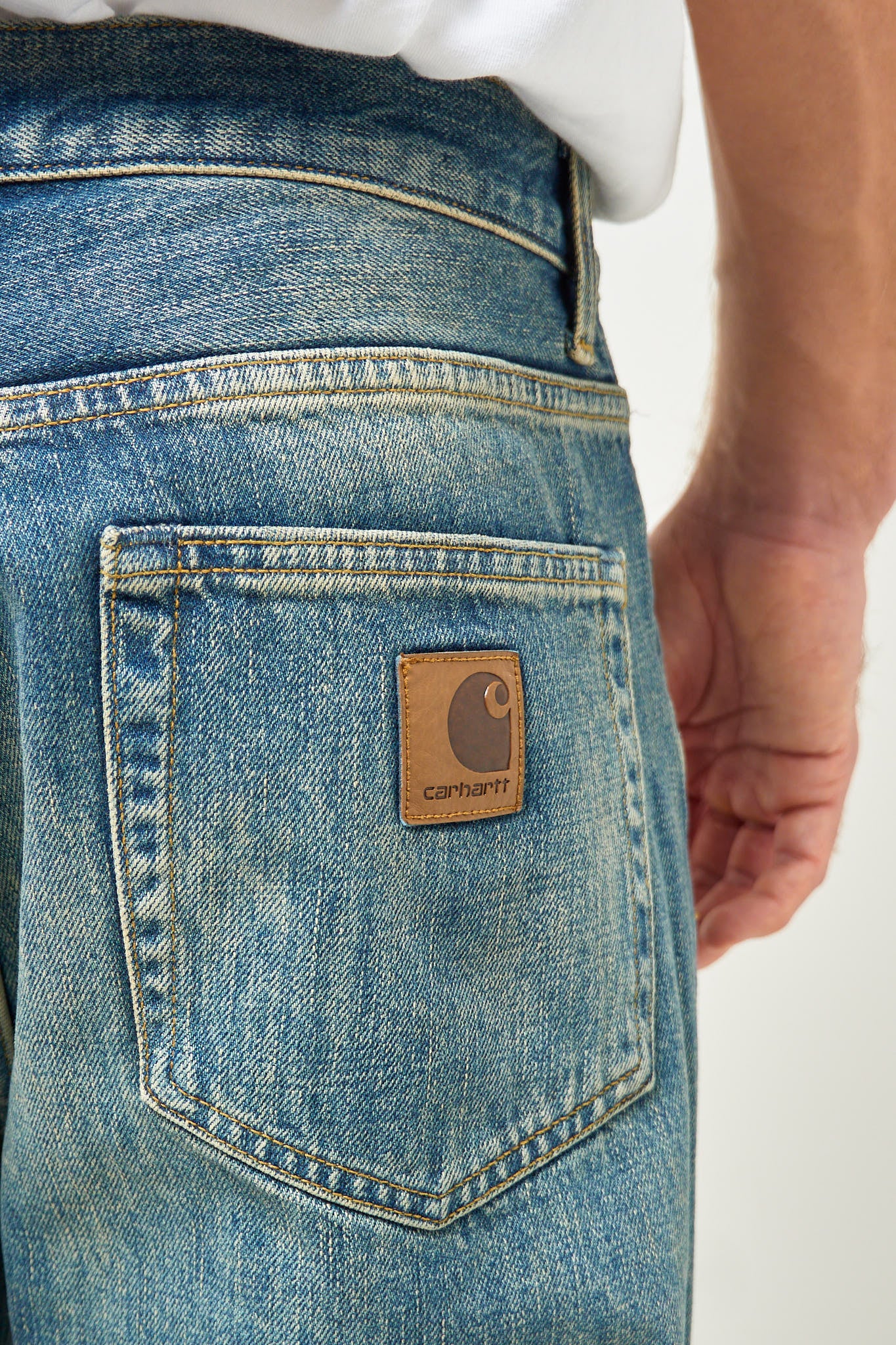 Aaron Pant Camaro Blue Worn fra Carhartt WIP. Disse jeans er fremstillet i en rå denim. De er designet i en normal, ligebenet pasform med 5 lommer og bæltestropper. Disse jeans lukkes med lynlås og knap fortil, og har et Carhartt WIP logo påsyet på højre baglomme.