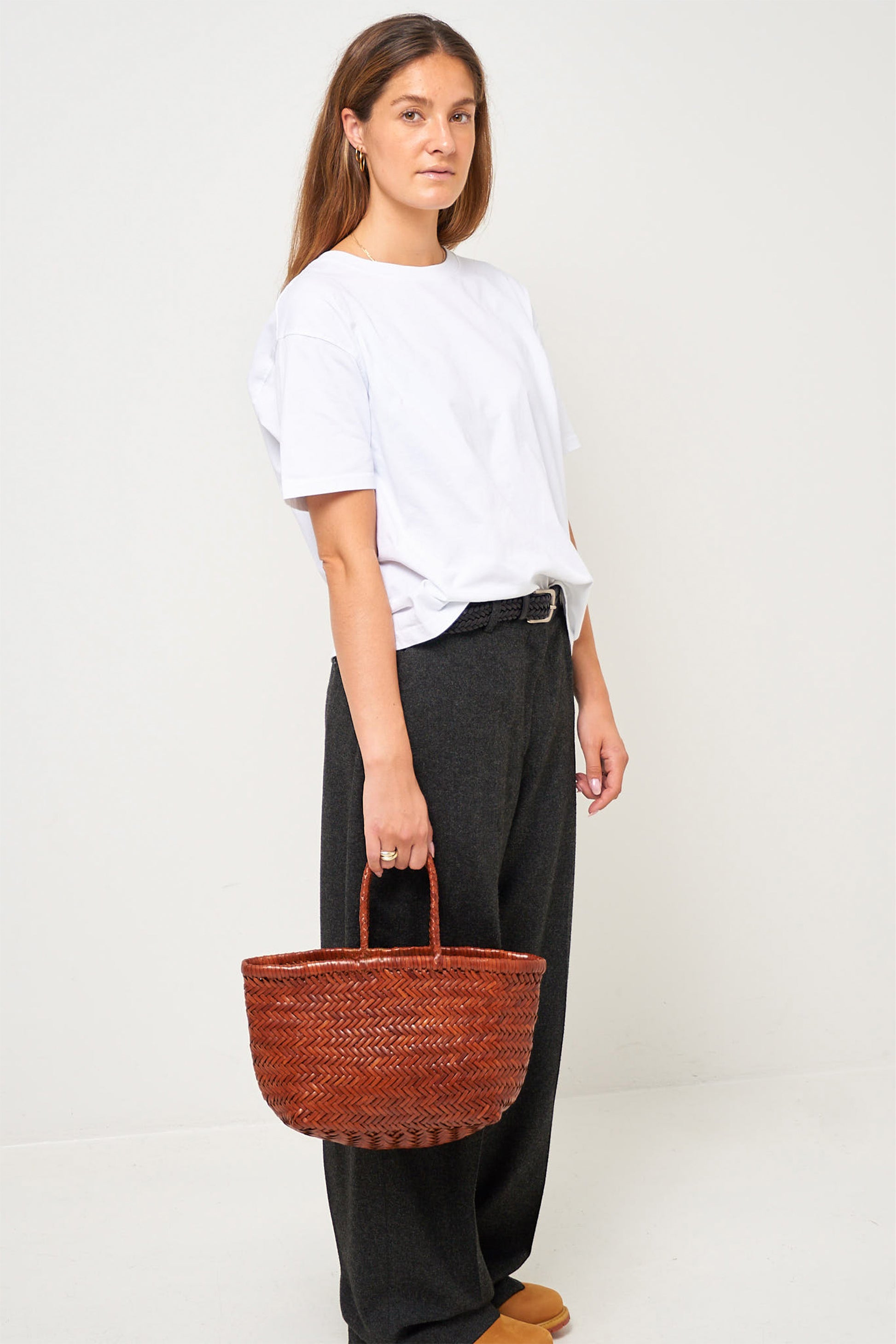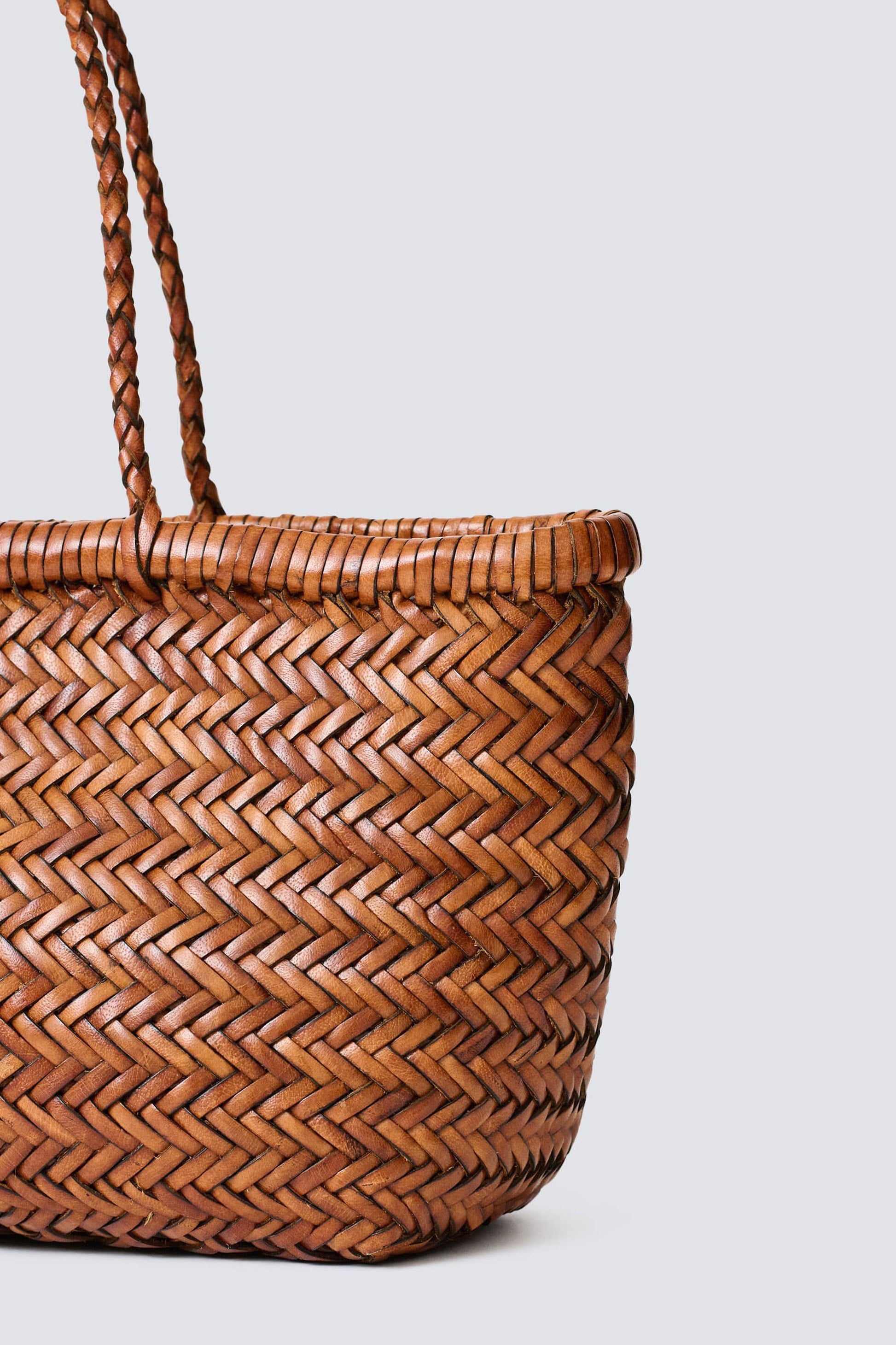 Bamboo Triple Jump Small Tan fra Dragon Diffusion. Denne taske er håndlavet i Indien og er designet i flettet læder. Tasken har et stort indvendigt rum, et vedhæng og to stropper.