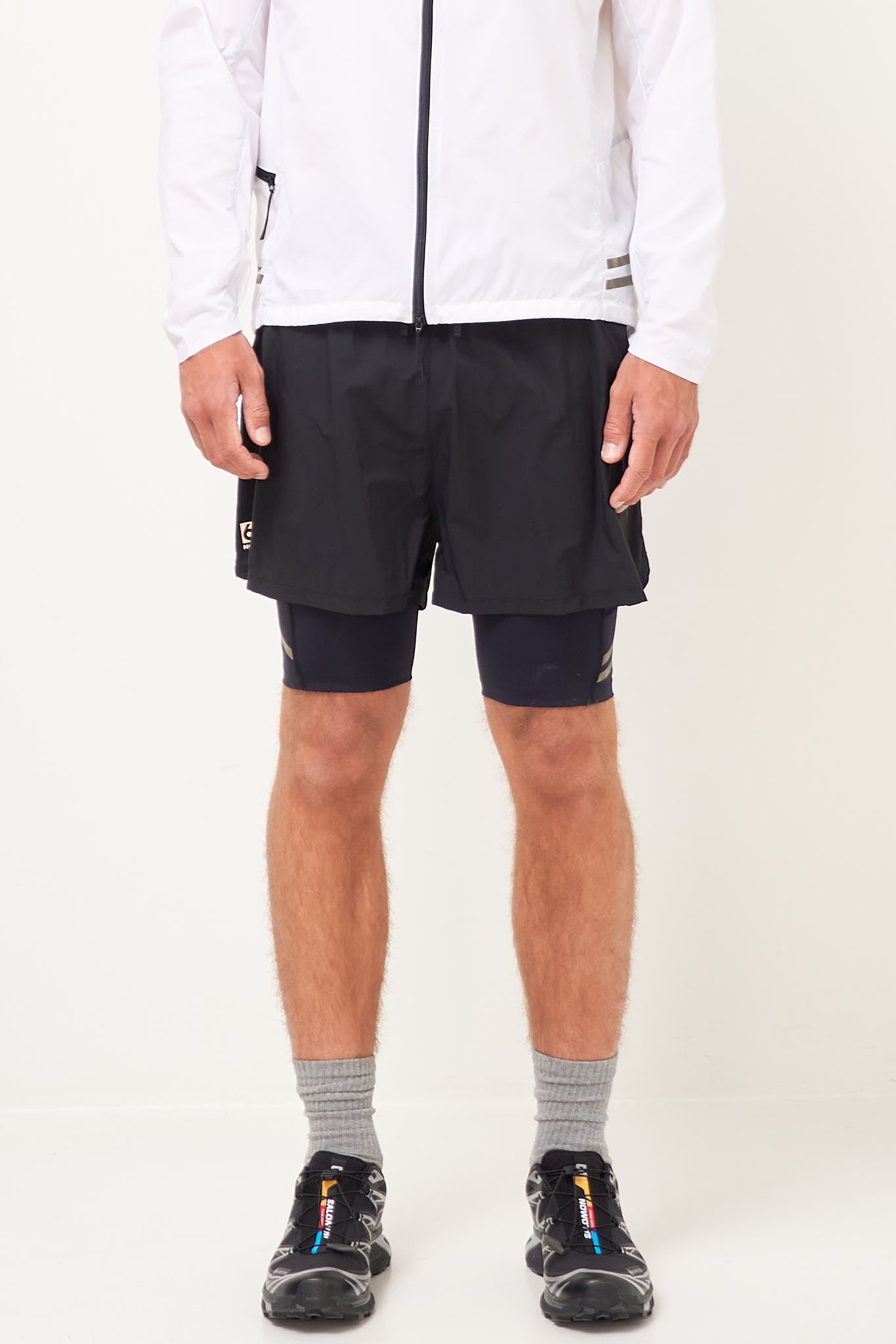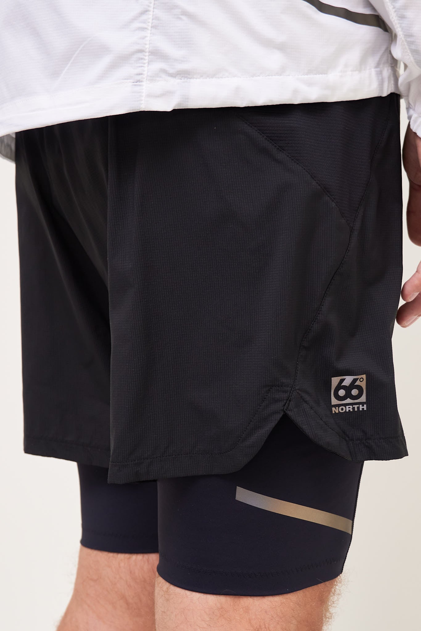 Helgafell Shorts Black fra 66°North. Disse shorts er fremstillet i en let polyamidblanding. De har en normal pasform med en mellemhøj talje og et bredt elastik i kanten med indbyggede lommer i mesh. Shortsene har et udvendigt skært for- og bagtil med et 66°North logo på og reflekser i siderne. Disse shorts strammes med snøre.