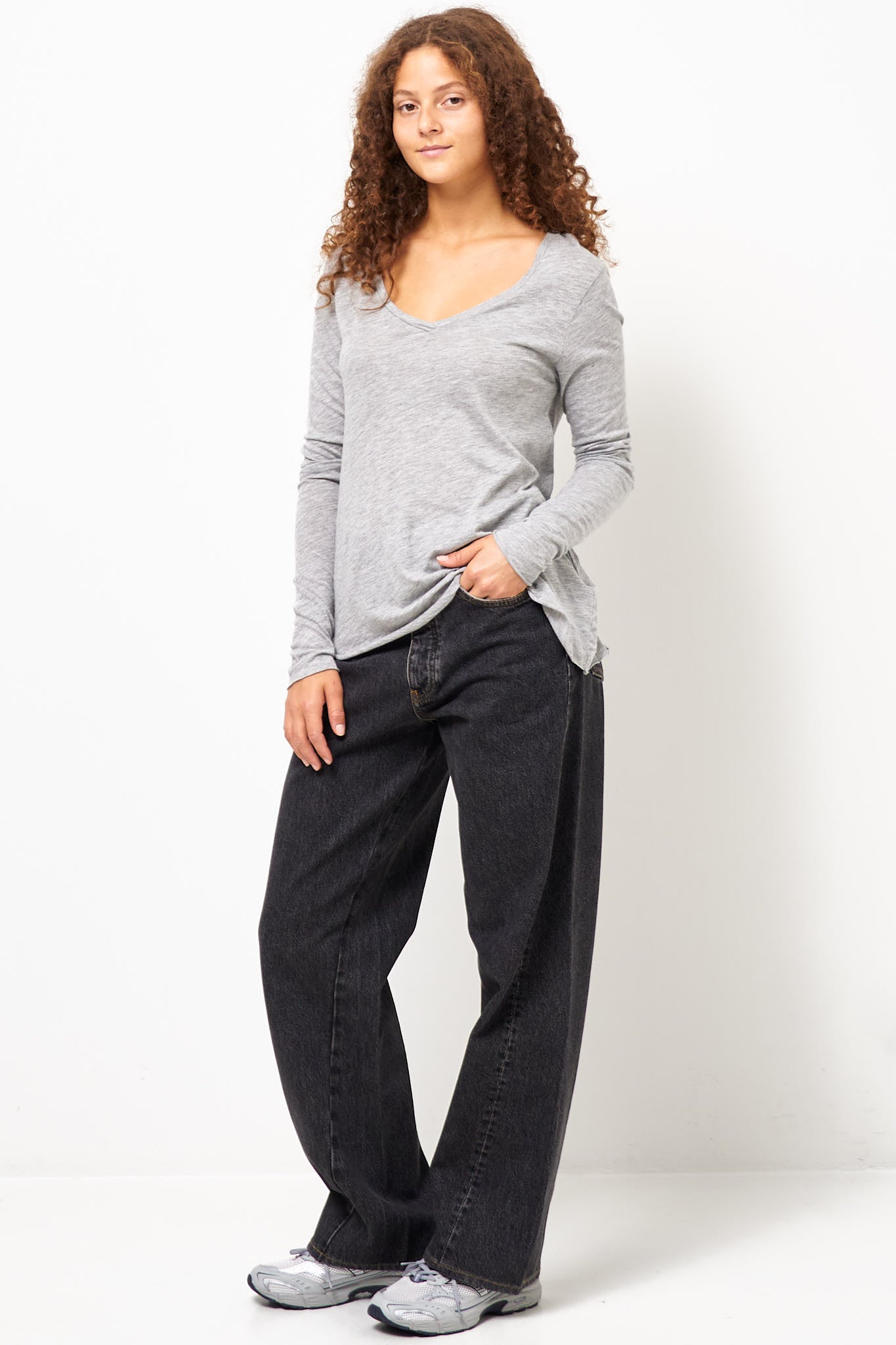 Jacksonville V-neck LS T-shirt Heather Grey fra American Vintage. Denne top er fremstillet i en bomulds blanding. Den er designet med en dyb V-halsudskæring, lange ærmer og har en normal pasform.