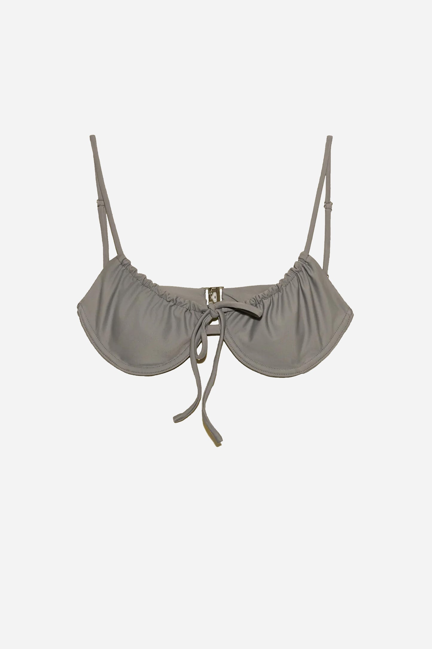 Kim Top Grey fra Bare Stockholm. Bikini toppen er fremstillet i ECONYL®. Materialet er ekstra modstandsdygtigt over for klor, solcreme og olie. Den har et klassisk balconette-snit med justerbare stropper, bindebånd foran og en Indsyet bøjle.
