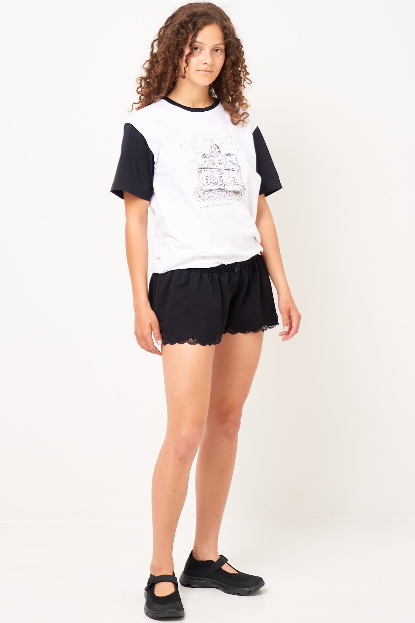 Lace Sweat Shorts Black fra gabi gamél. Disse shorts er fremstillet i en kraftig bomuld og produceret af deadstock metervare. De har en lavtaljet pasform med elastik i taljen. Disse shorts er designet med to sløjfer fortil, fransk vintage blonde i bunden af benene.