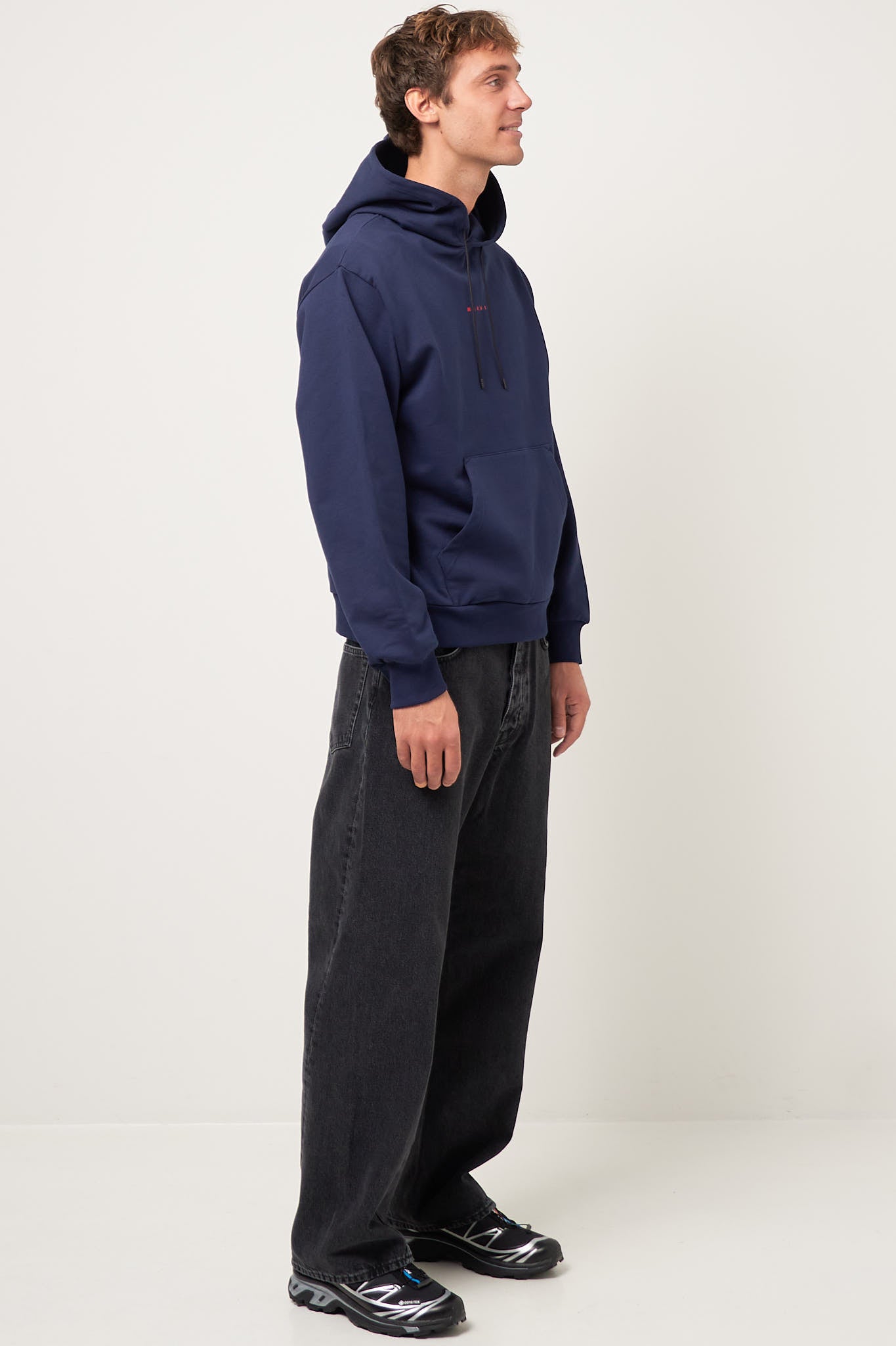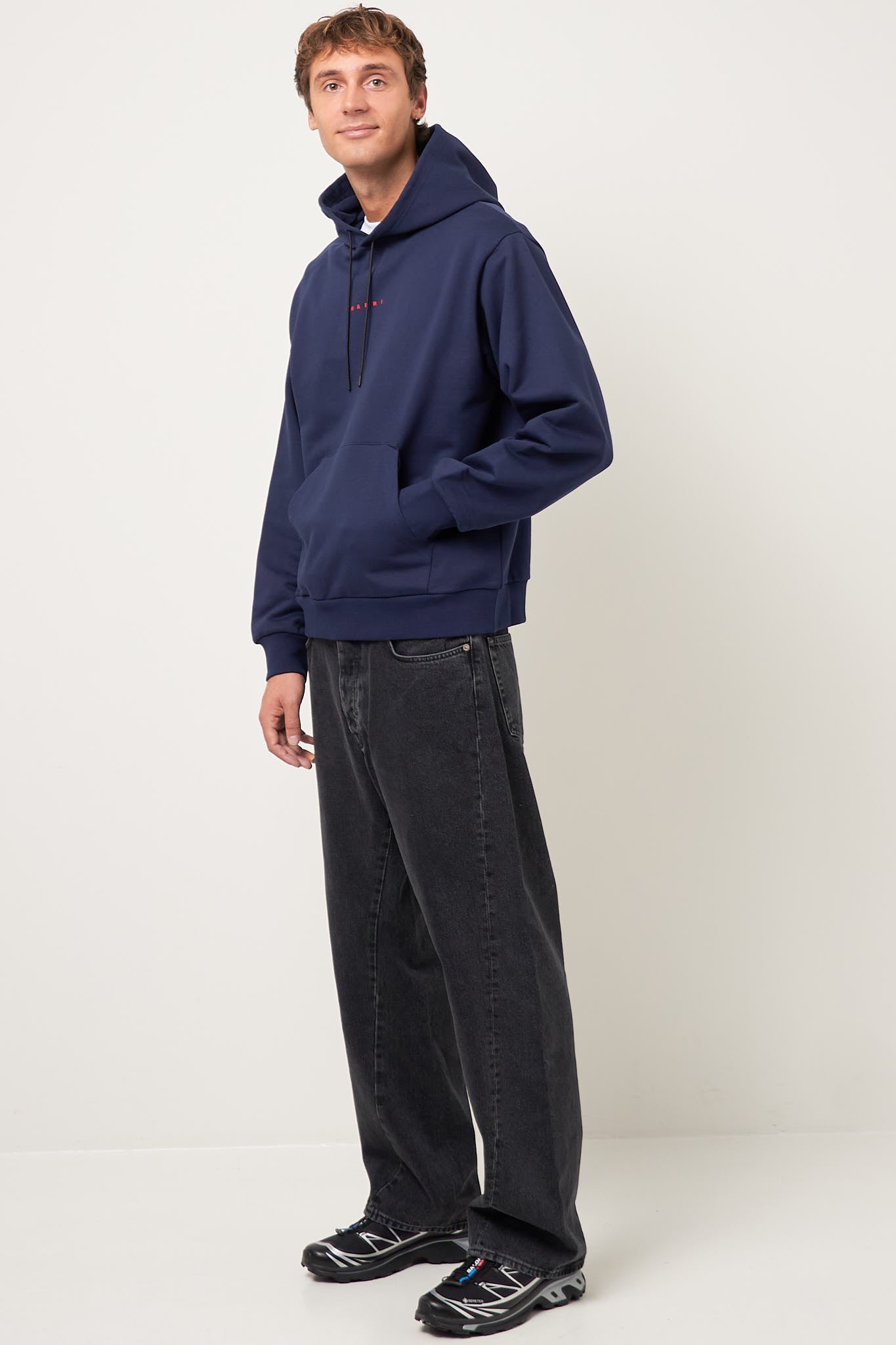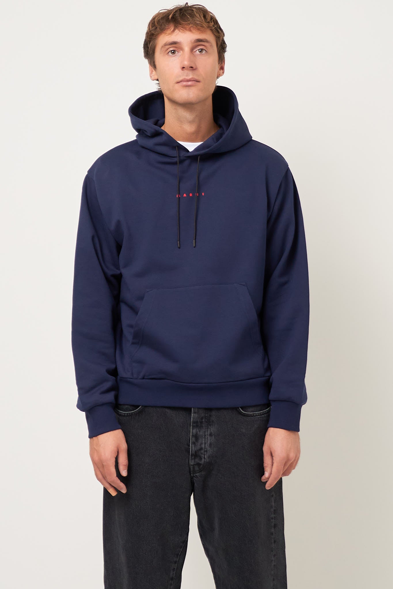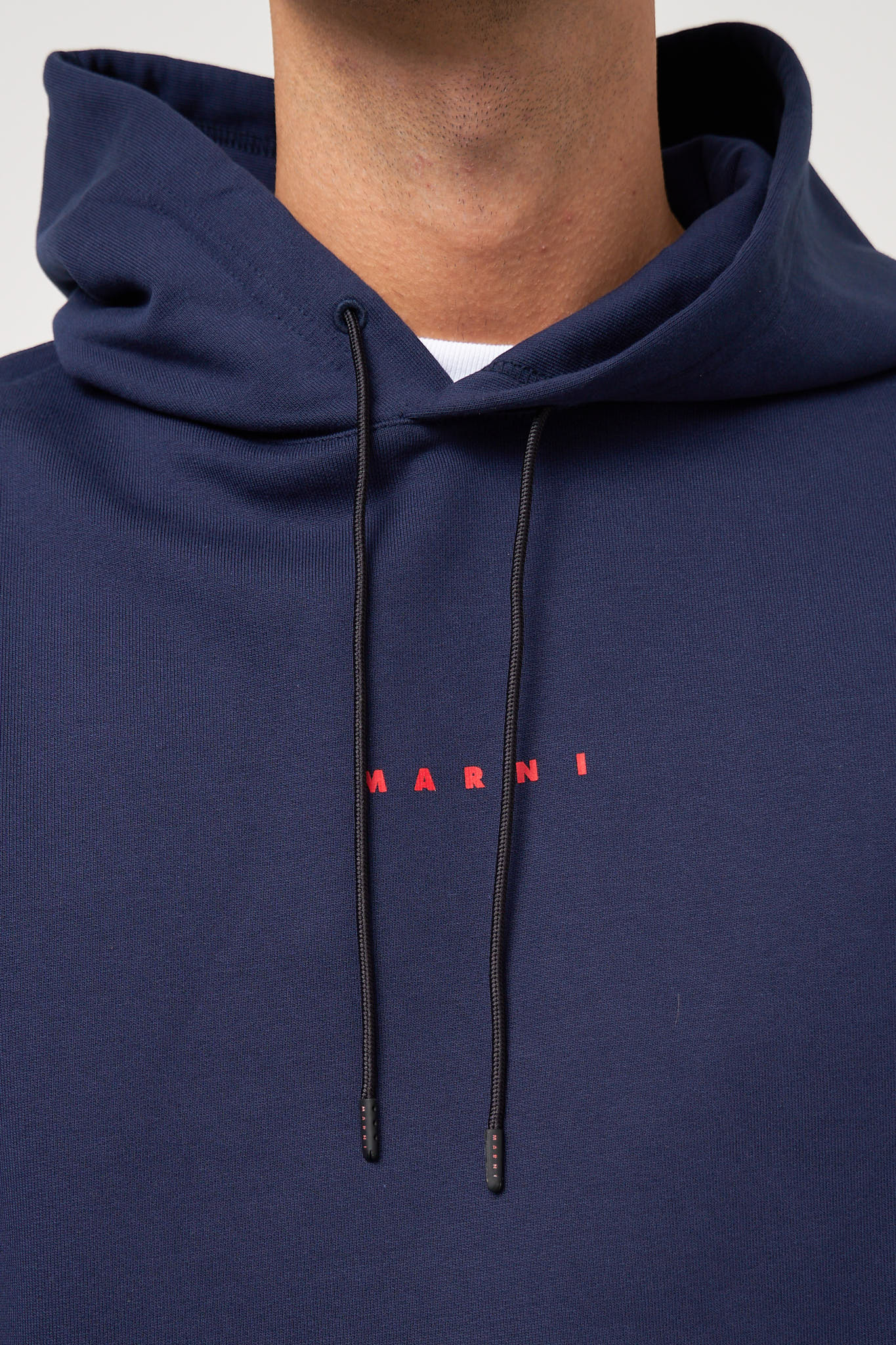 Marni Logo Hoodie Blue Kyanite fra Marni. Denne sweatshirt er fremstillet i bomuld. Den er designet i en afslappet pasform, med rib på ærmerne og forneden, hætte med snørrer, og en lomme fortil. Sweatshirten et Marni logo på fortil.