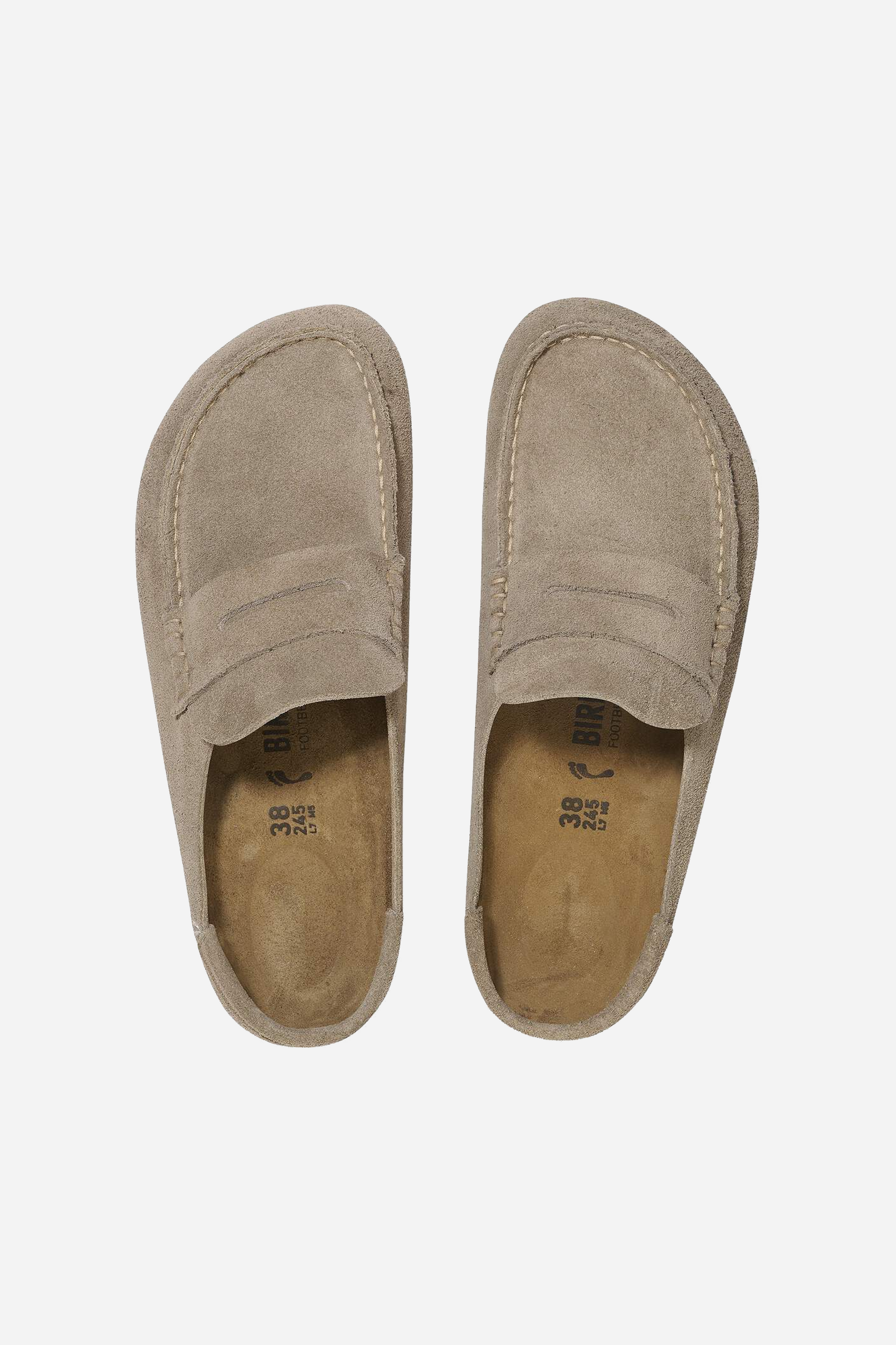 Naples Wrapped Suede Leather Taupe fra Birkenstock. Disse sandaler er fremstillet i Anatomisk formet kork-latex-fodseng der er særligt blød. De er designet med en lukket snude i ruskind.