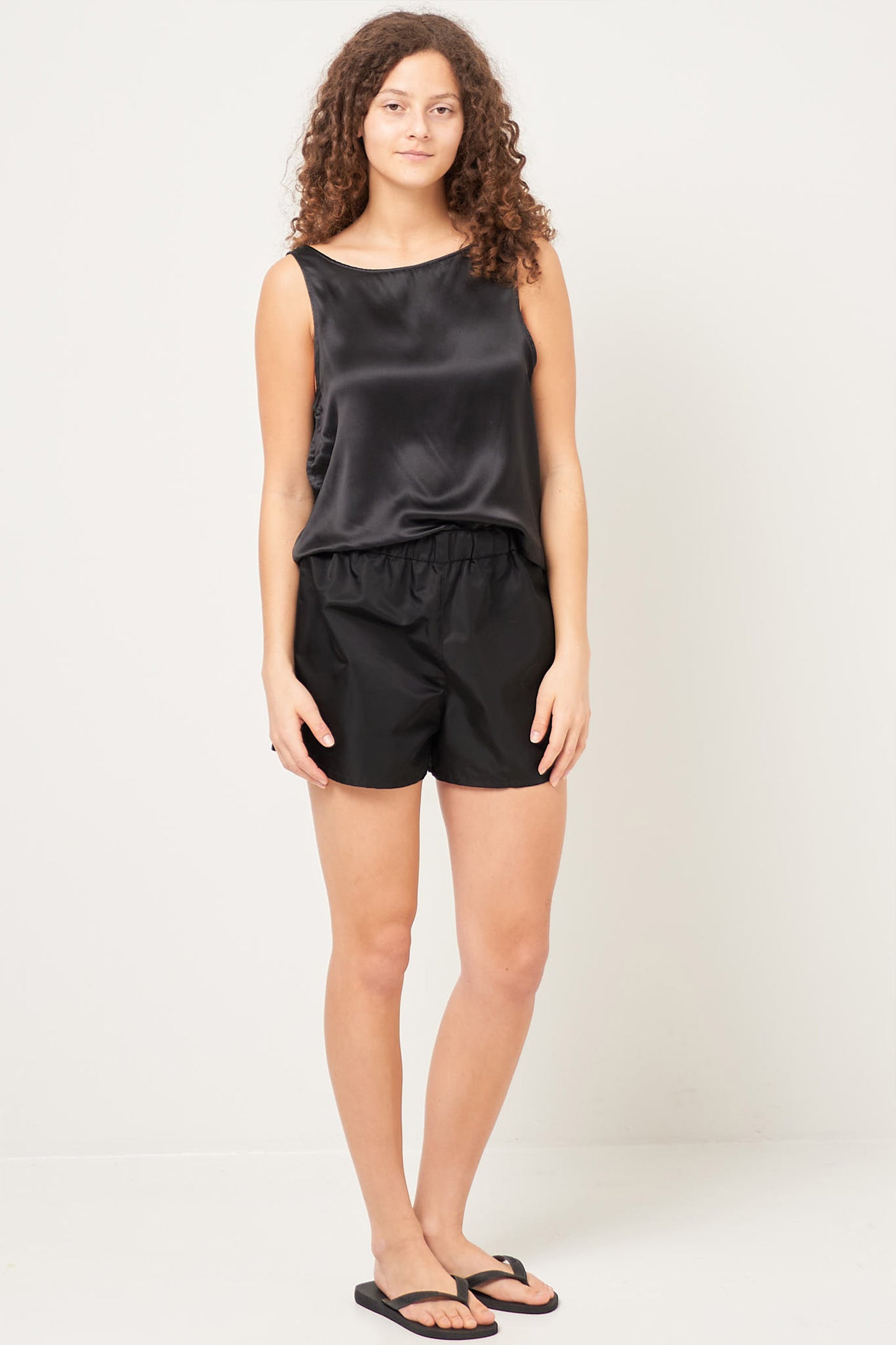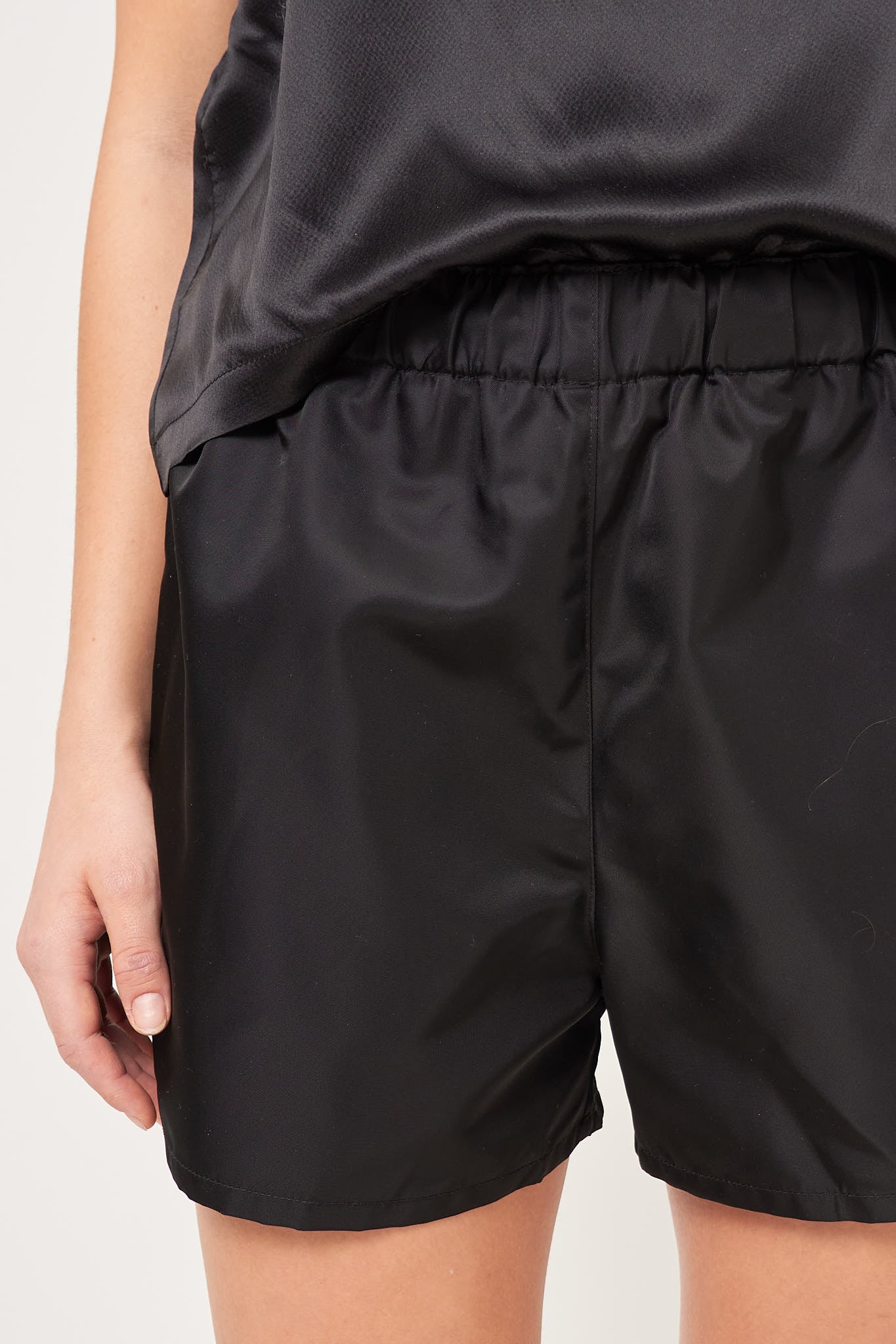 Ada Nylon Shorts Black from STRØM. These shorts are made from a shiny nylon. They are designed in a relaxed fit with an elastic waistband. These shorts are made from deadstock fabric by an internationally recognized fashion house and are available in limited quantities.