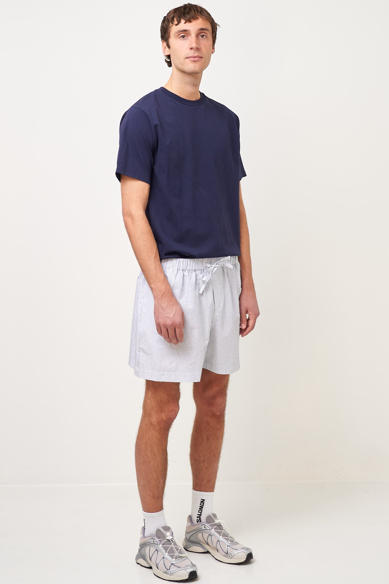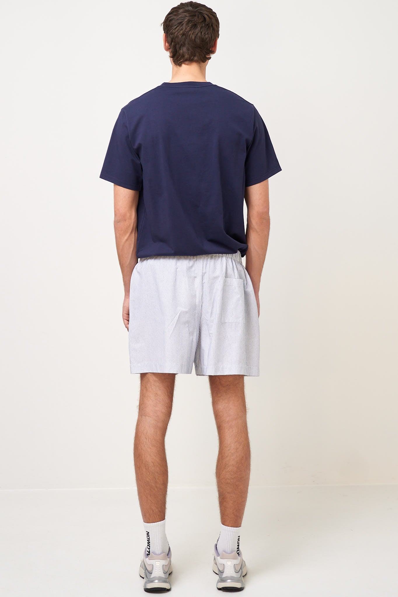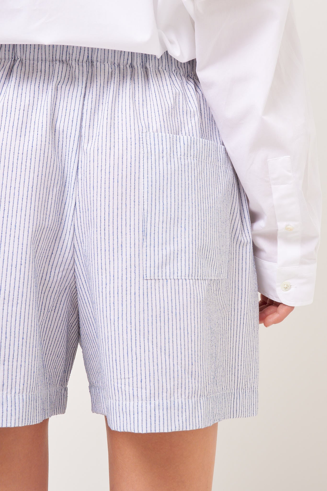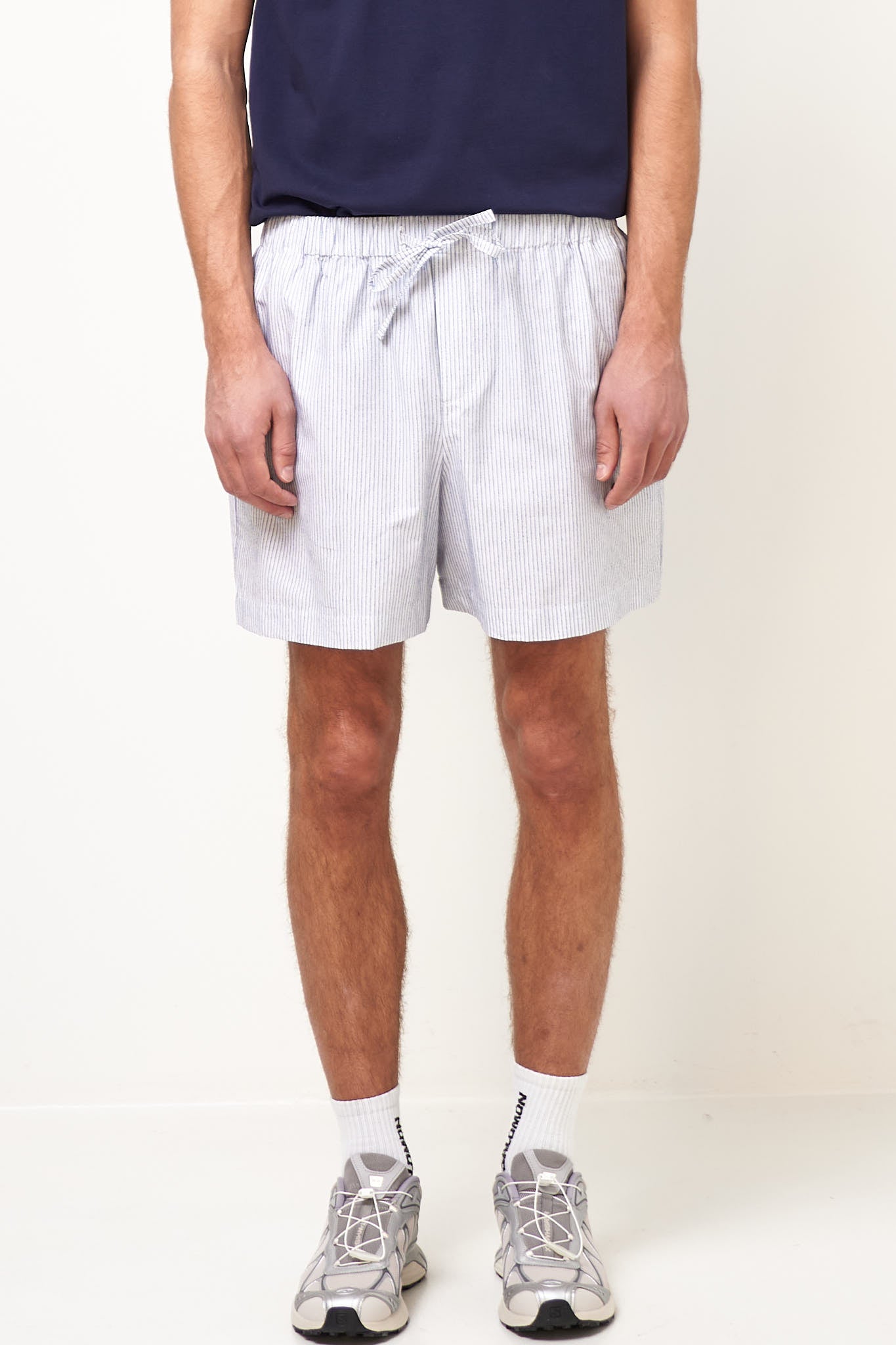 Aga Shorts Blue Stripe from STRØM. These shorts are made of cotton and produced in Italy. The shorts are designed in a unisex fit, with two slant pockets and a back pocket on the right side. These shorts have an elastic waist that is tied with a drawstring.
