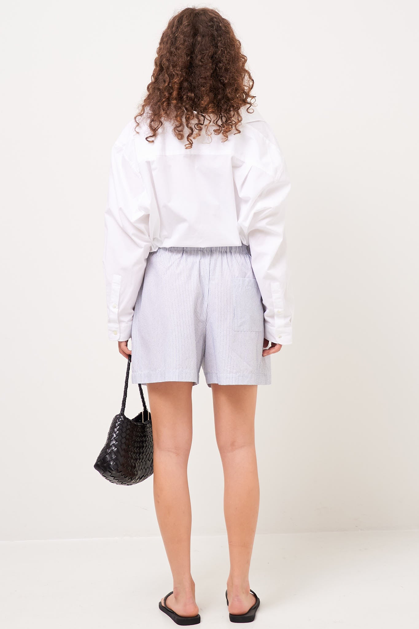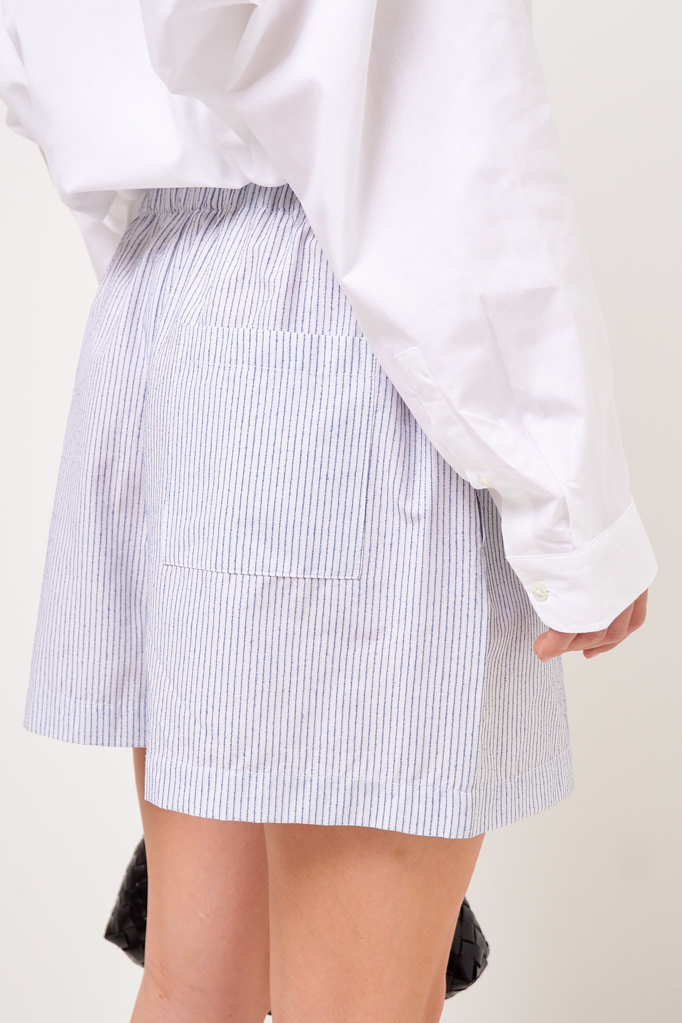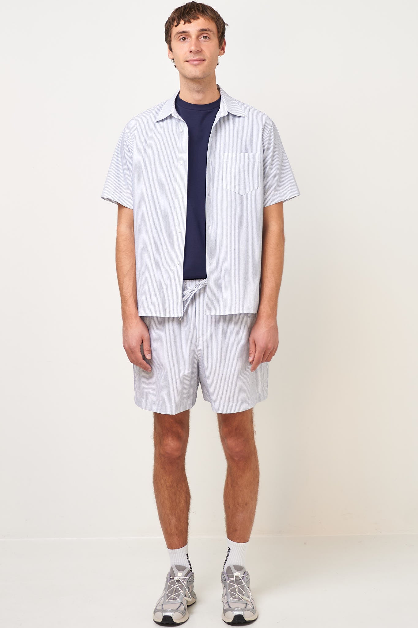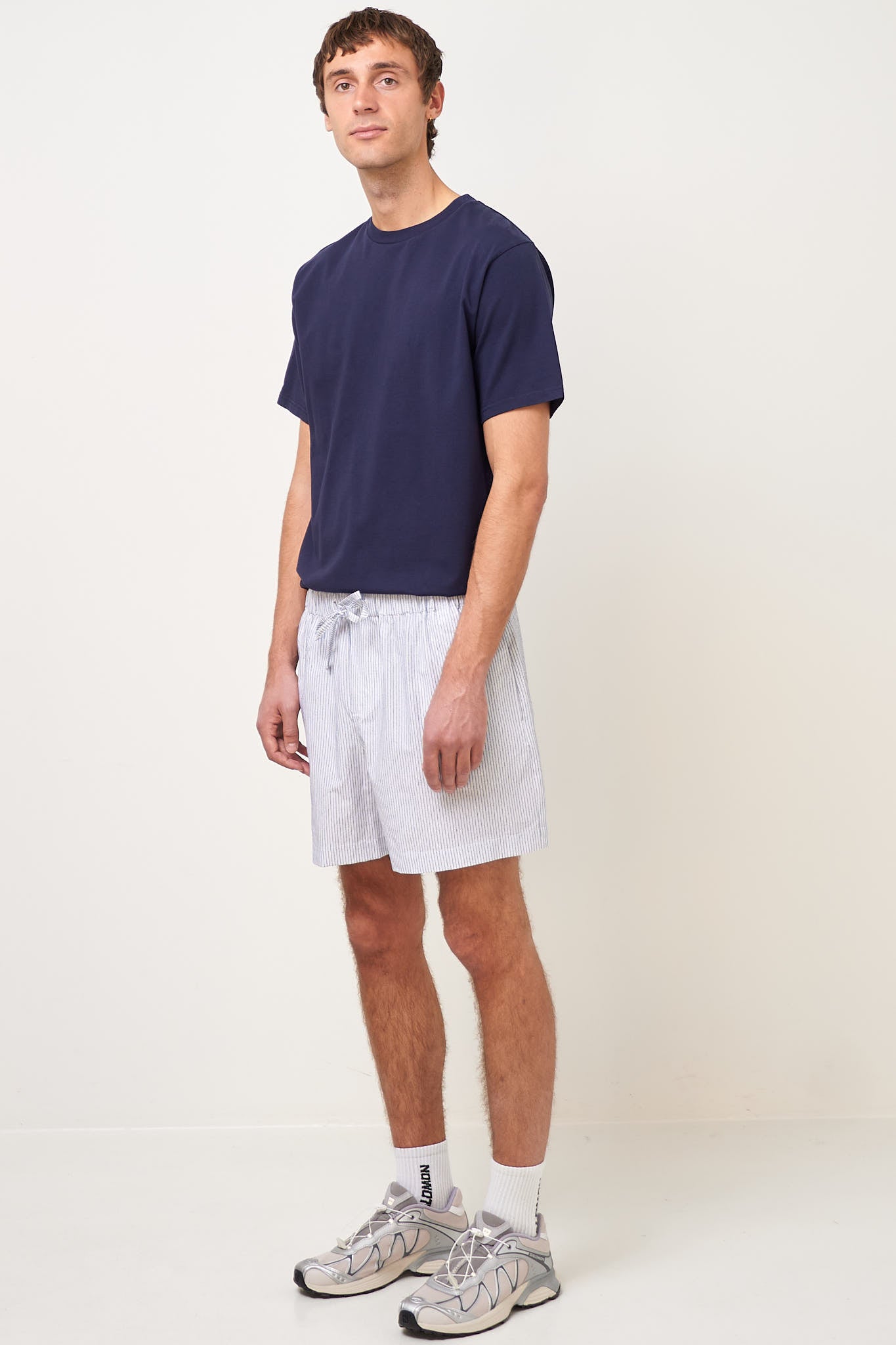 Aga Shorts Blue Stripe from STRØM. These shorts are made of cotton and produced in Italy. The shorts are designed in a unisex fit, with two slant pockets and a back pocket on the right side. These shorts have an elastic waist that is tied with a drawstring.