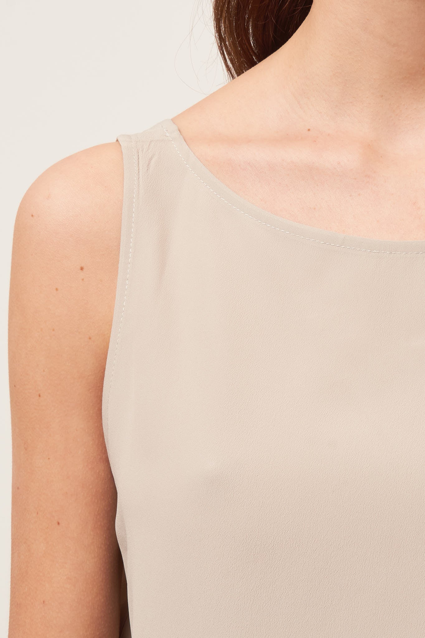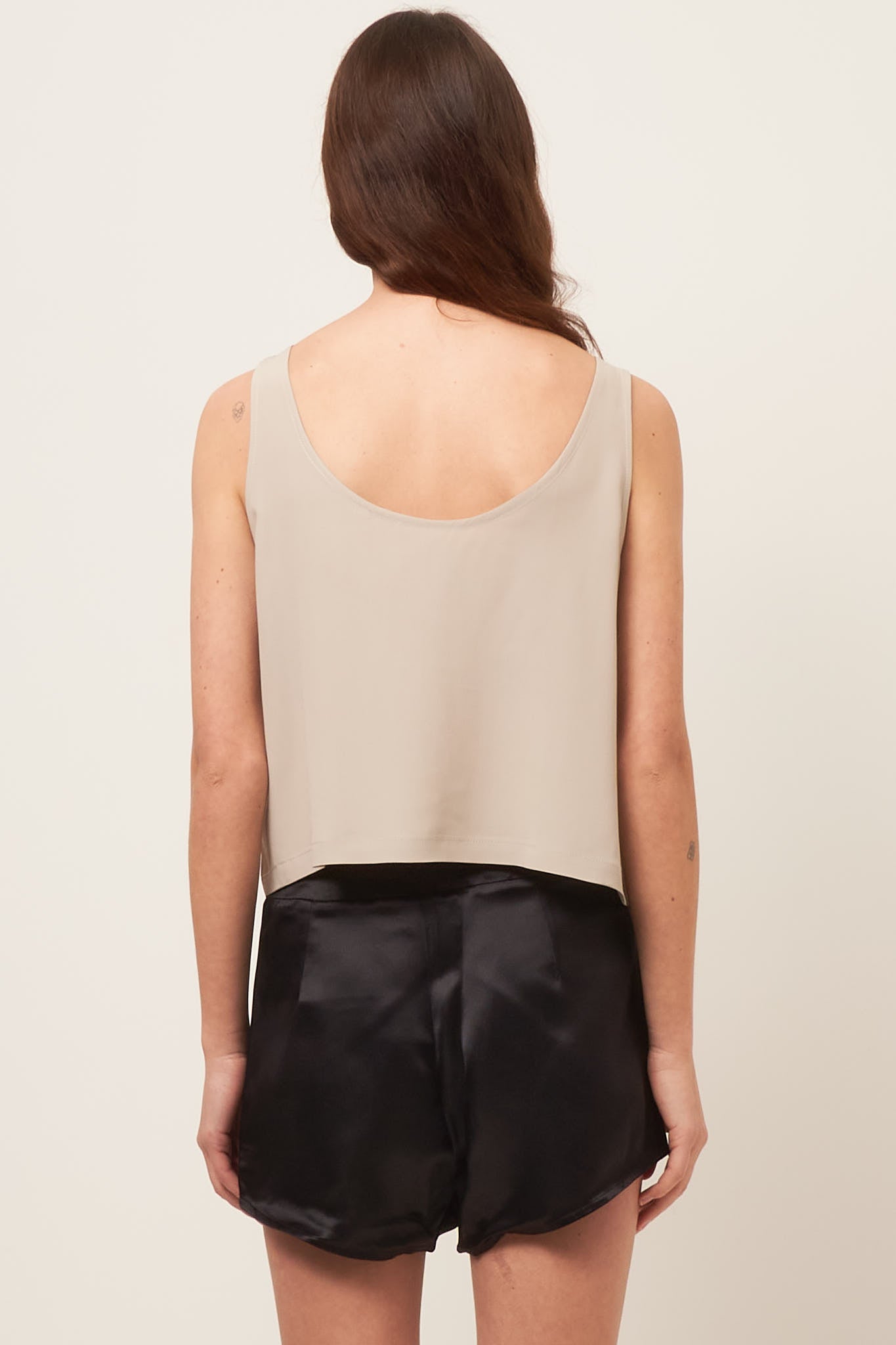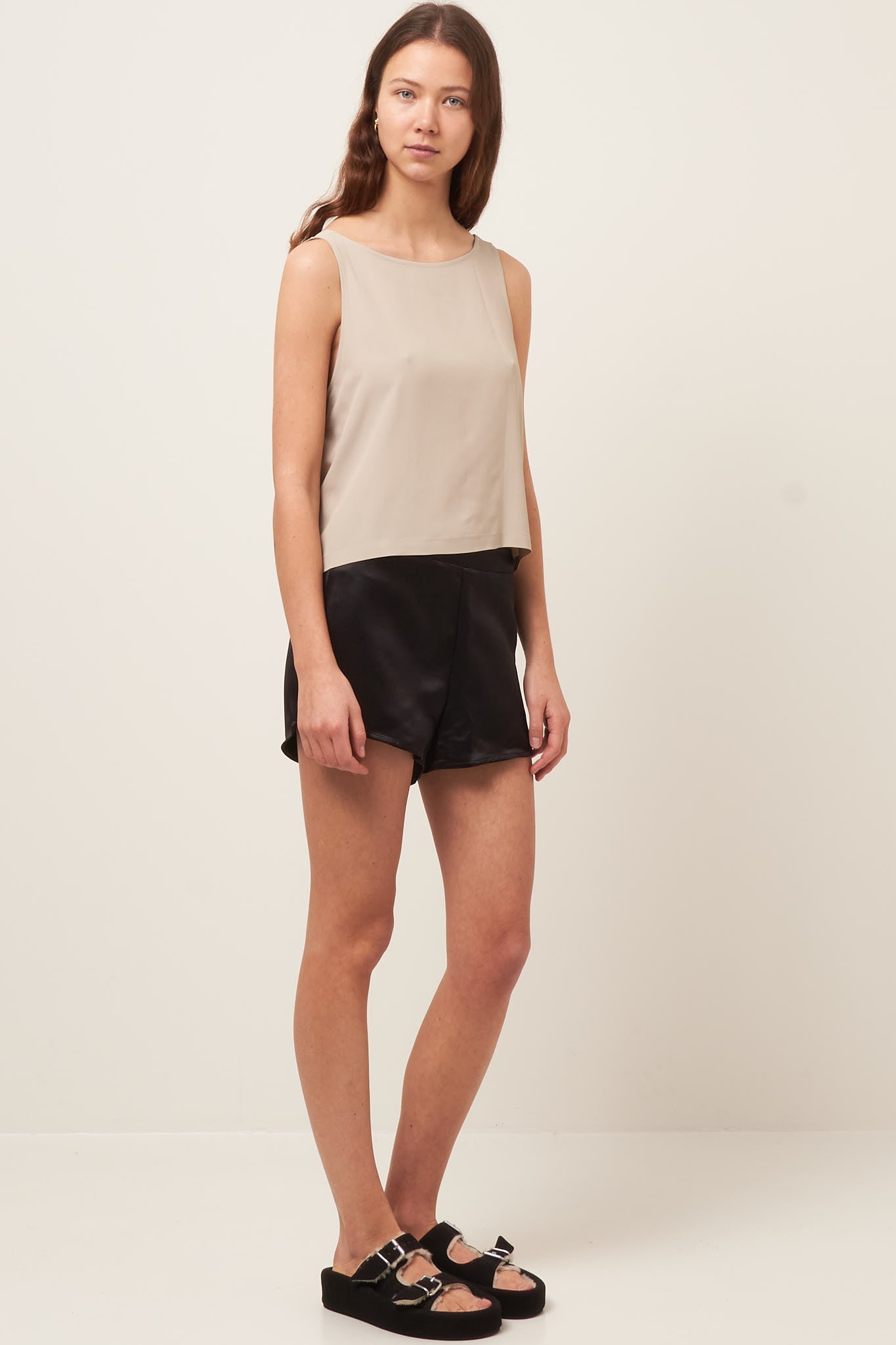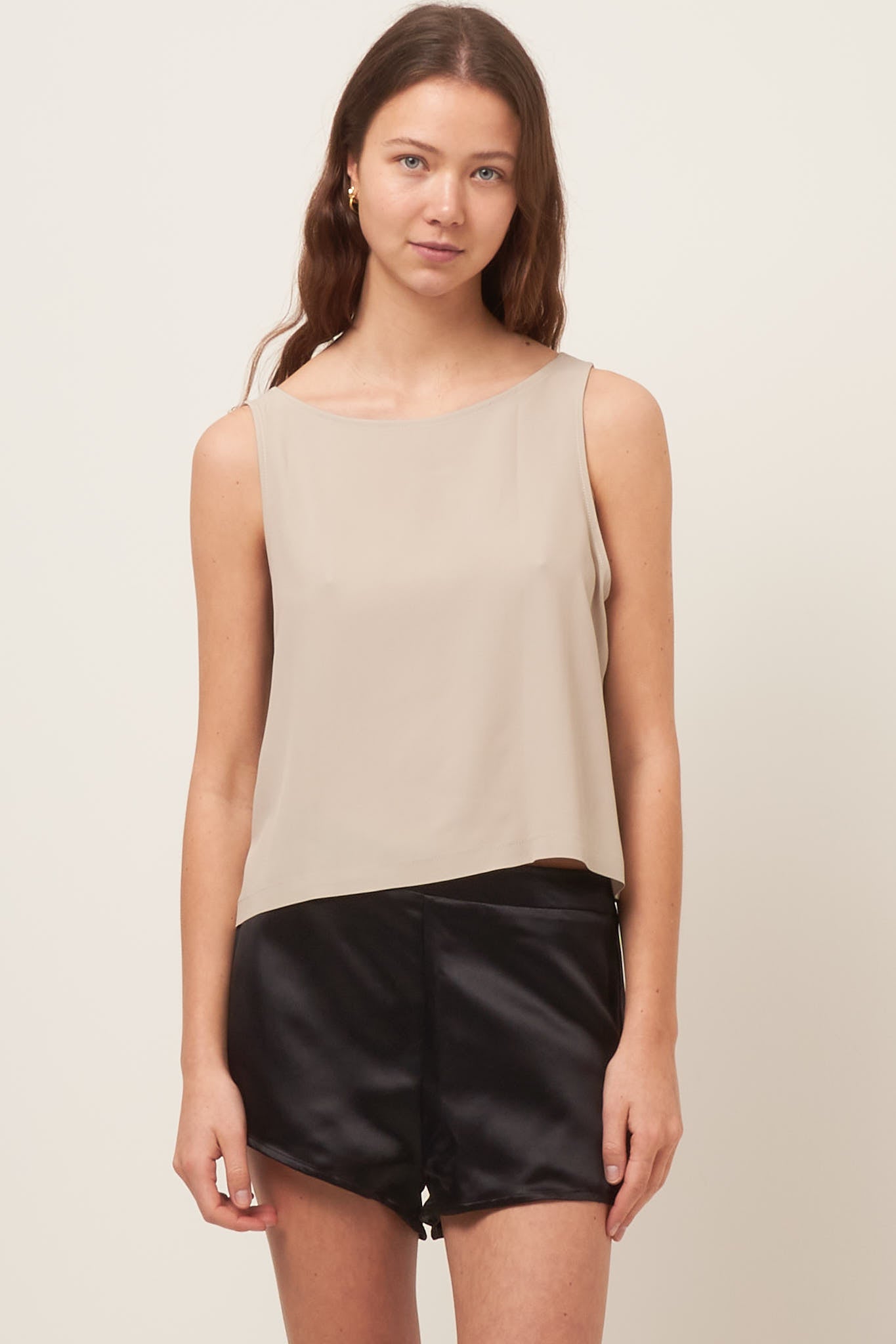 Alba Top Sand from STRØM. This top is produced in Italy and made from a smooth silk blend. It is designed in a relaxed fit and is reversible. It has a deep round neck, wide straps and has a semi-short length.