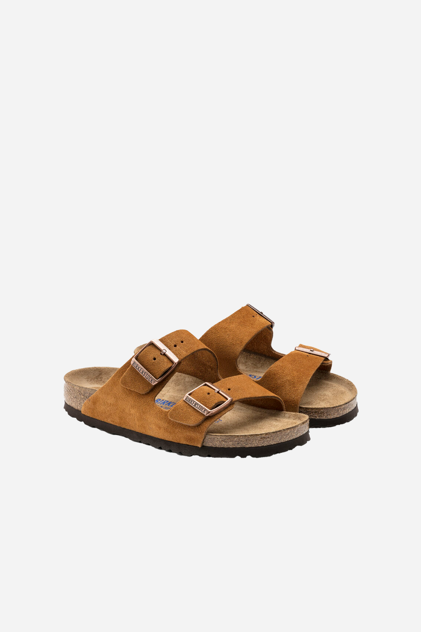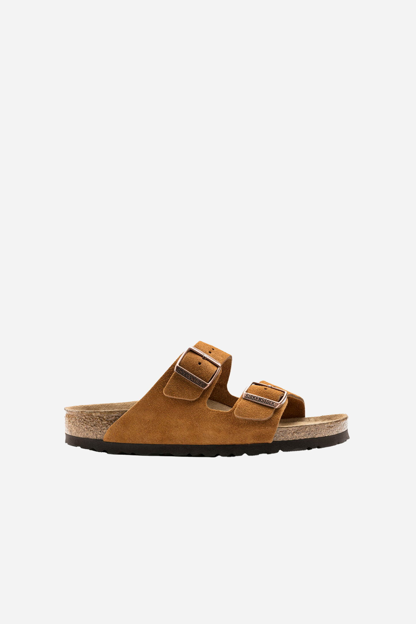 Arizona RF Mink Suede from Birkenstock. These sandals are made with an anatomically shaped cork-latex footbed that is particularly soft. They are designed with two suede straps that adjust with buckles. The buckles can be adjusted individually.