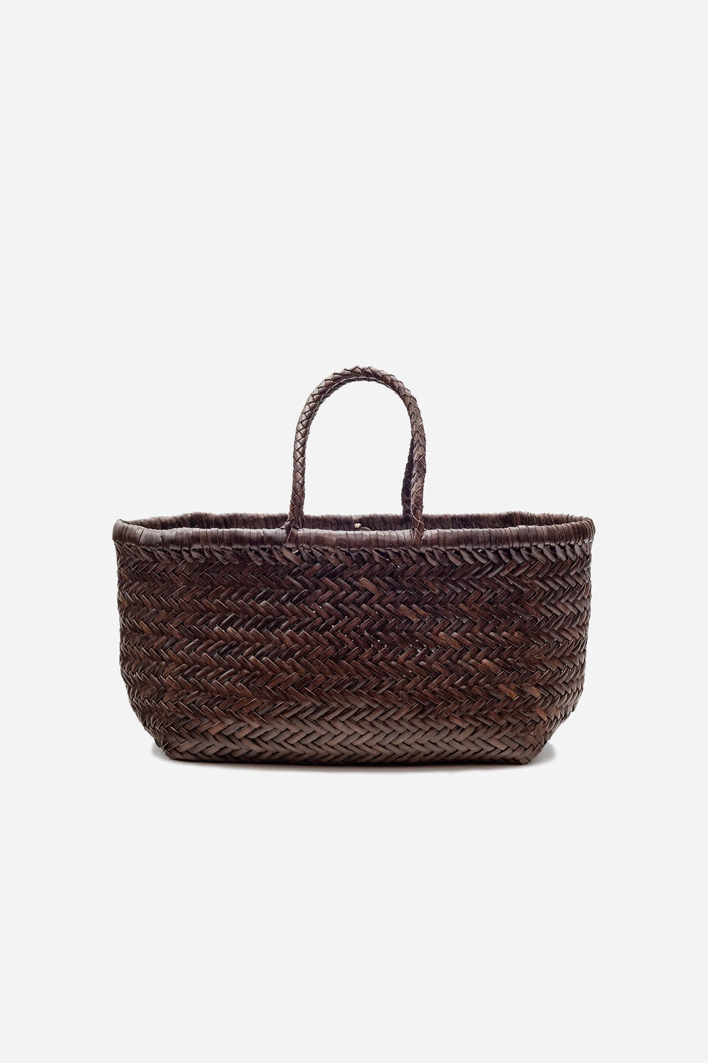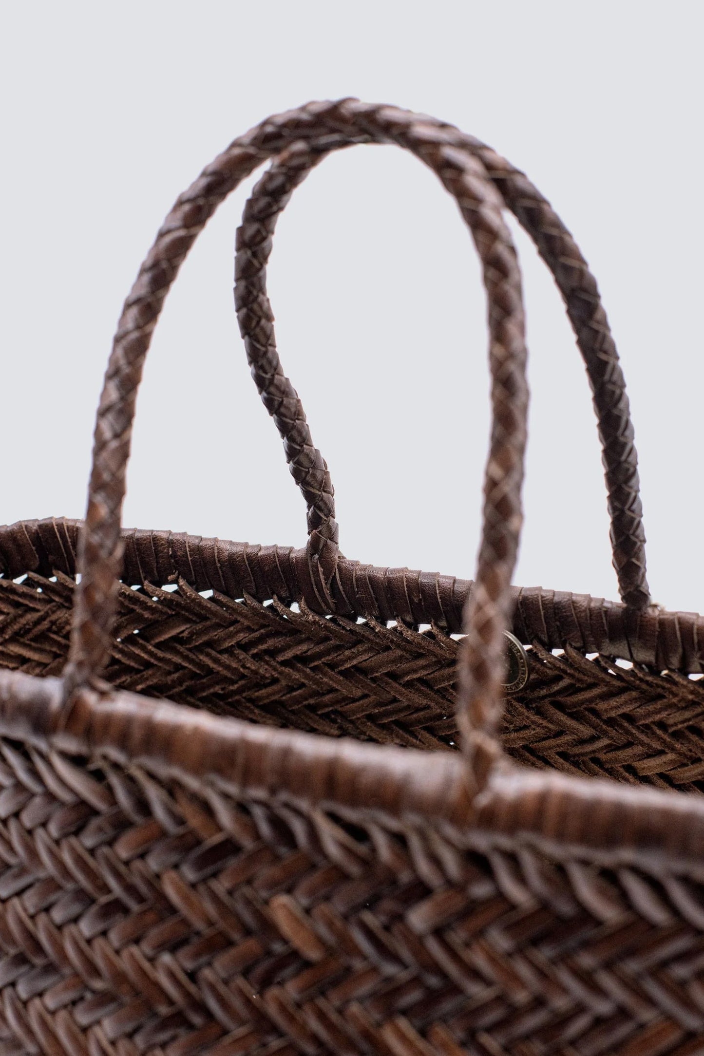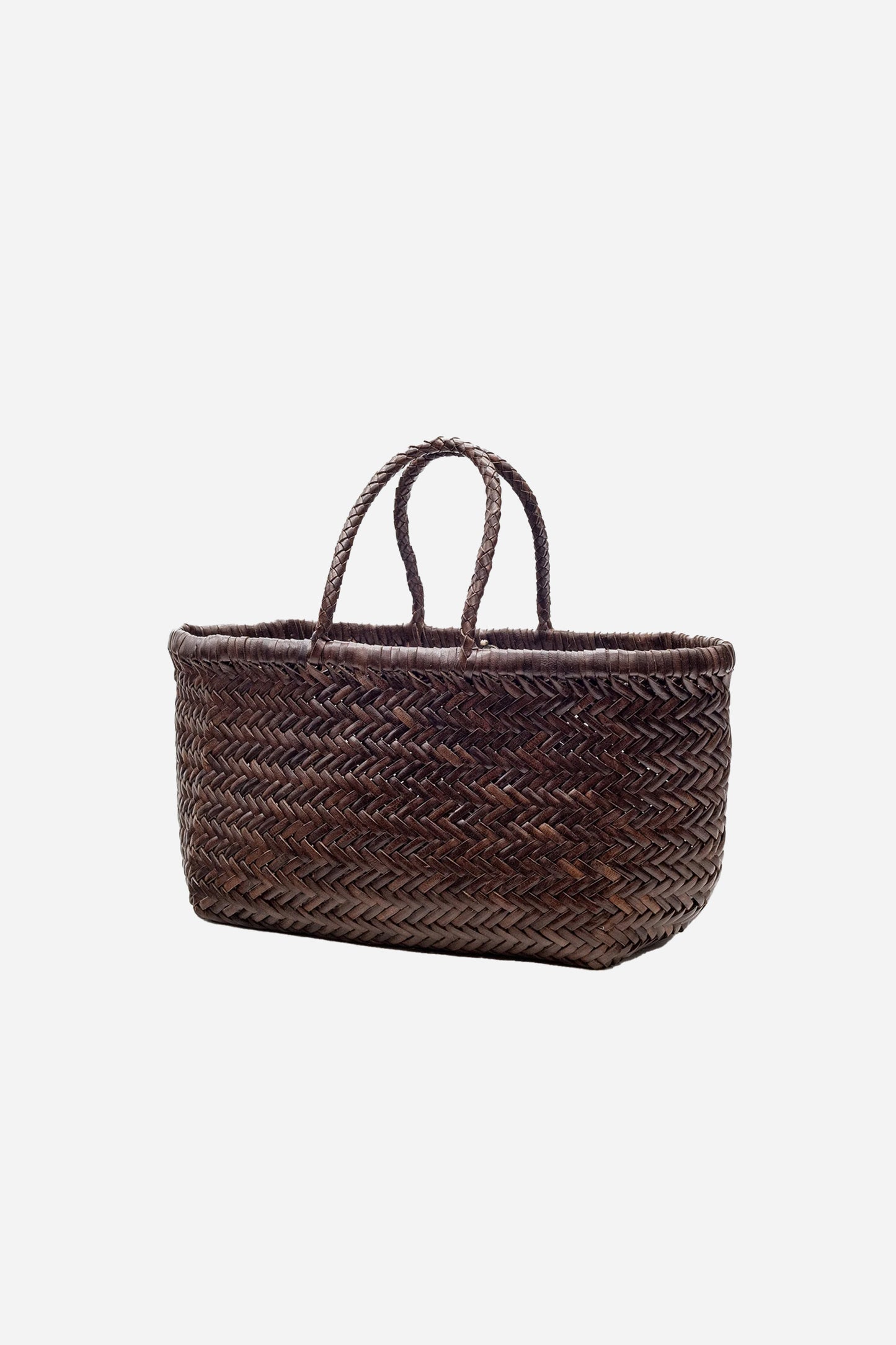 Bamboo Triple Jump Small Dark Brown by Dragon Diffusion. This bag is handmade in India and is designed in braided leather. The bag has a large interior compartment, a pendant and two straps.