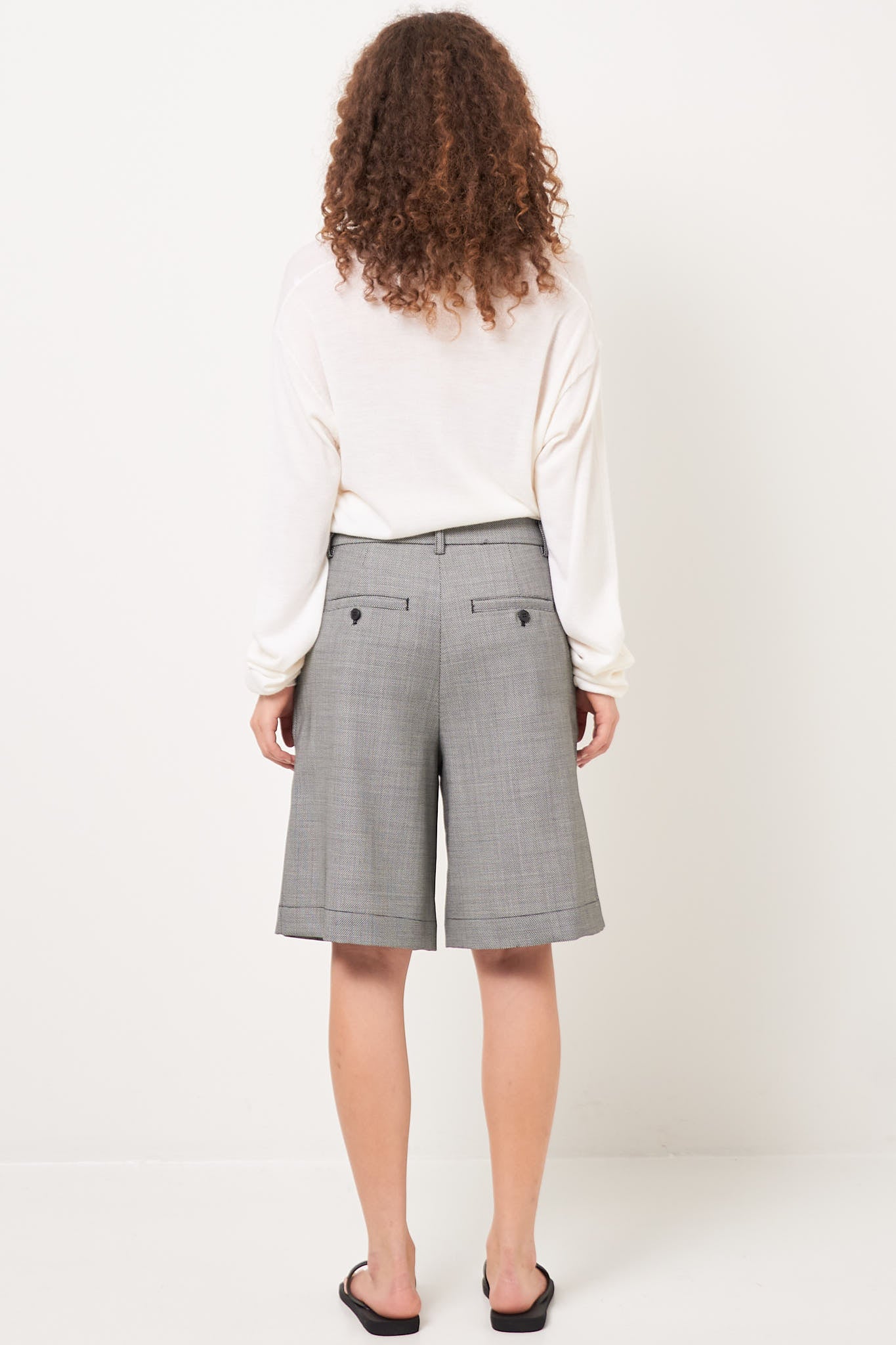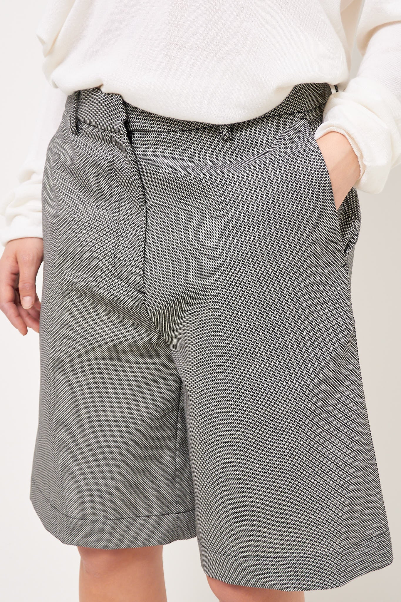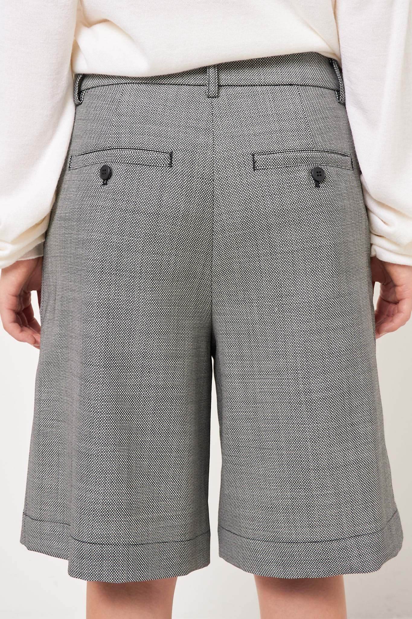 Bea Bermuda Shorts Circle Grid from STRØM. Made in Italy and made from deadstock fabric from an internationally renowned fashion house, these shorts come in a limited edition. They have a loose fit, knee-length legs, and are designed with two slanted side pockets, two back pockets that close with a button and belt loops.