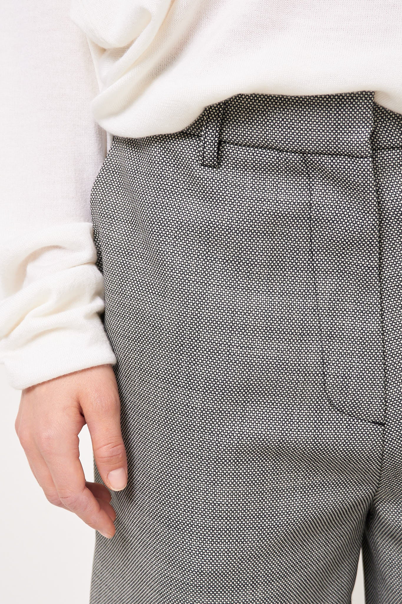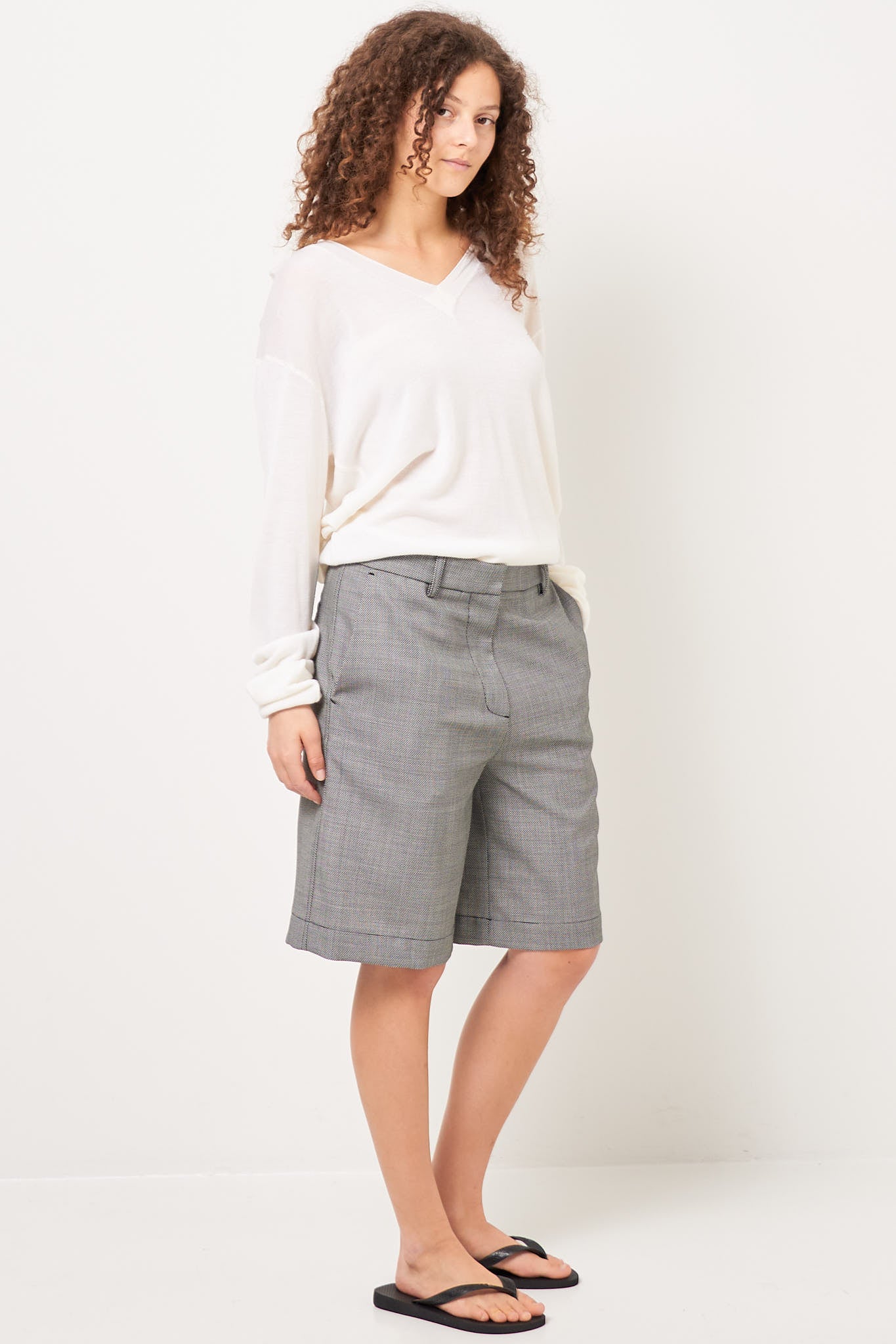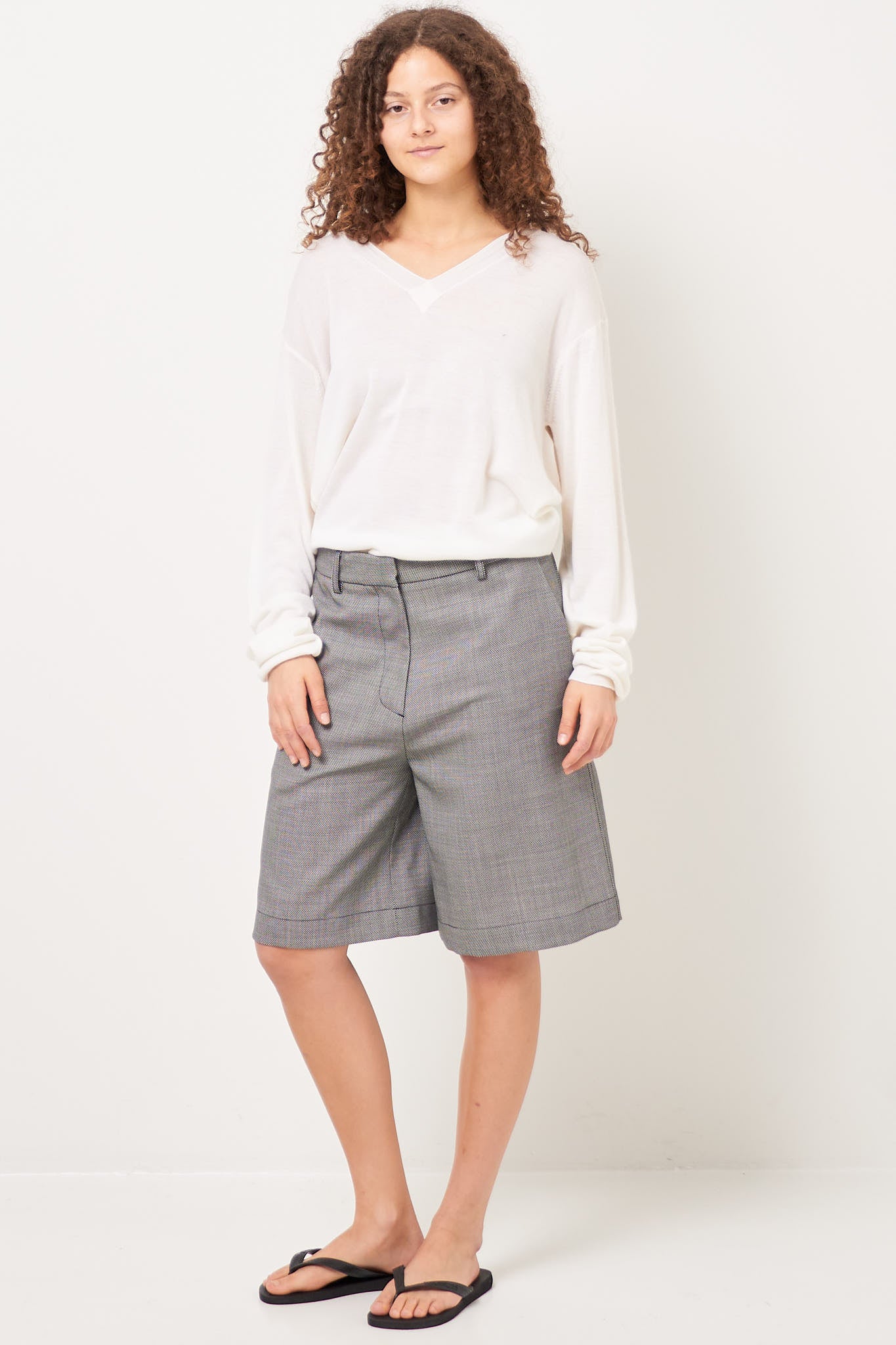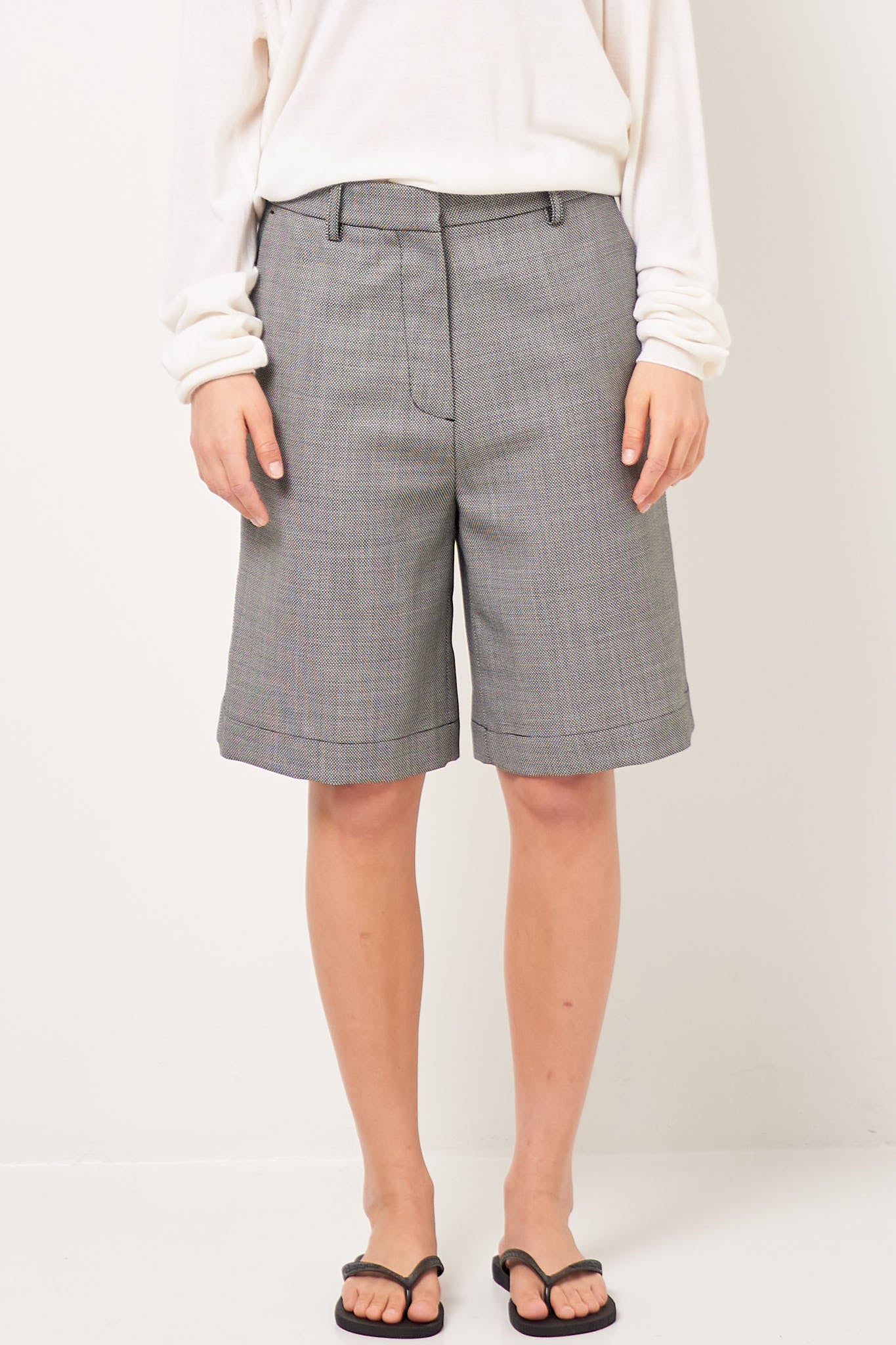 Bea Bermuda Shorts Circle Grid from STRØM. Made in Italy and made from deadstock fabric from an internationally renowned fashion house, these shorts come in a limited edition. They have a loose fit, knee-length legs, and are designed with two slanted side pockets, two back pockets that close with a button and belt loops.