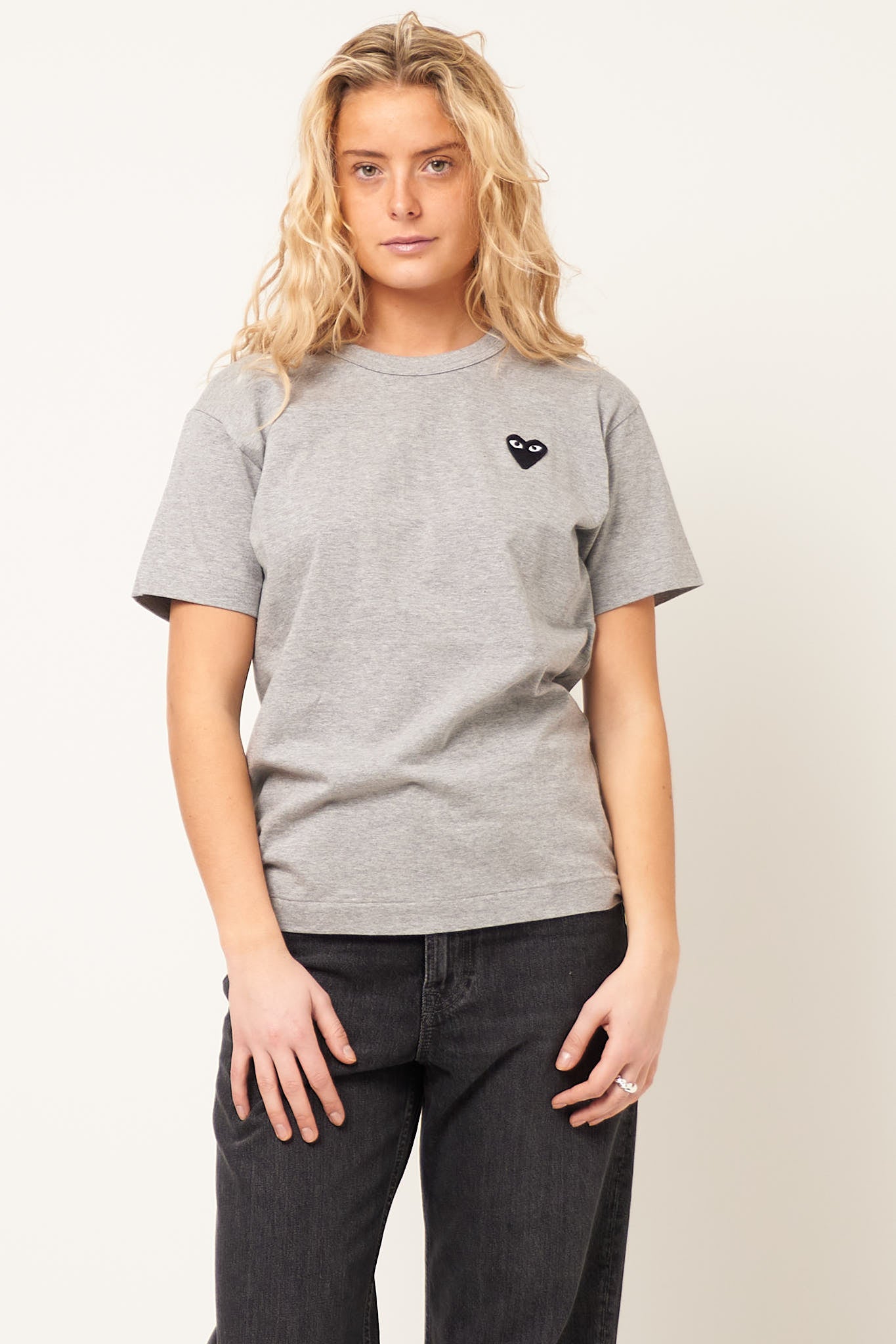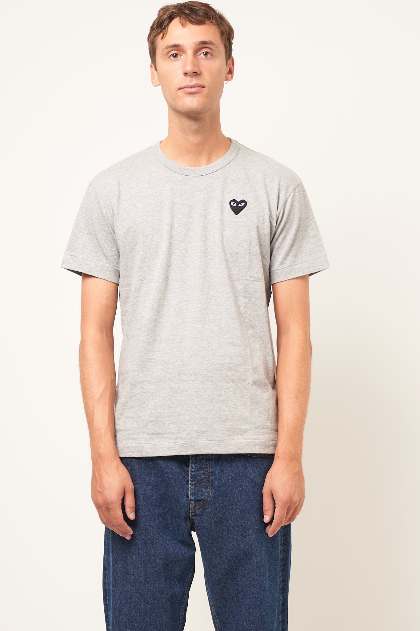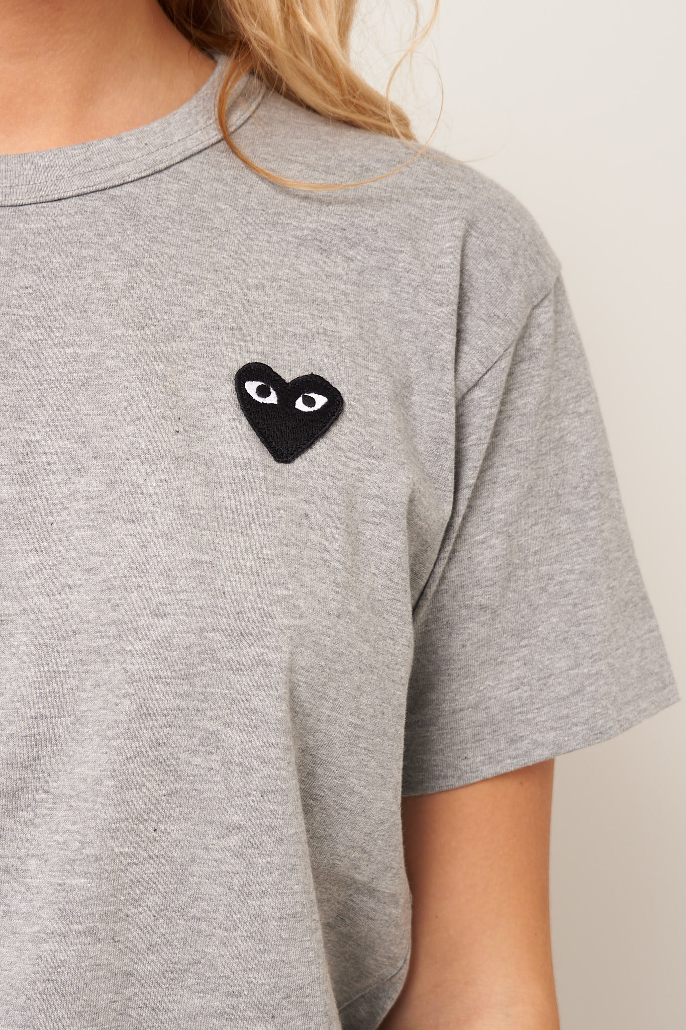 Black Heart T-shirt Grey from Comme des Garçons Play. This t-shirt is made from cotton and has a classic fit. It has a round neckline and short sleeves. The t-shirt is detailed with an embroidered Comme des Garçons Play logo on the left chest.