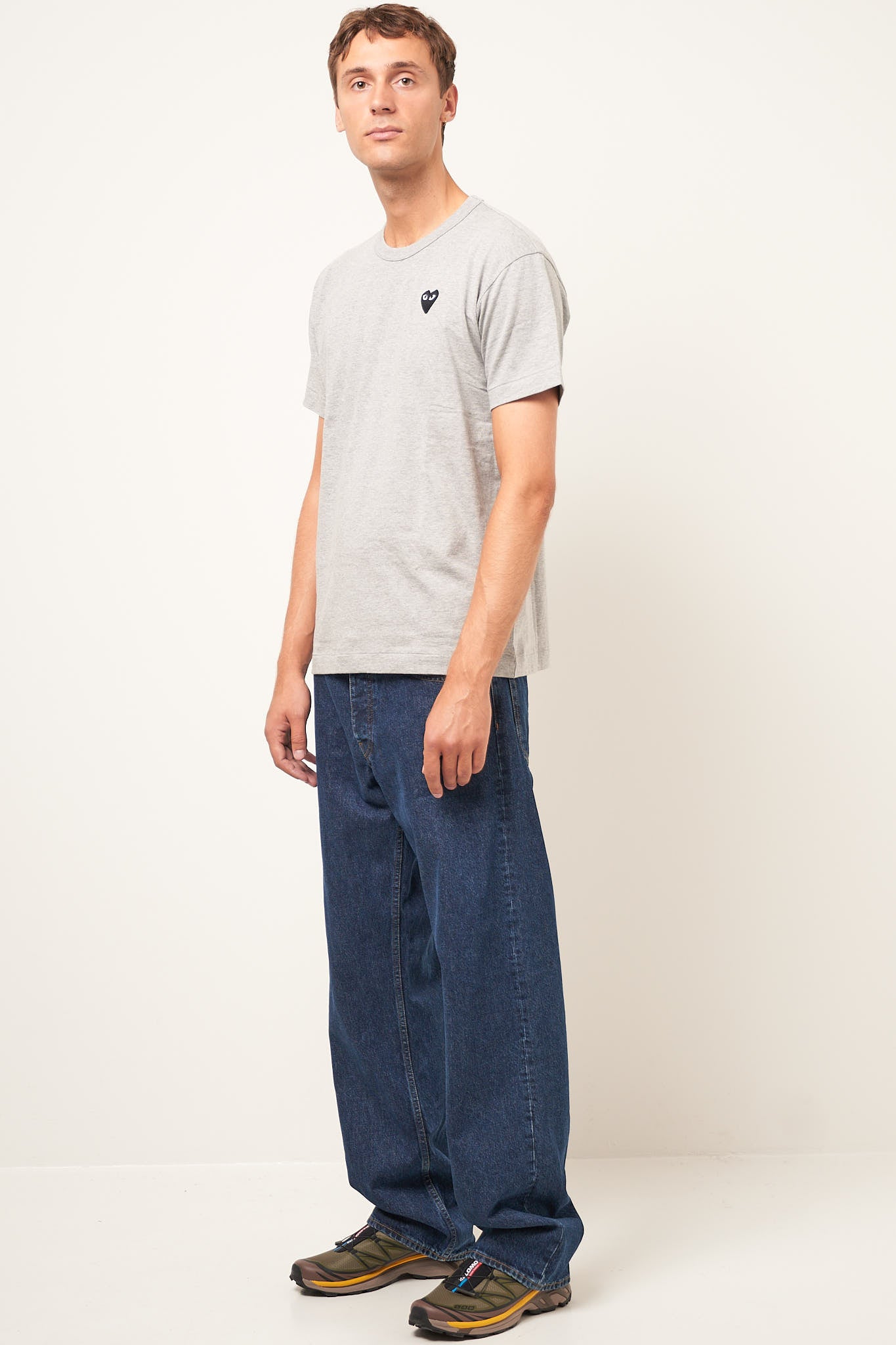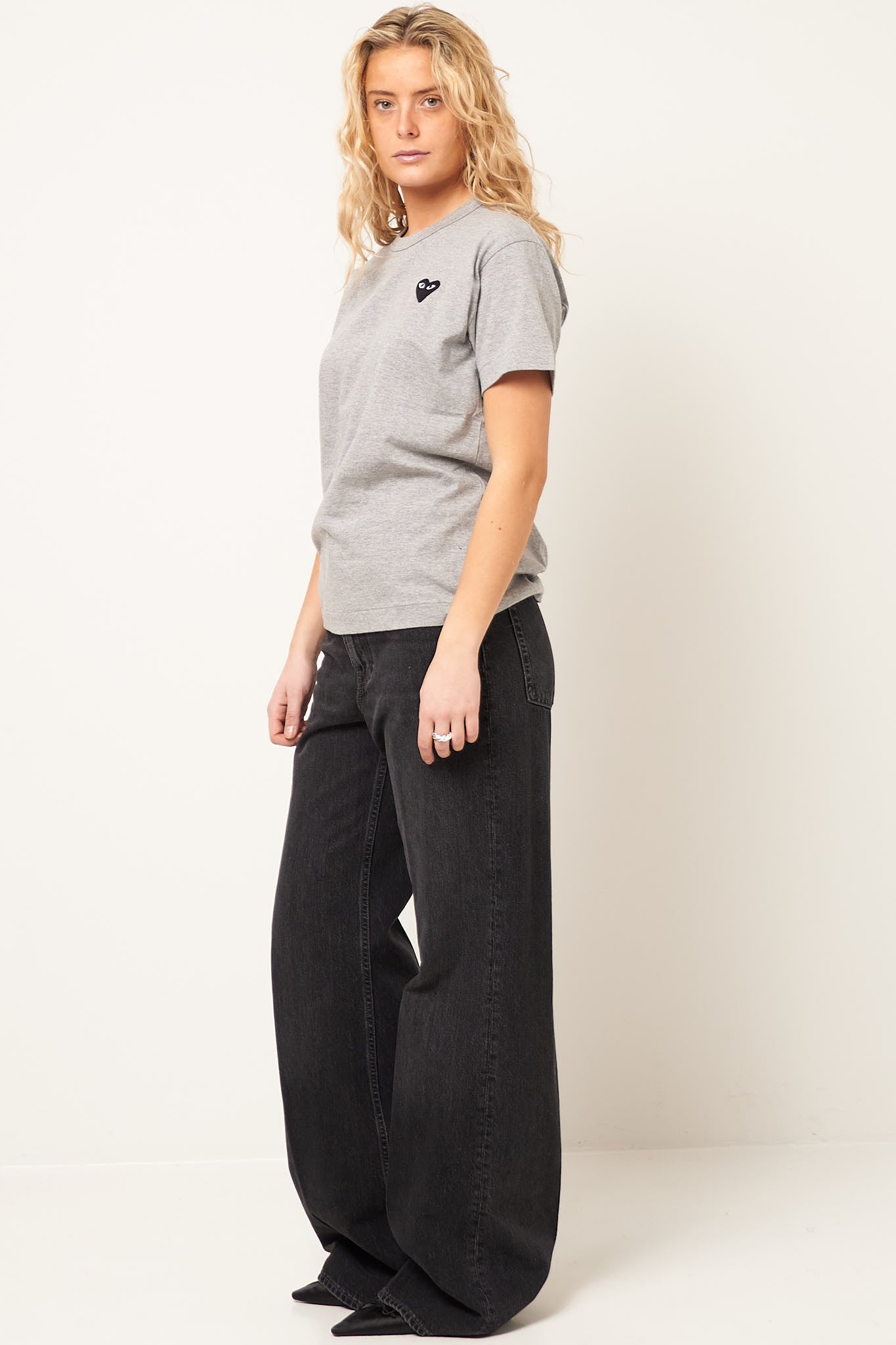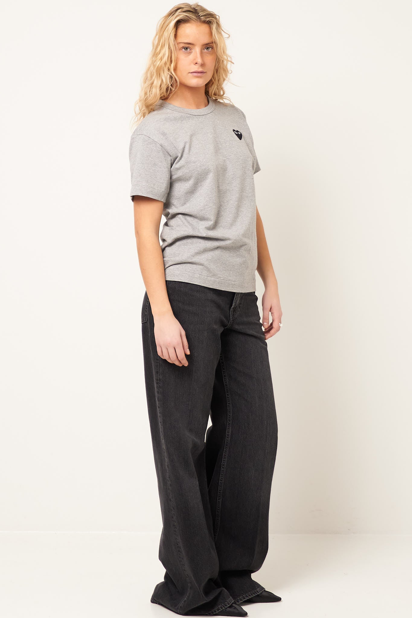 Black Heart T-shirt Grey from Comme des Garçons Play. This t-shirt is made from cotton and has a classic fit. It has a round neckline and short sleeves. The t-shirt is detailed with an embroidered Comme des Garçons Play logo on the left chest.