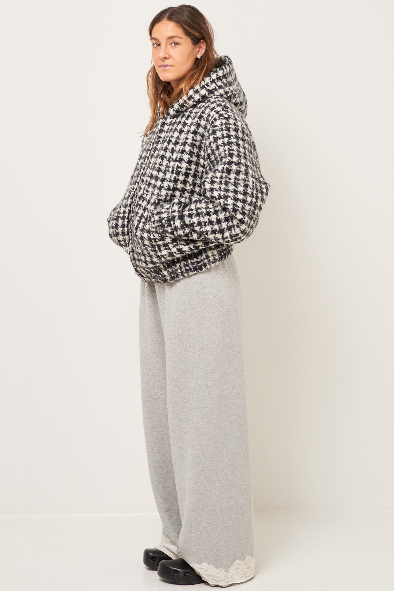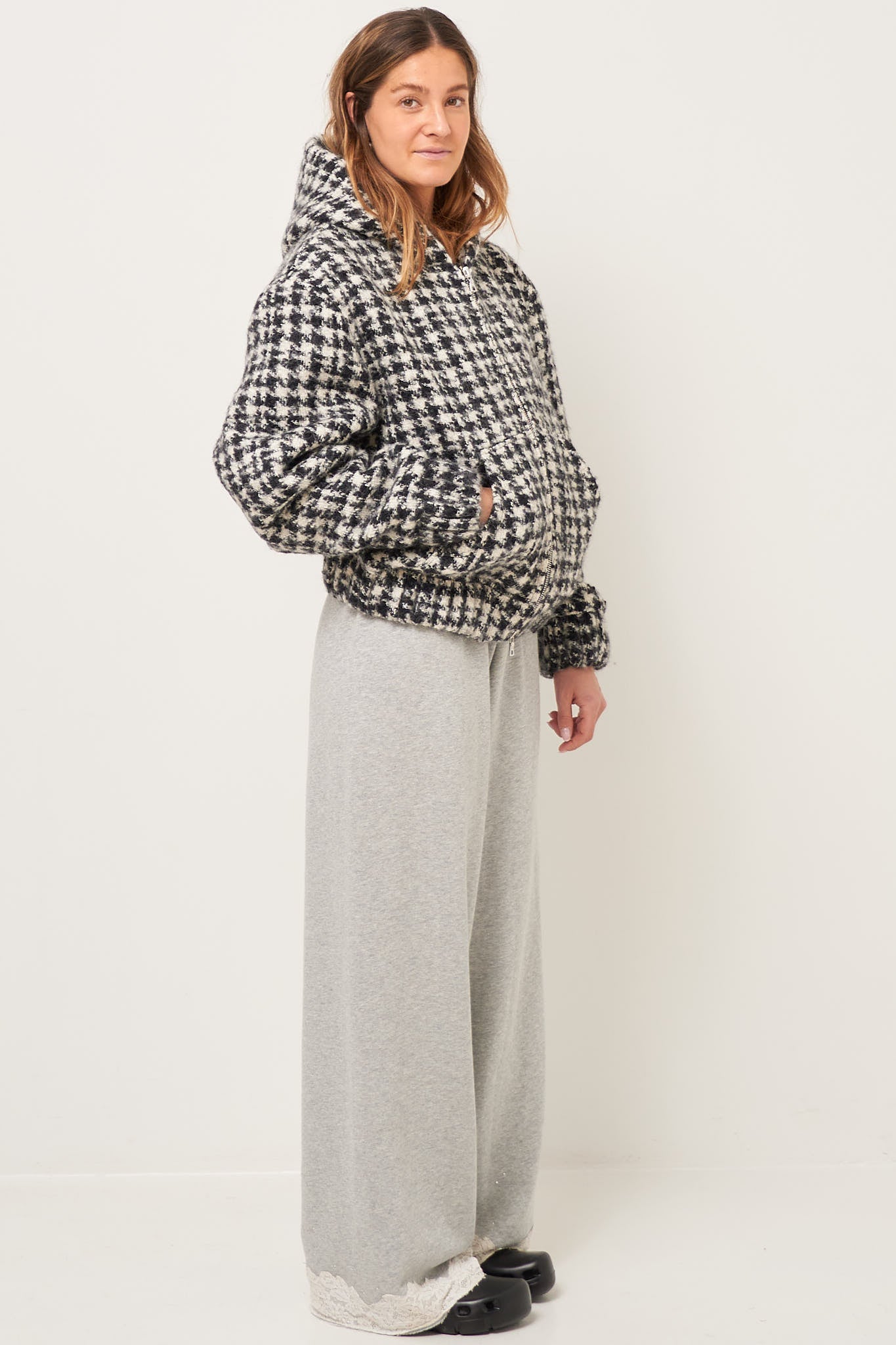 Hooded Zip-Up Jacket Houndstooth Black/White from gabi gamél. This jacket is made from deadstock Chanel fabric with jersey bonding. It is designed in a relaxed and oversized fit with a cropped length and elastic at the waist. The jacket has a two-way zipper, side pockets and a hood.