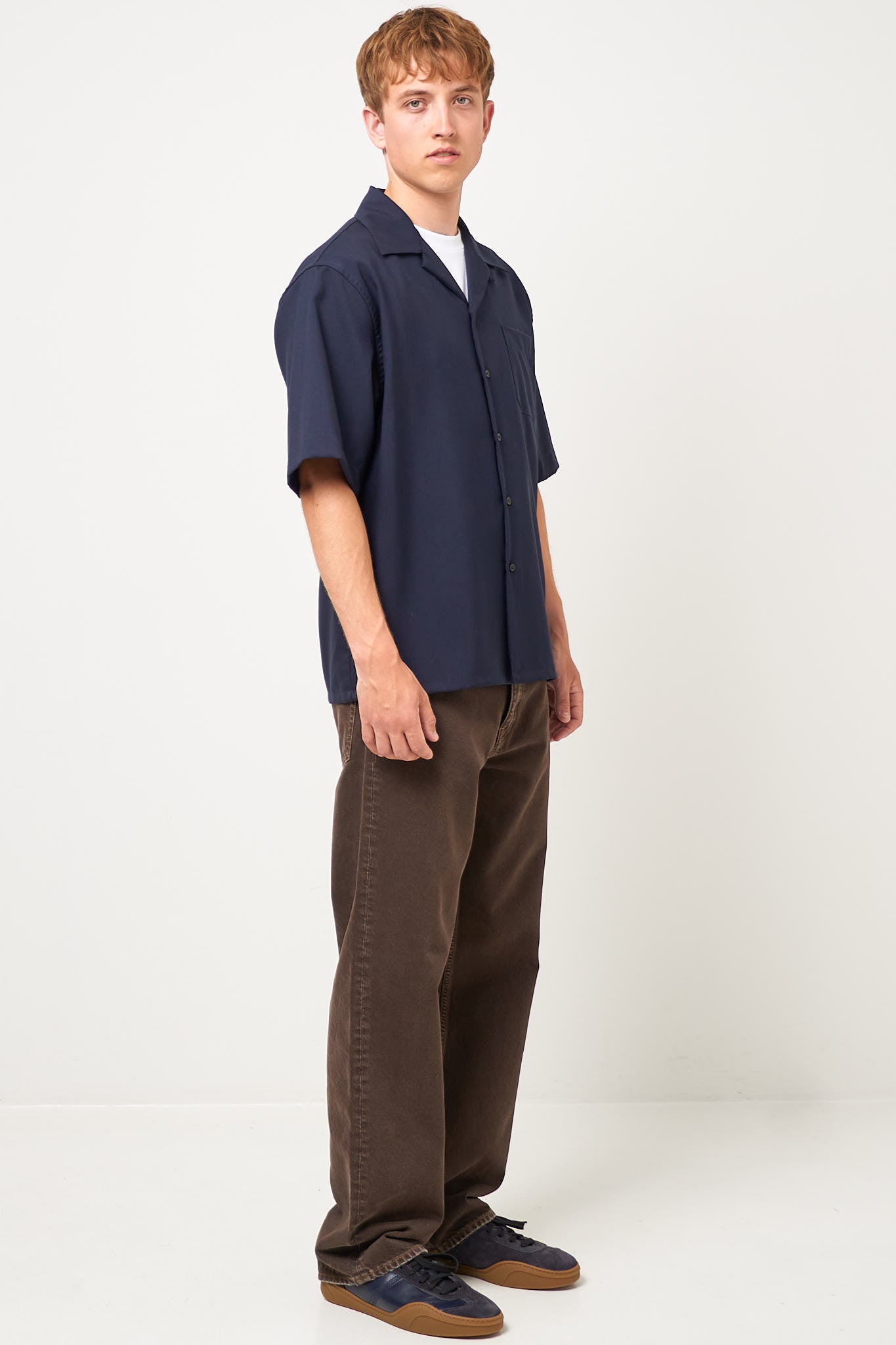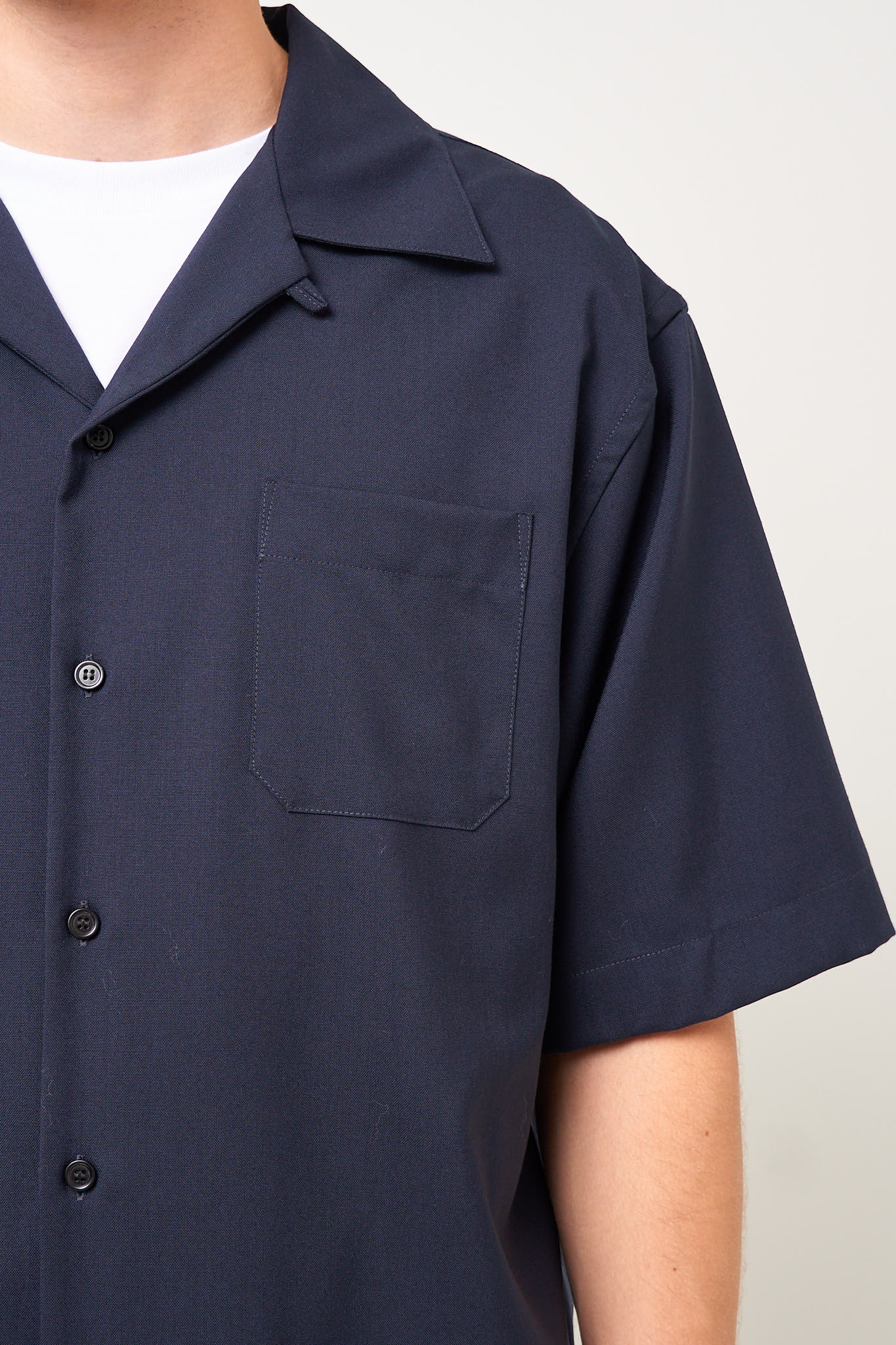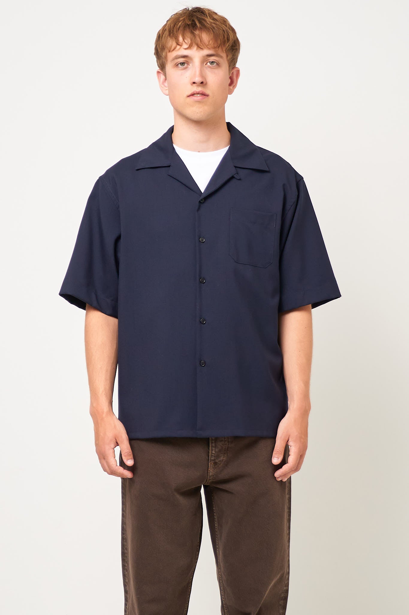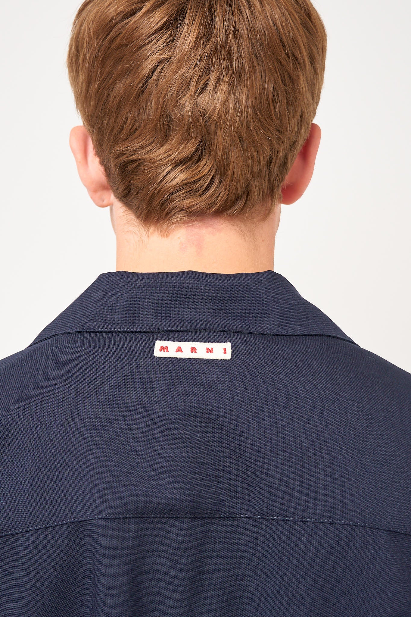 Bowling Shirt Tropical Wool Blue Black from Marni. This shirt is made of fine wool. It is designed with a loose fit, short sleeves and a chest pocket on the left side. The shirt has a Marni logo on the back.