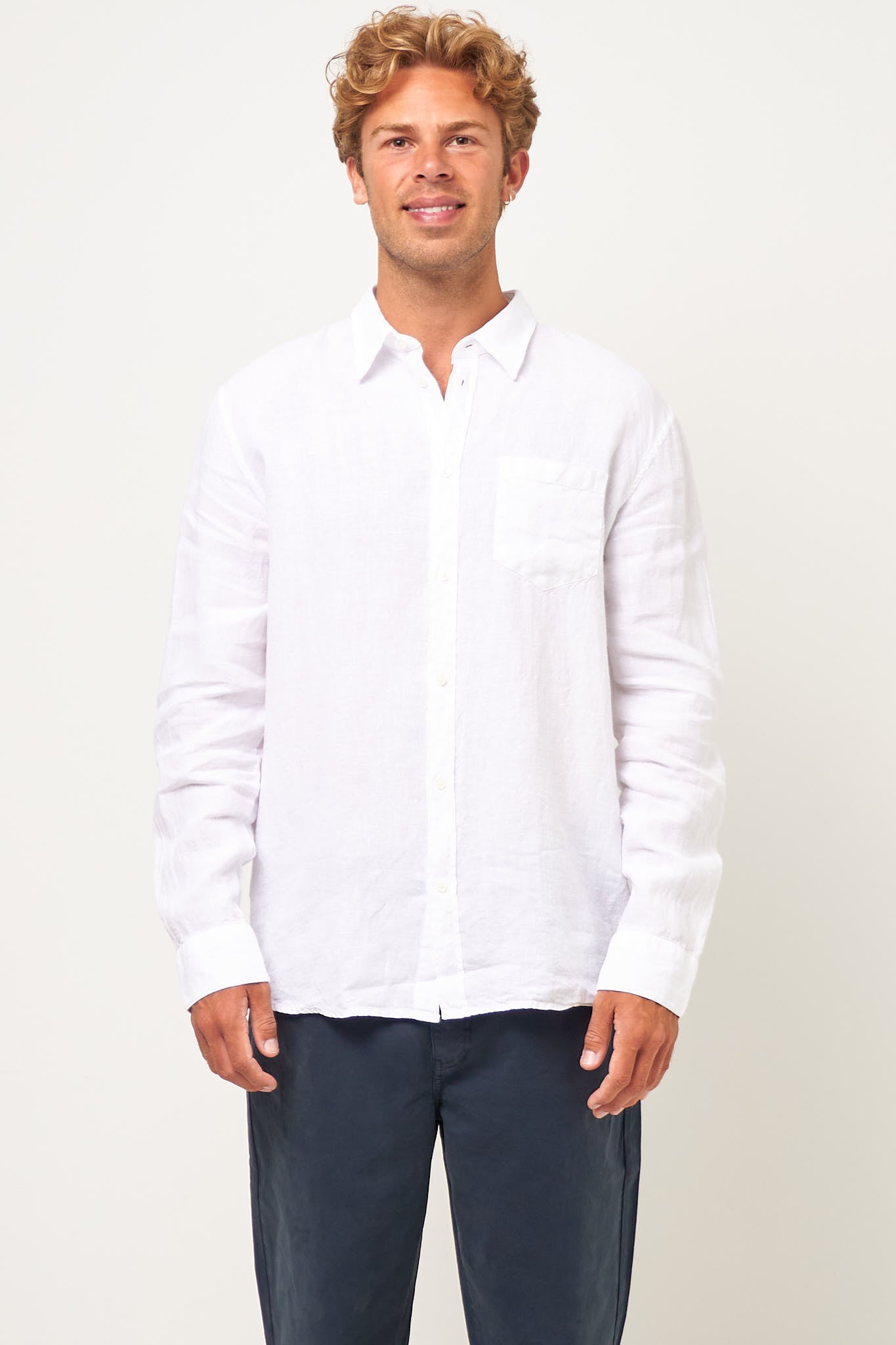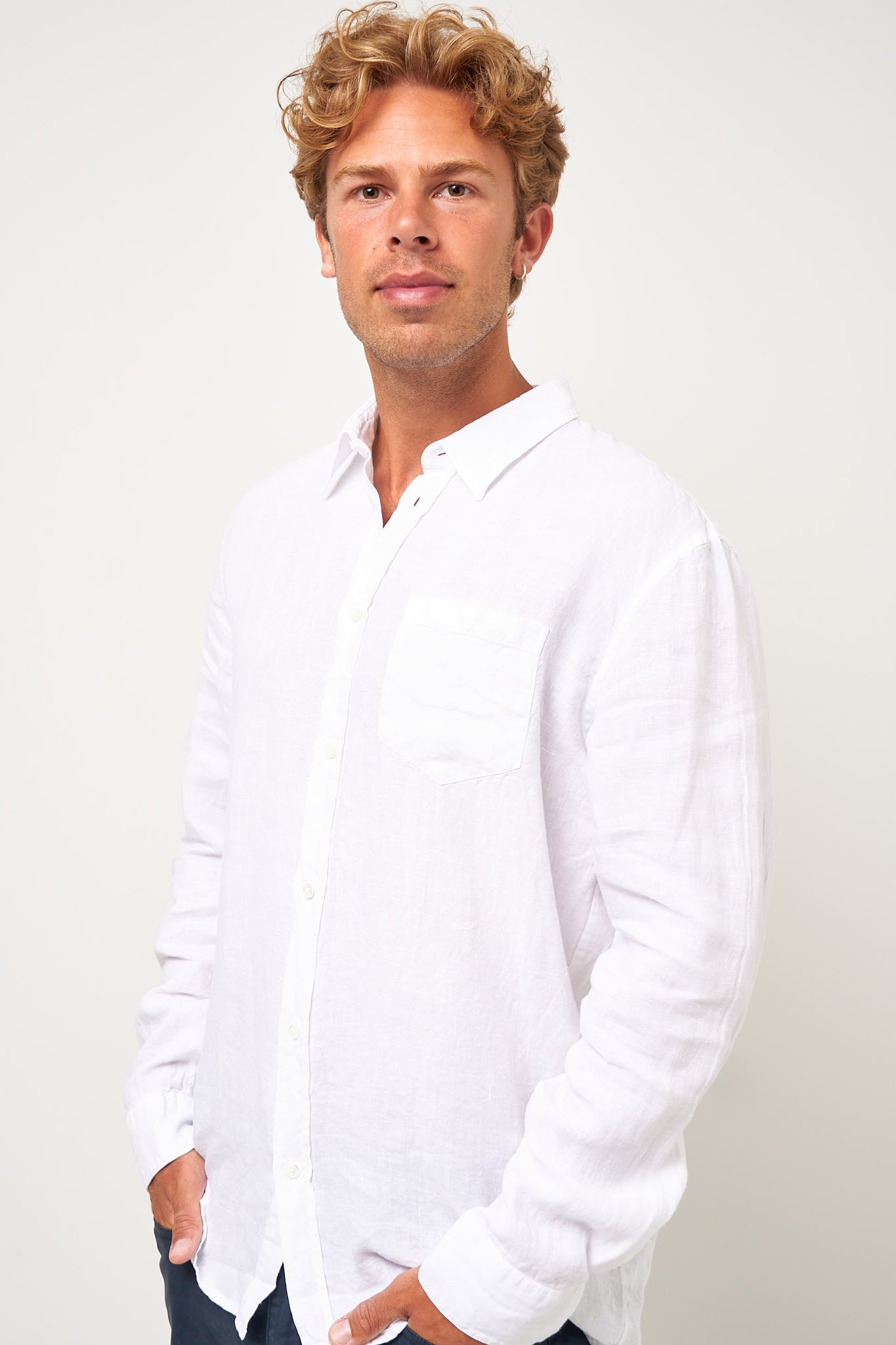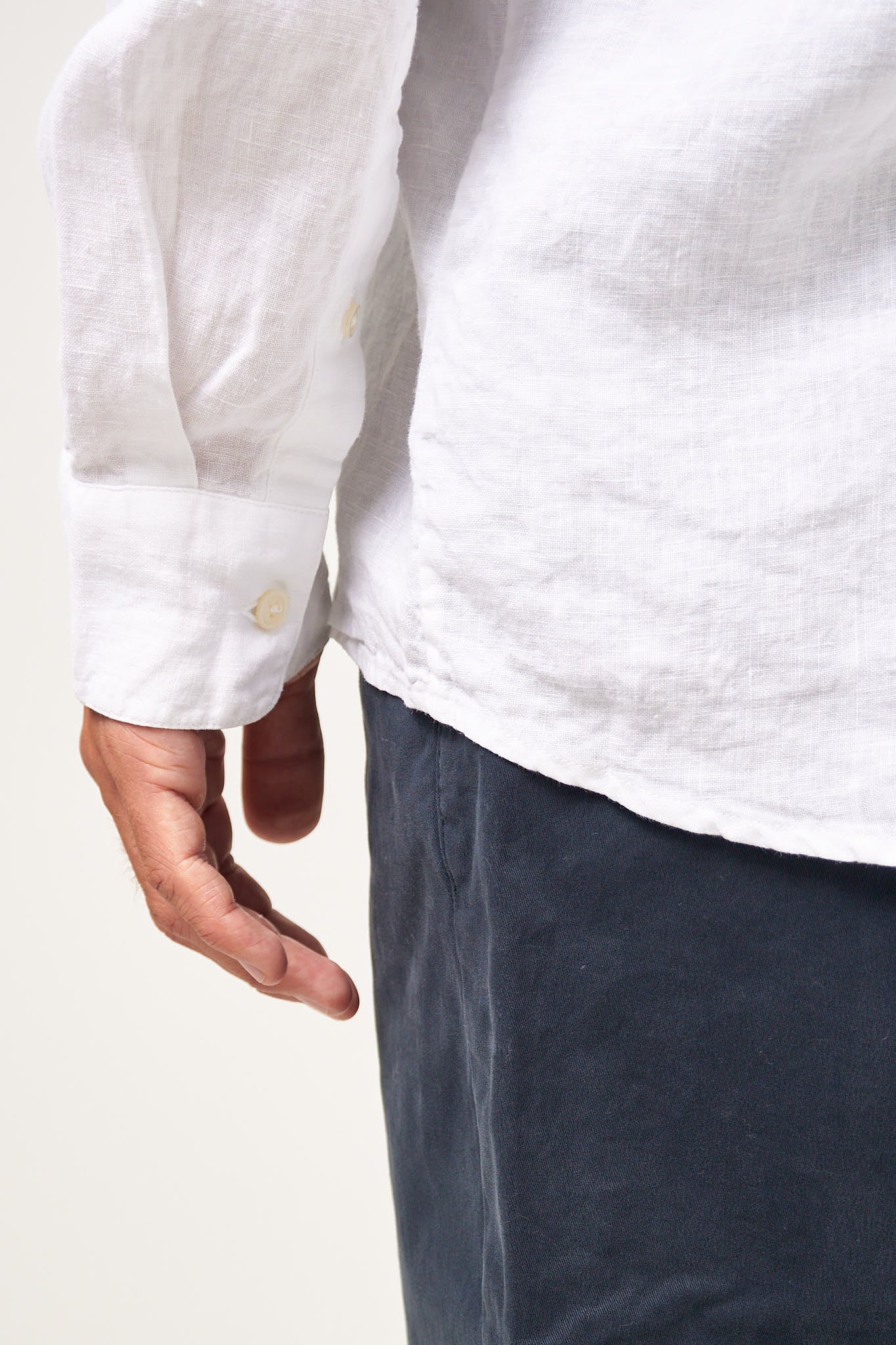 Brook Shirt Linen Optic White from STRØM. This shirt is made of a light linen and is produced in Portugal. It has a regular fit with a single chest pocket on the left side. The shirt closes with buttons at the front.