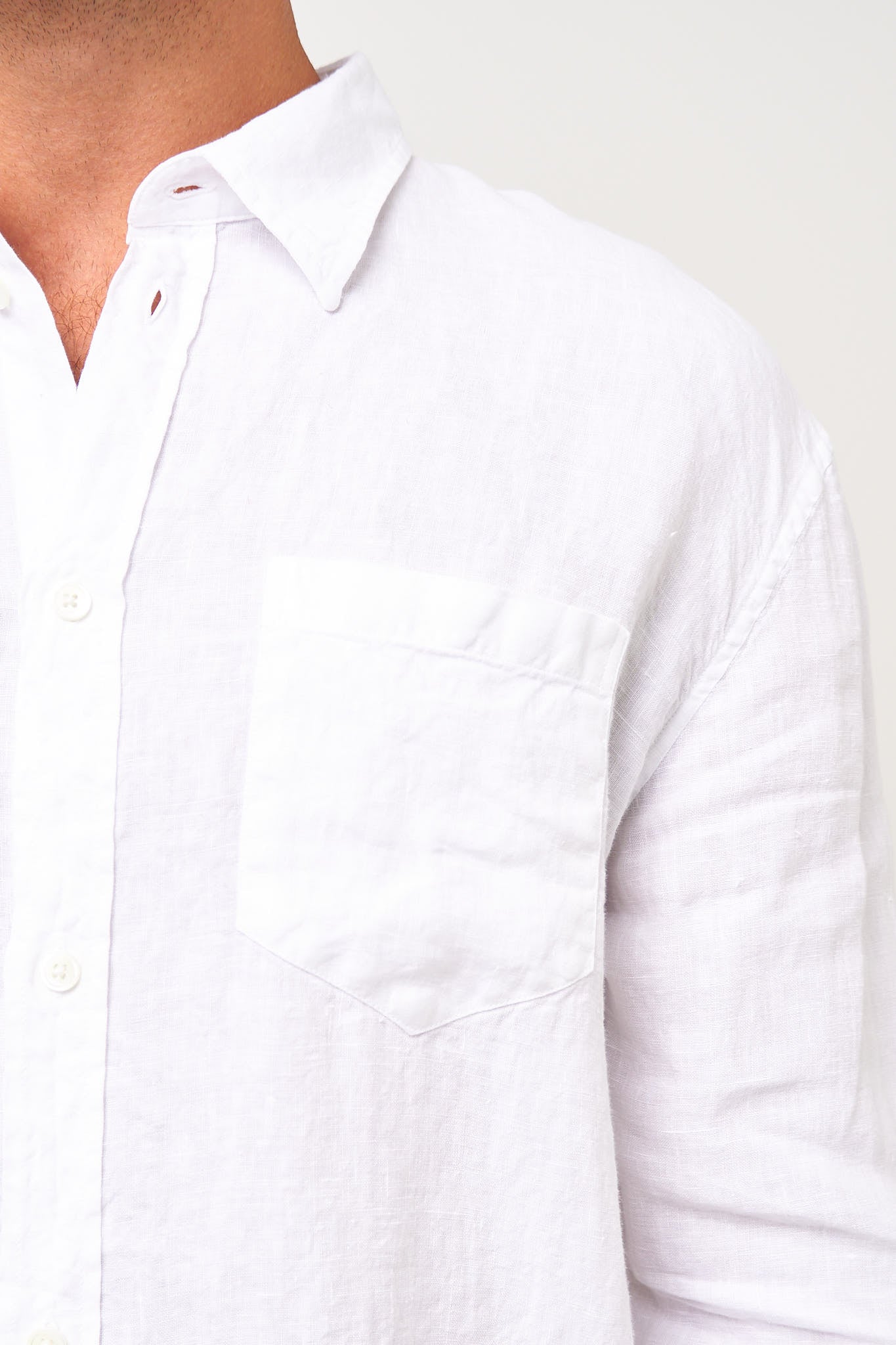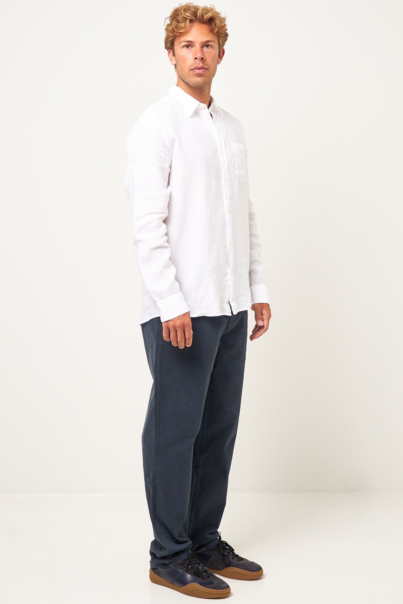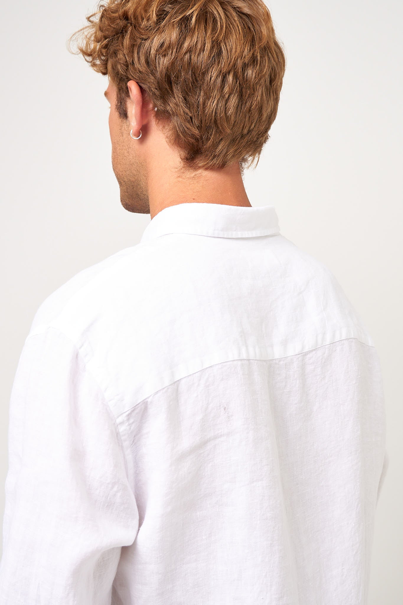 Brook Shirt Linen Optic White from STRØM. This shirt is made of a light linen and is produced in Portugal. It has a regular fit with a single chest pocket on the left side. The shirt closes with buttons at the front.