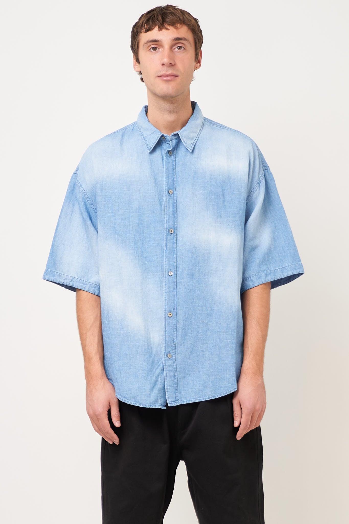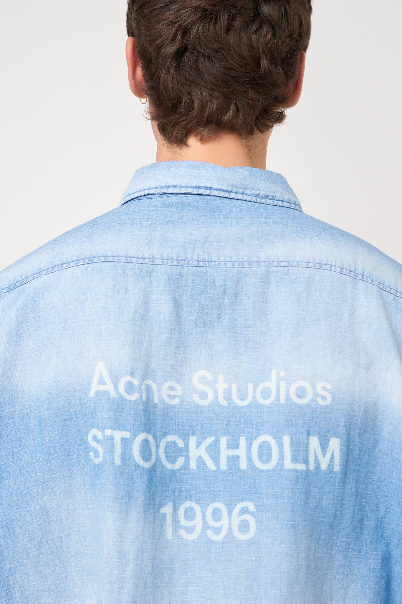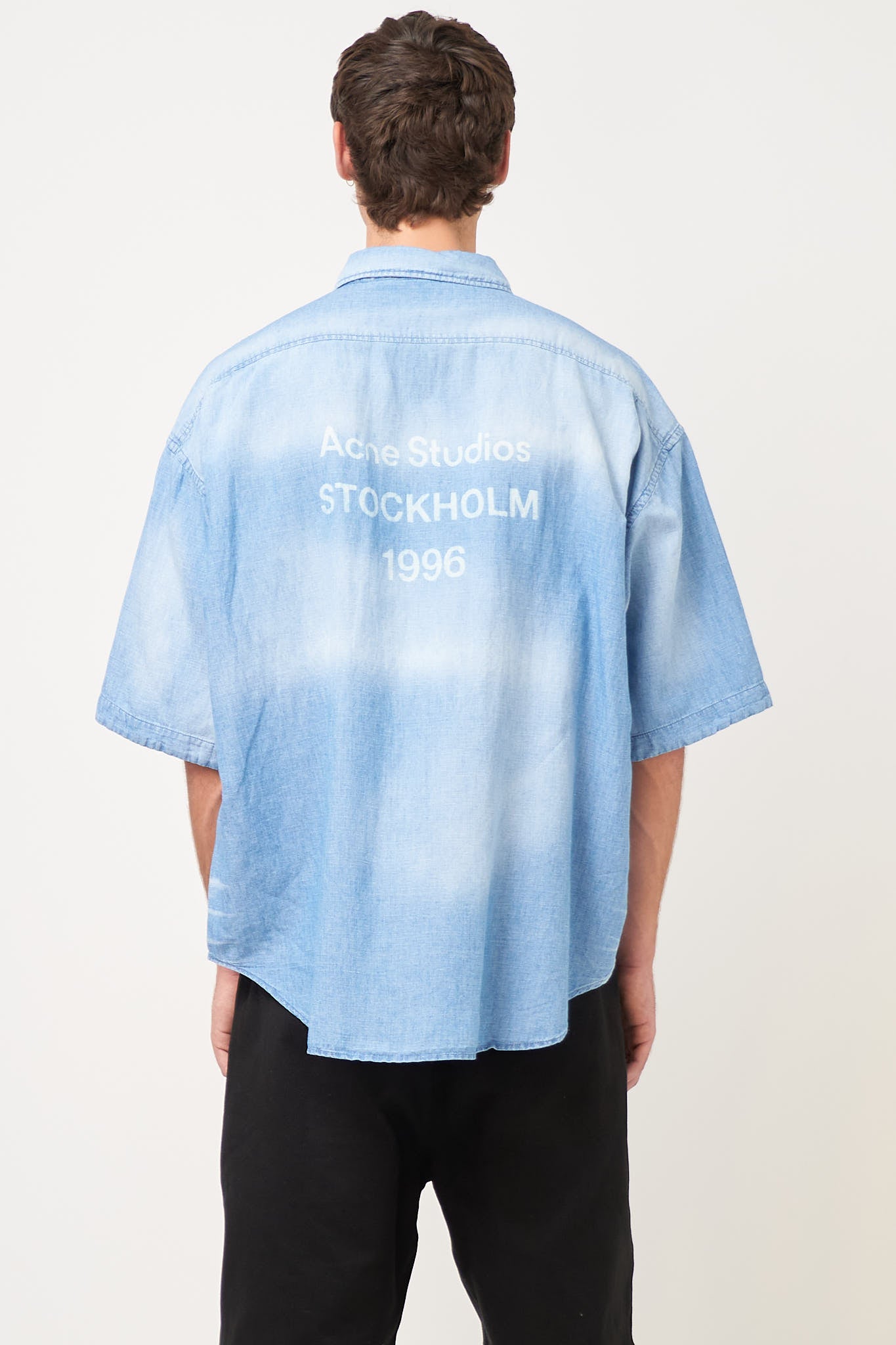 Button-Up Shirt Logo Stamp Mid Blue from Acne Studios. This shirt is made from a lightweight cotton. It has an oversized fit with dropped shoulders and an Acne Studios logo on the back. The shirt closes with buttons.