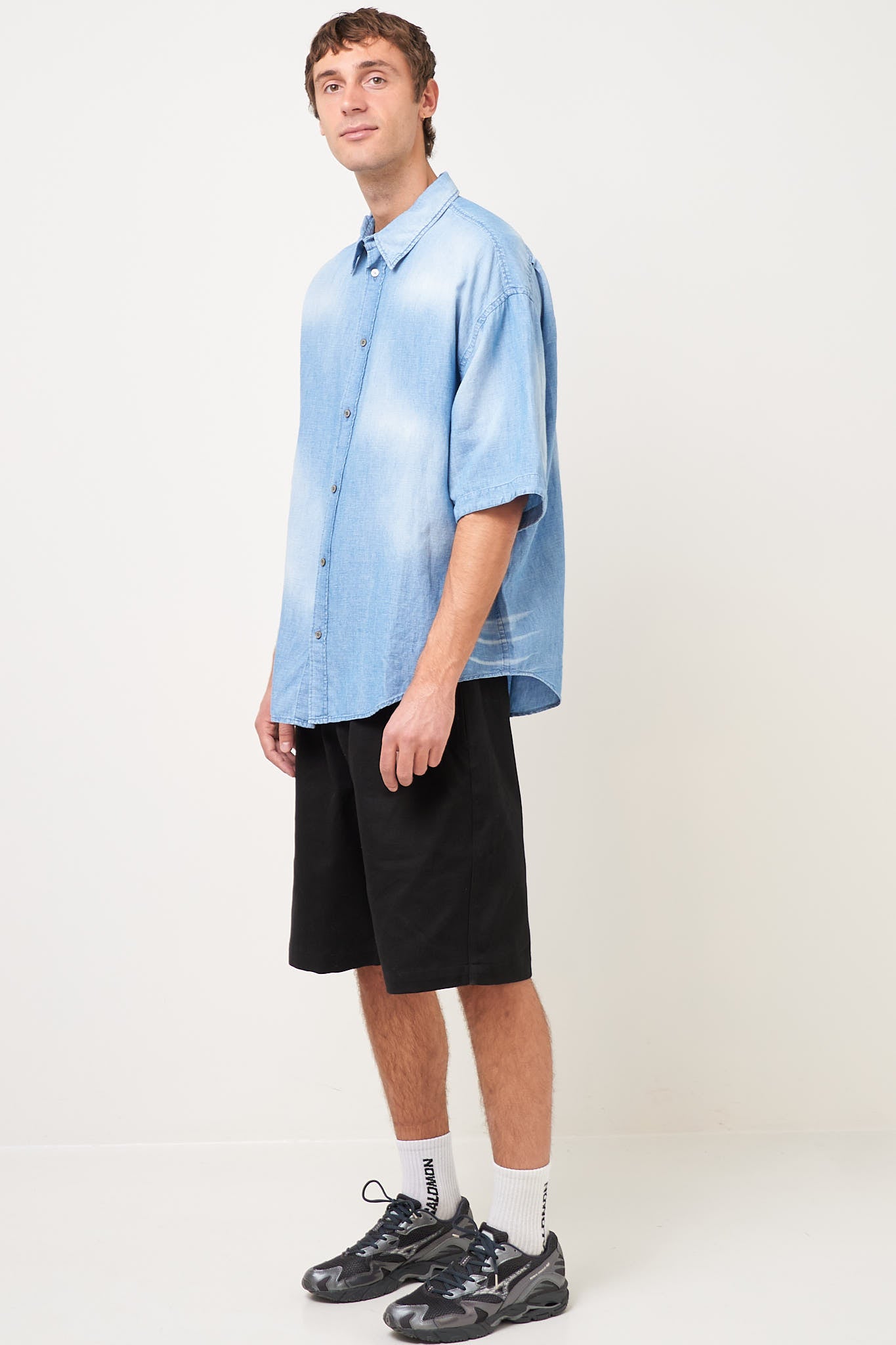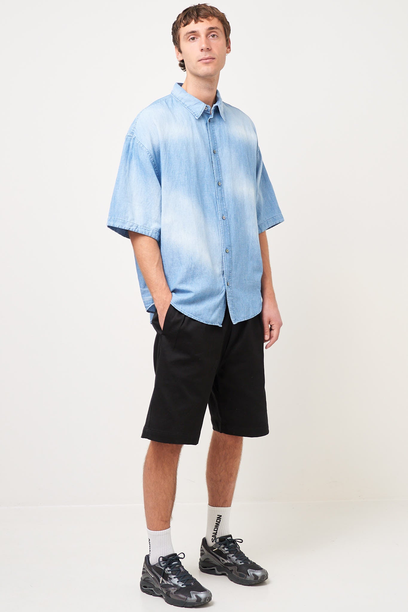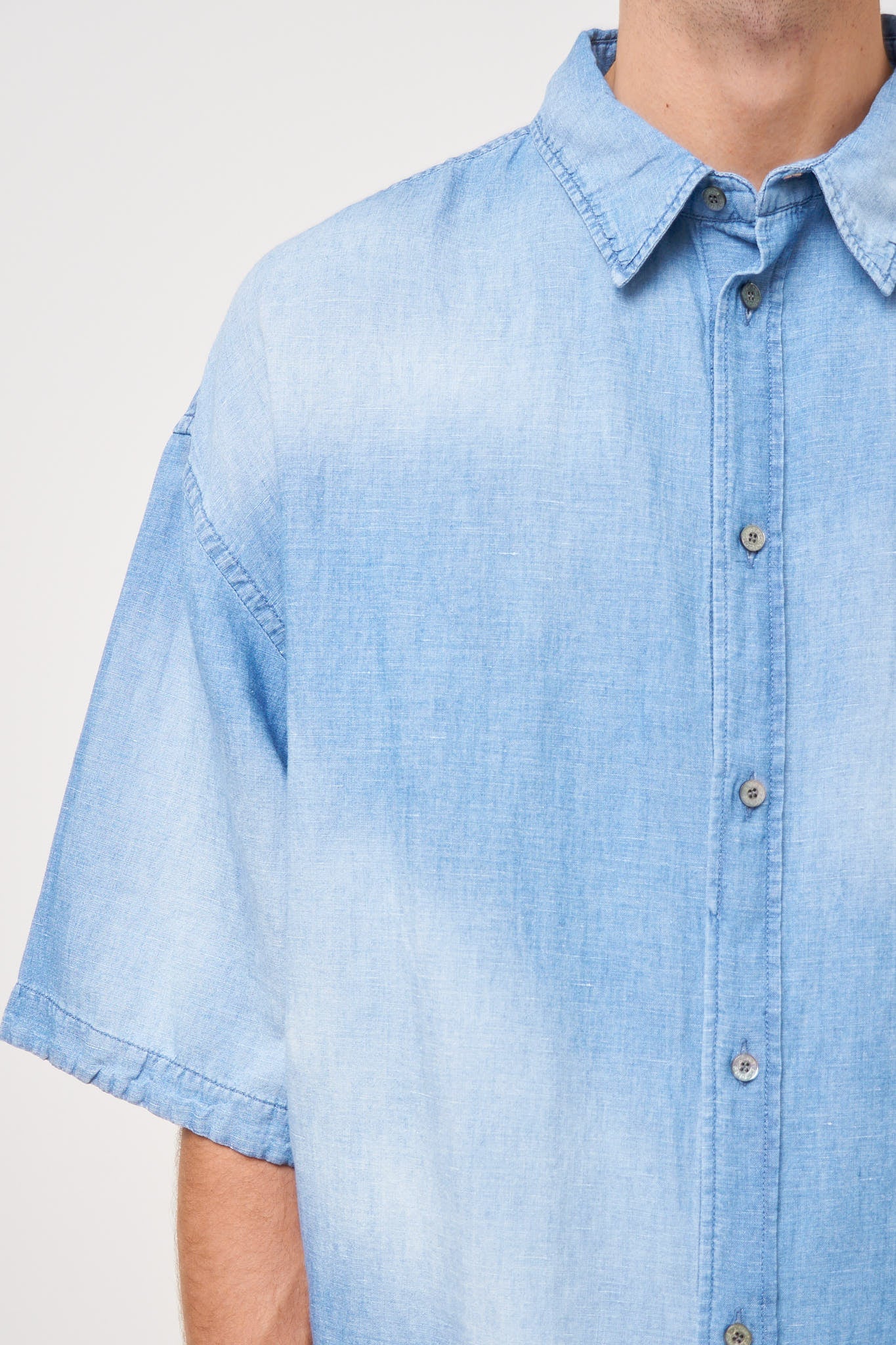 Button-Up Shirt Logo Stamp Mid Blue from Acne Studios. This shirt is made from a lightweight cotton. It has an oversized fit with dropped shoulders and an Acne Studios logo on the back. The shirt closes with buttons.