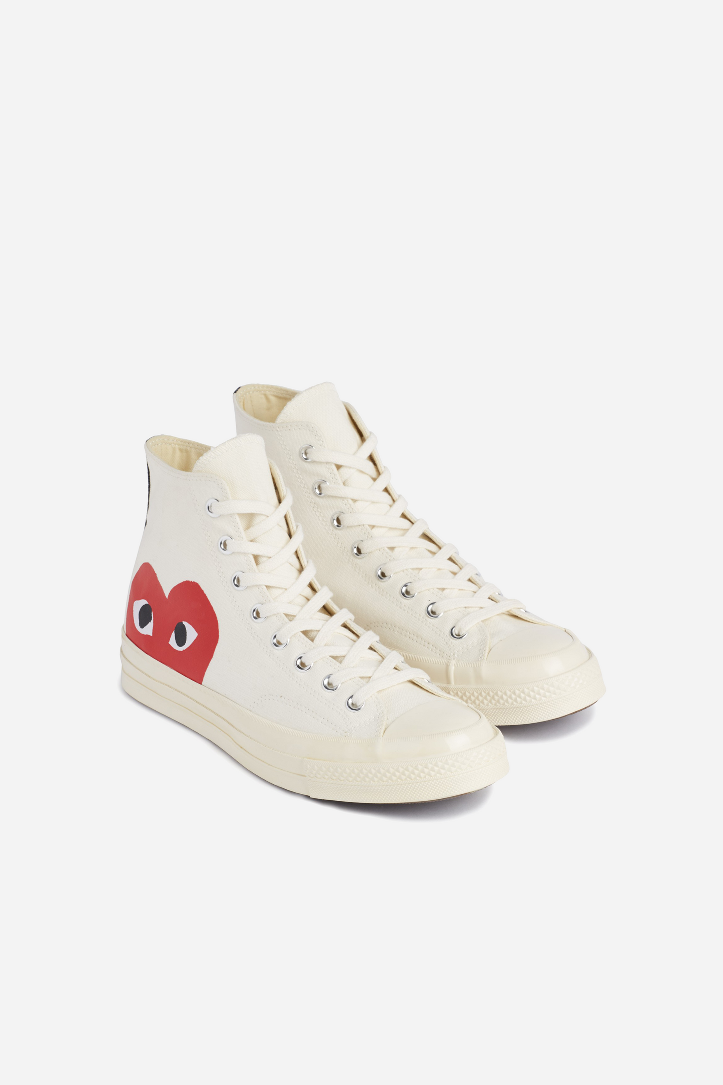 Chuck Taylor high-top sneakers from Comme des Garcons PLAY x Converse featuring a round toe, a lace-up front fastening and a white rubber sole. The fine sneakers feature the iconic red PLAY heart placed on the outside of both shoes.