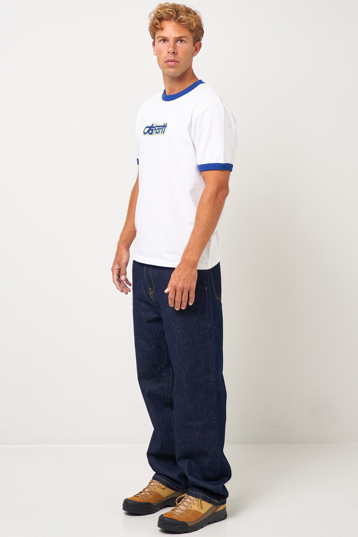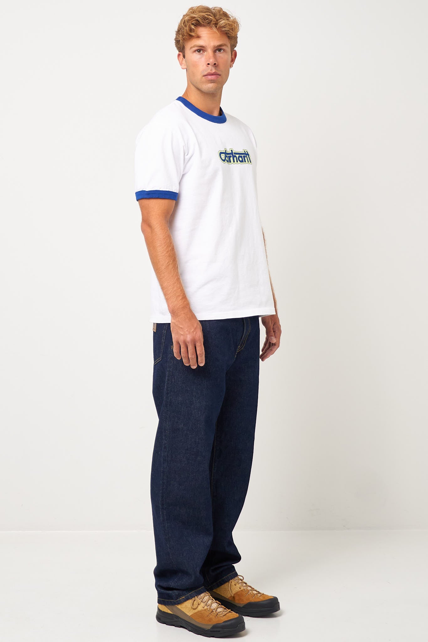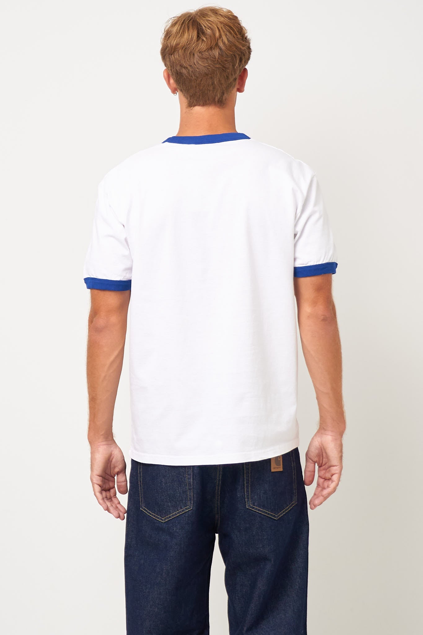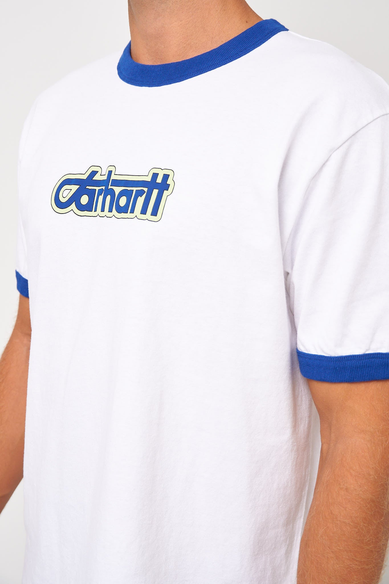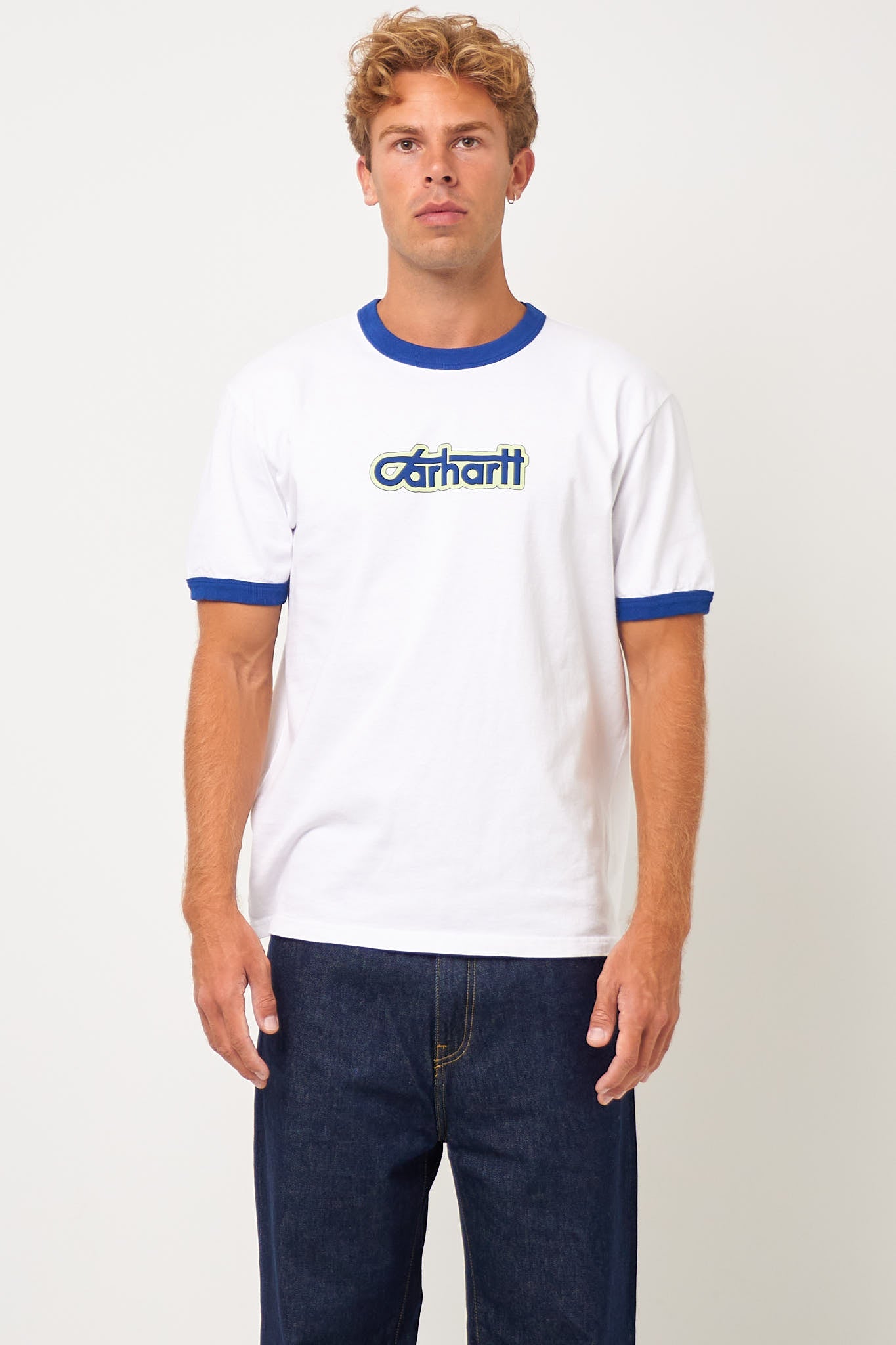 Connection Script White/Wolfsbane from Carhartt WIP. This t-shirt is made from a soft cotton. It has a regular fit with short sleeves and a round neckline. The t-shirt has contrast edges and a larger logo on the chest.