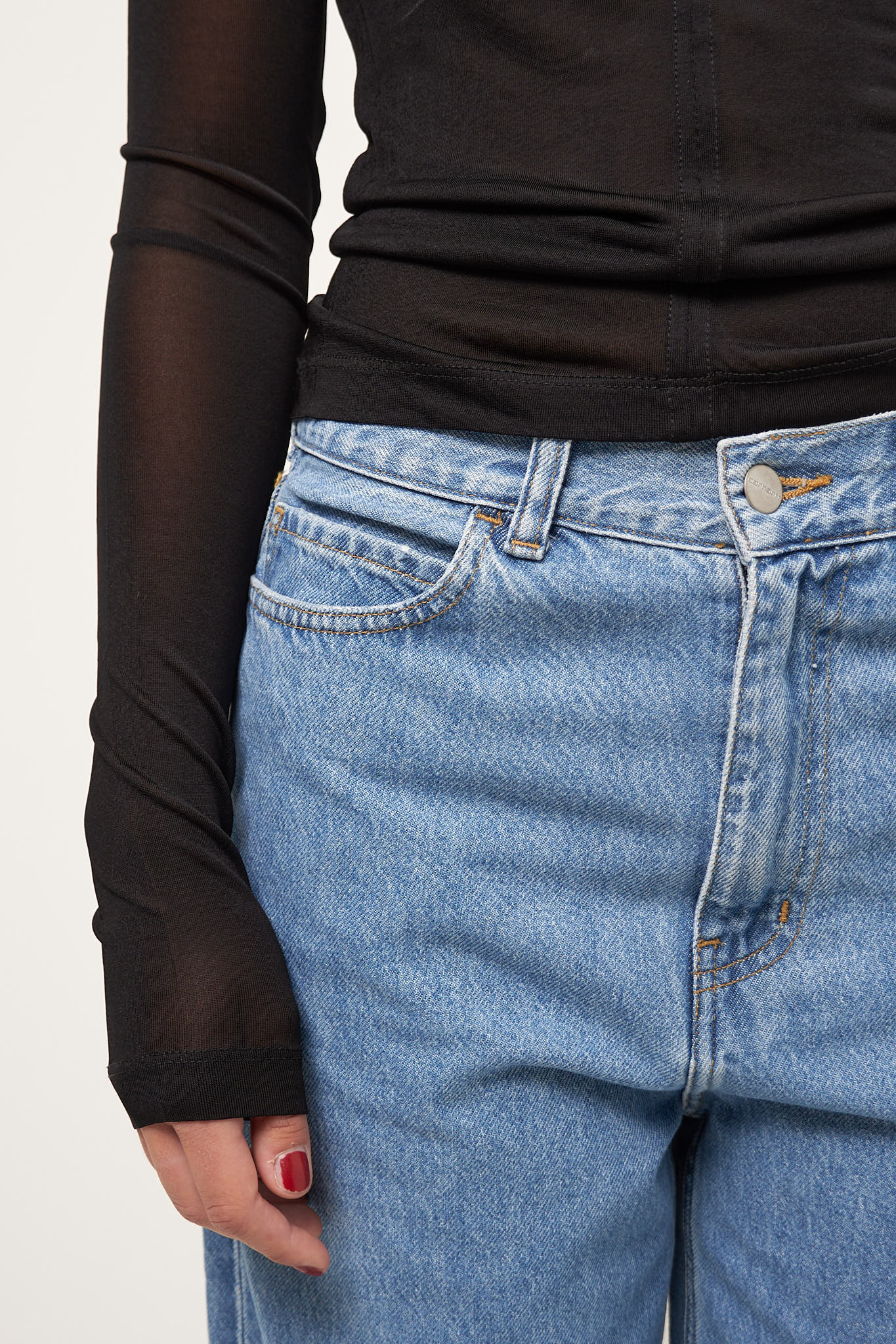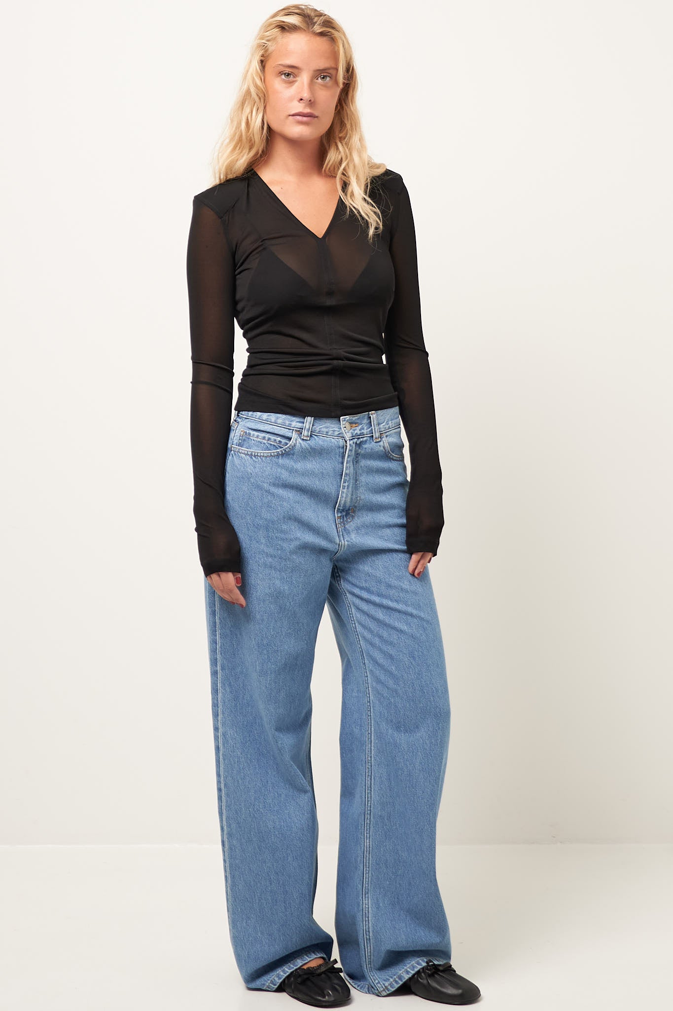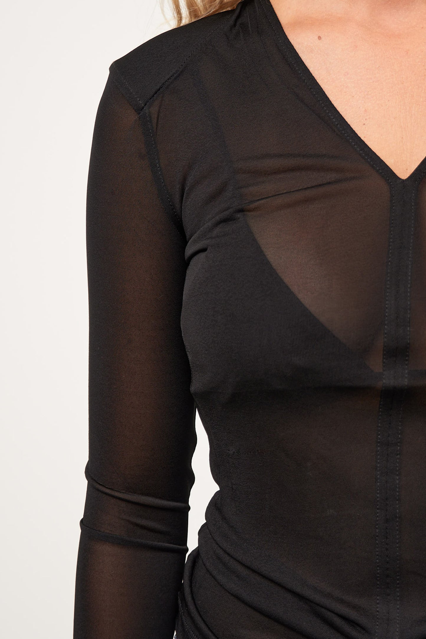 Deep V-Neck Top Black from TOTEME. This top is made in a thin viscose. The top is designed with long sleeves, shoulder pads and a deep v-neckline. This top is semi-sheer.