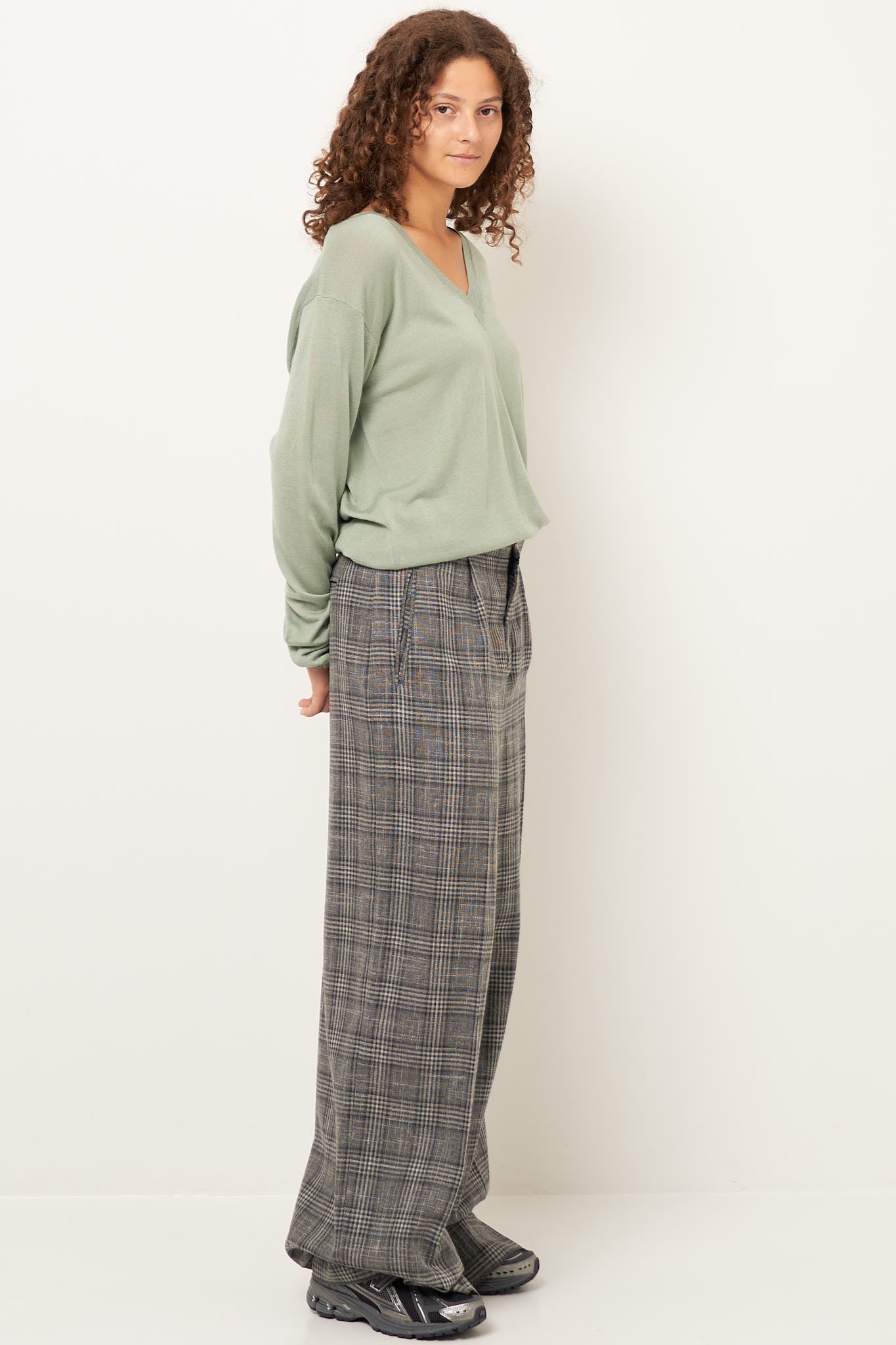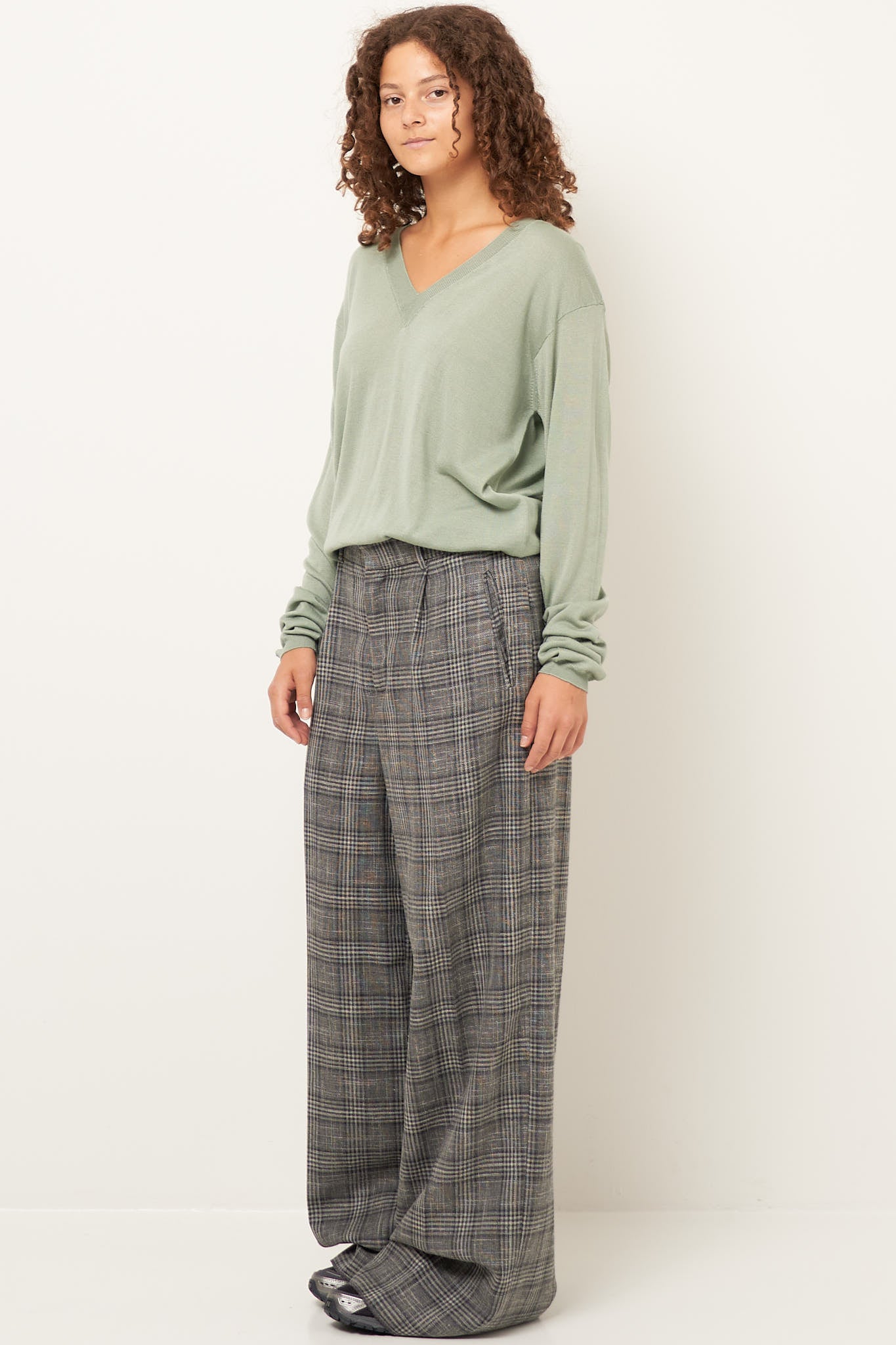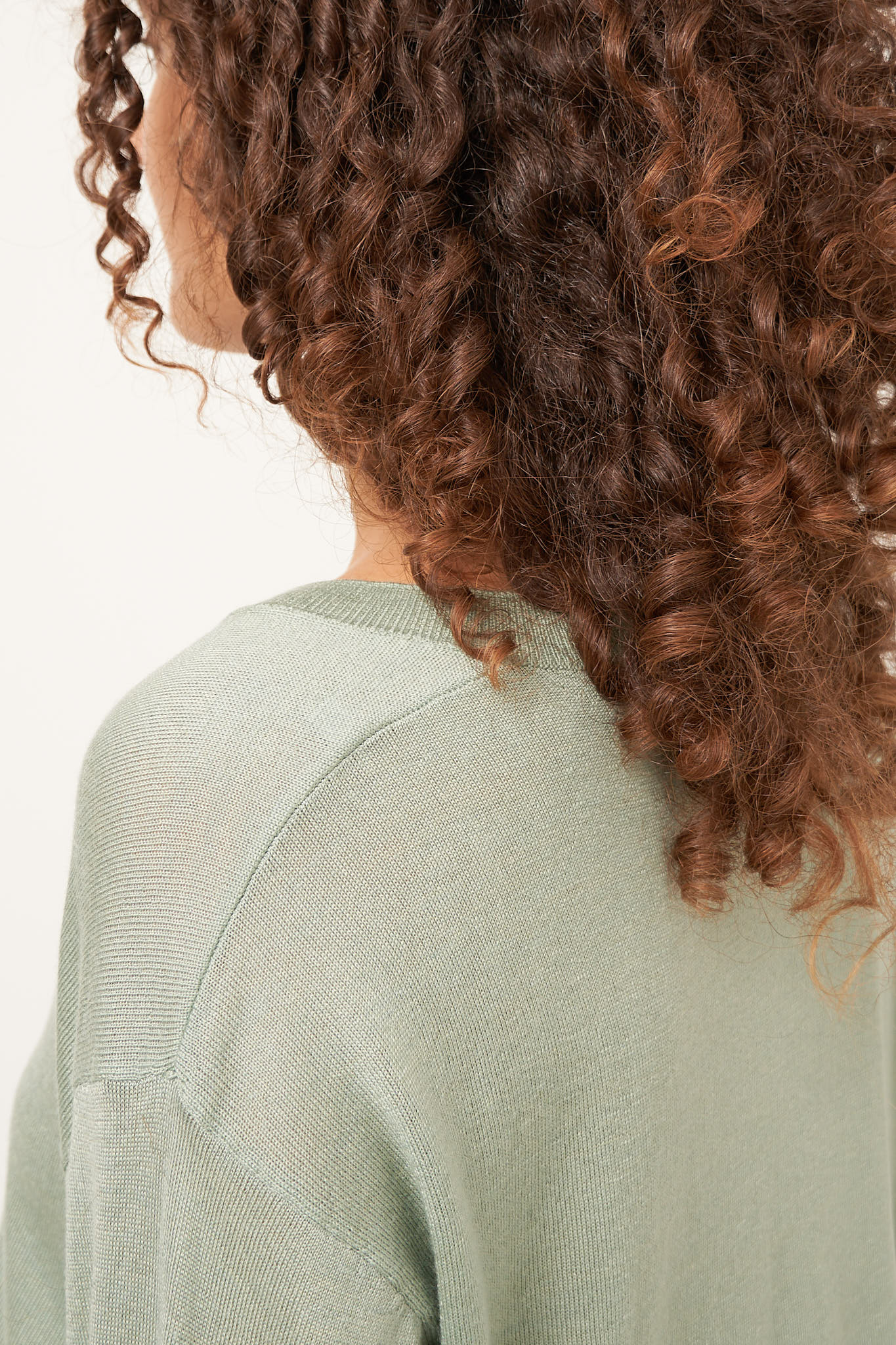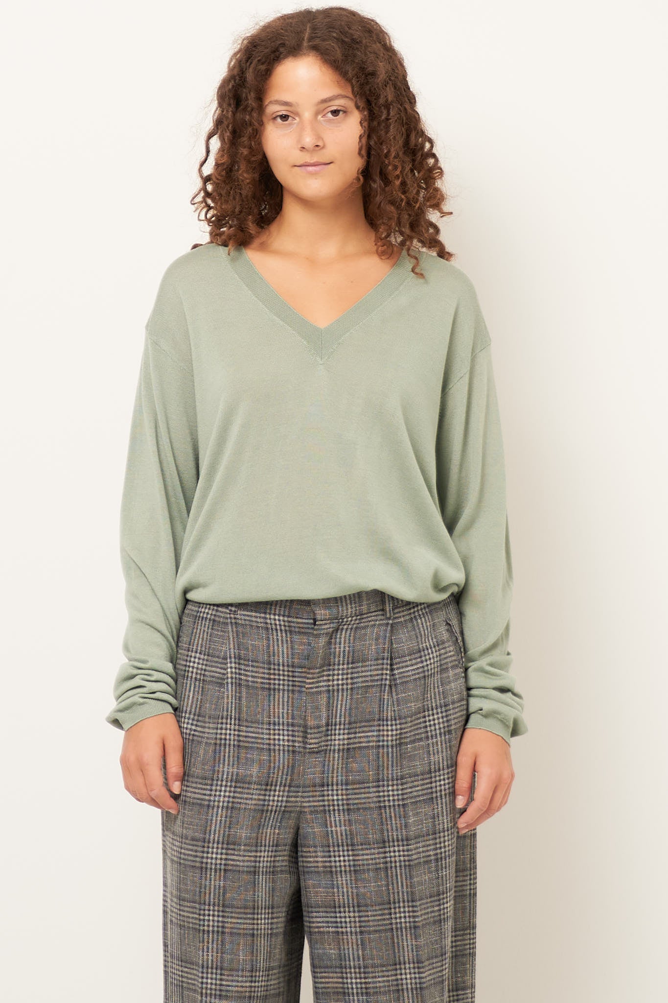 Ebba Wool Silk V-Neck Pale Green from STRØM. This knit is made from a silk and merino wool blend. It has a regular fit with a v-neckline and ribbed edges. The knitwear is made in Italy.