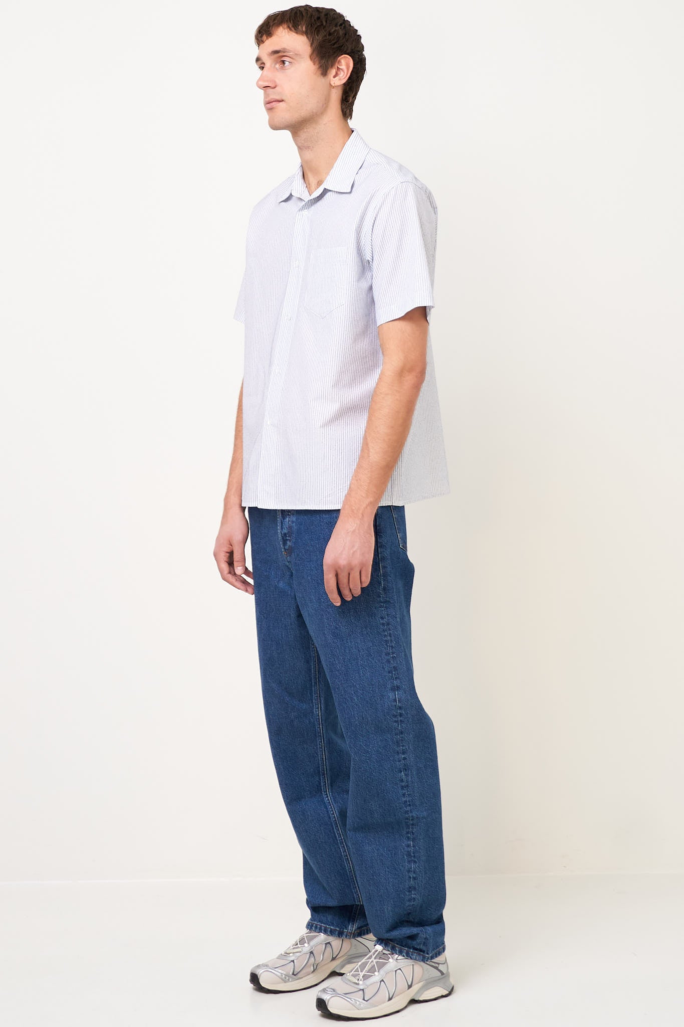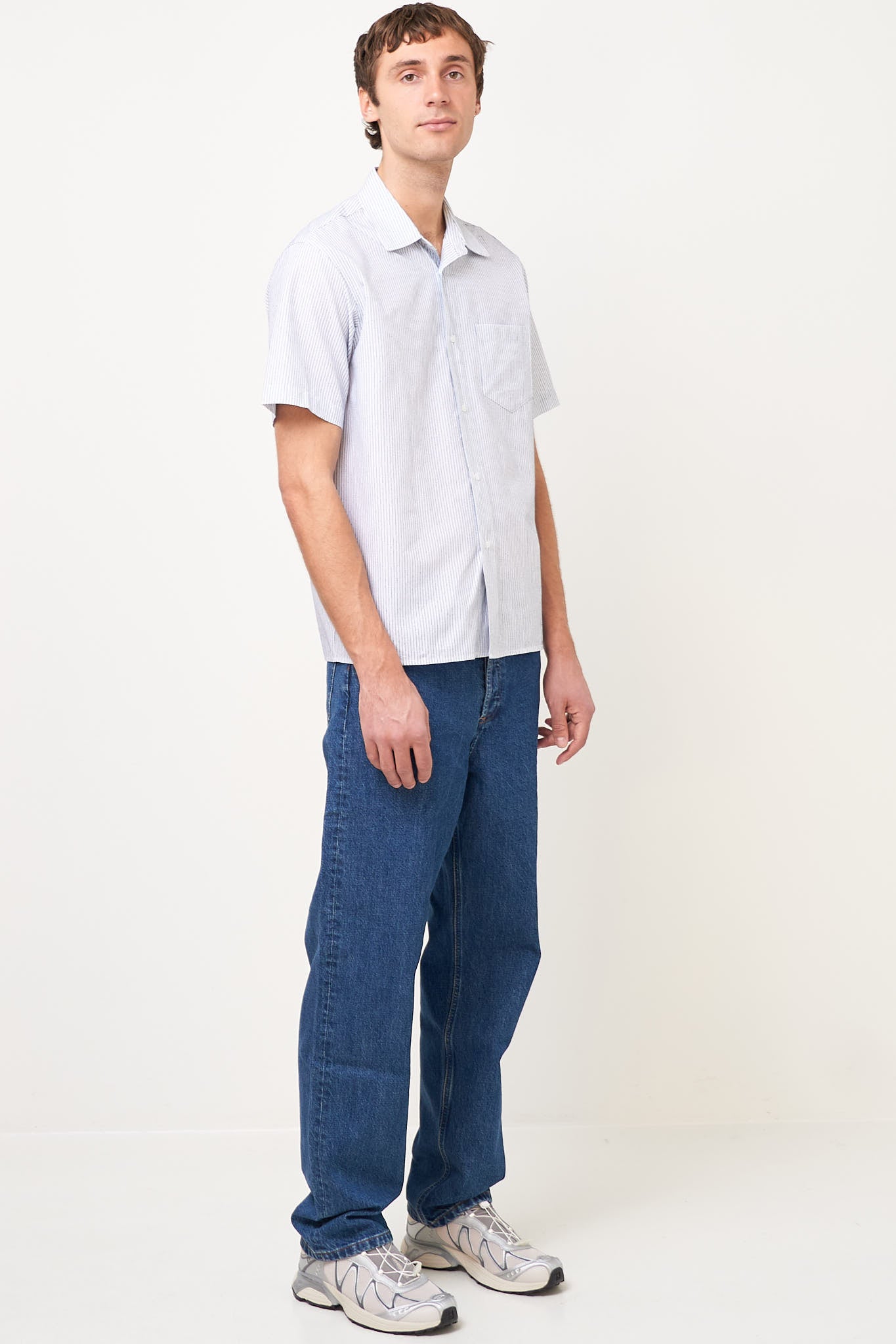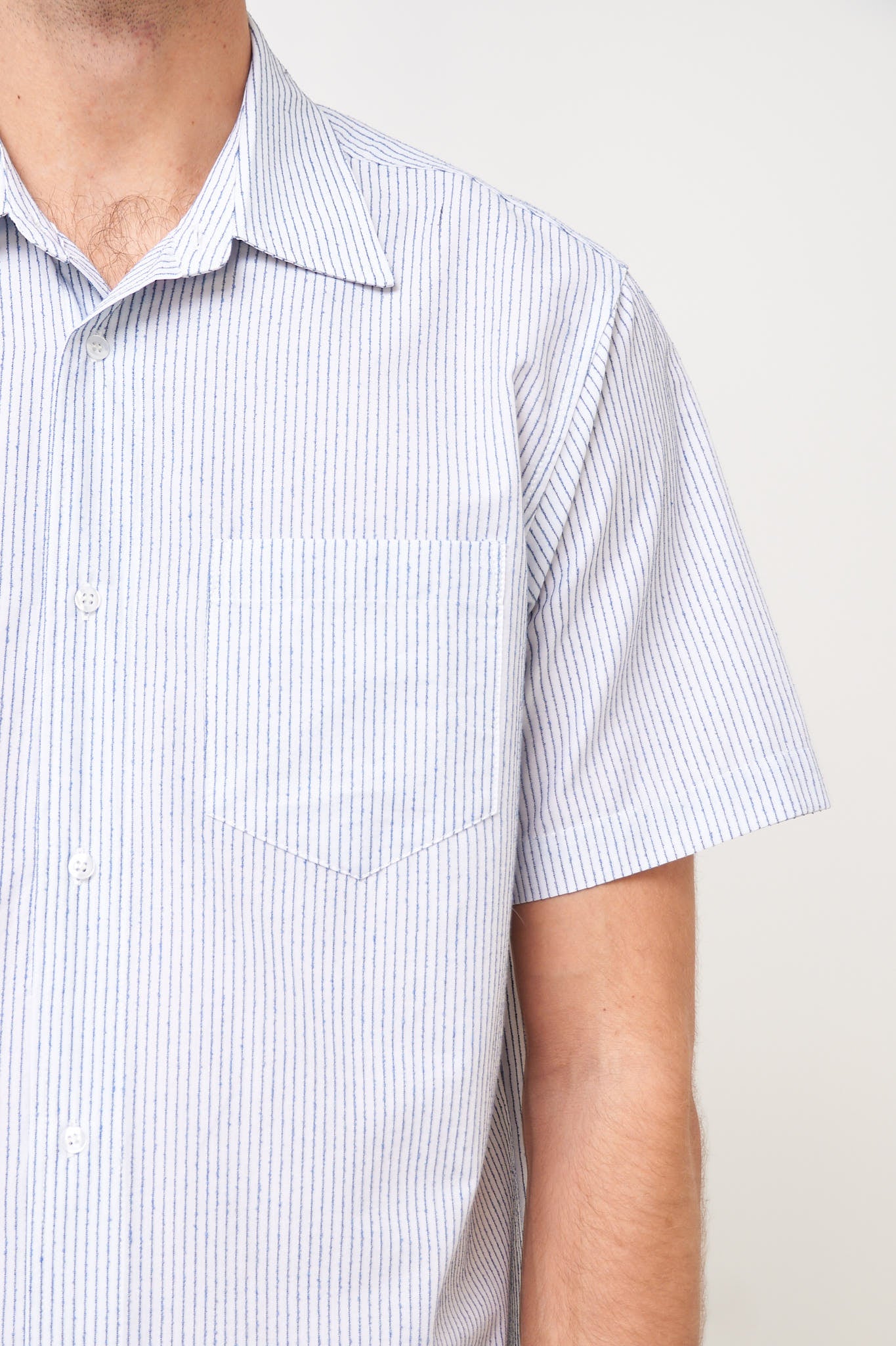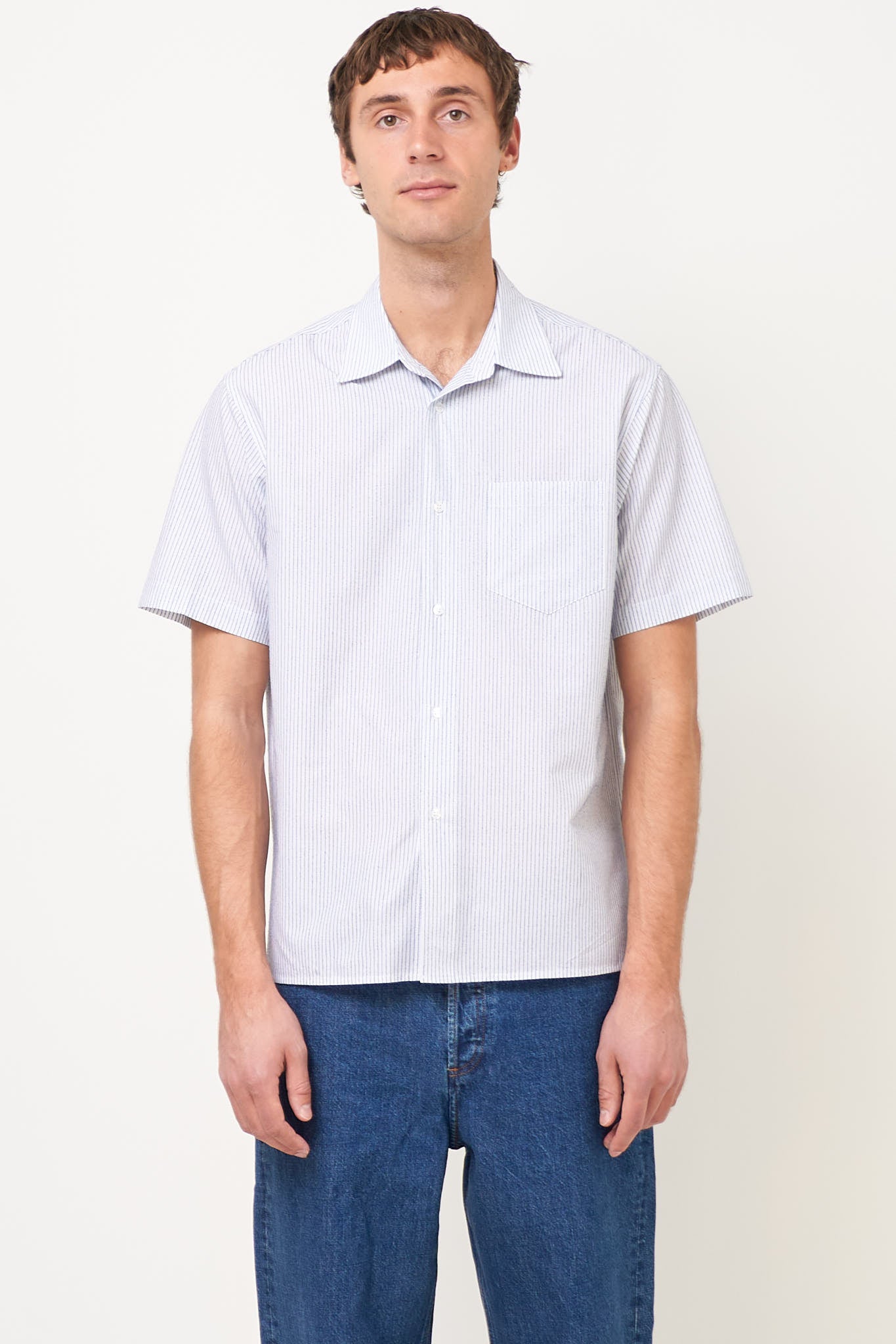 Flight Shirt Blue Stripe from STRØM. This shirt is made of lightweight cotton. It is designed in a relaxed fit with short sleeves and a chest pocket on the left front. The shirt closes at the front with buttons.