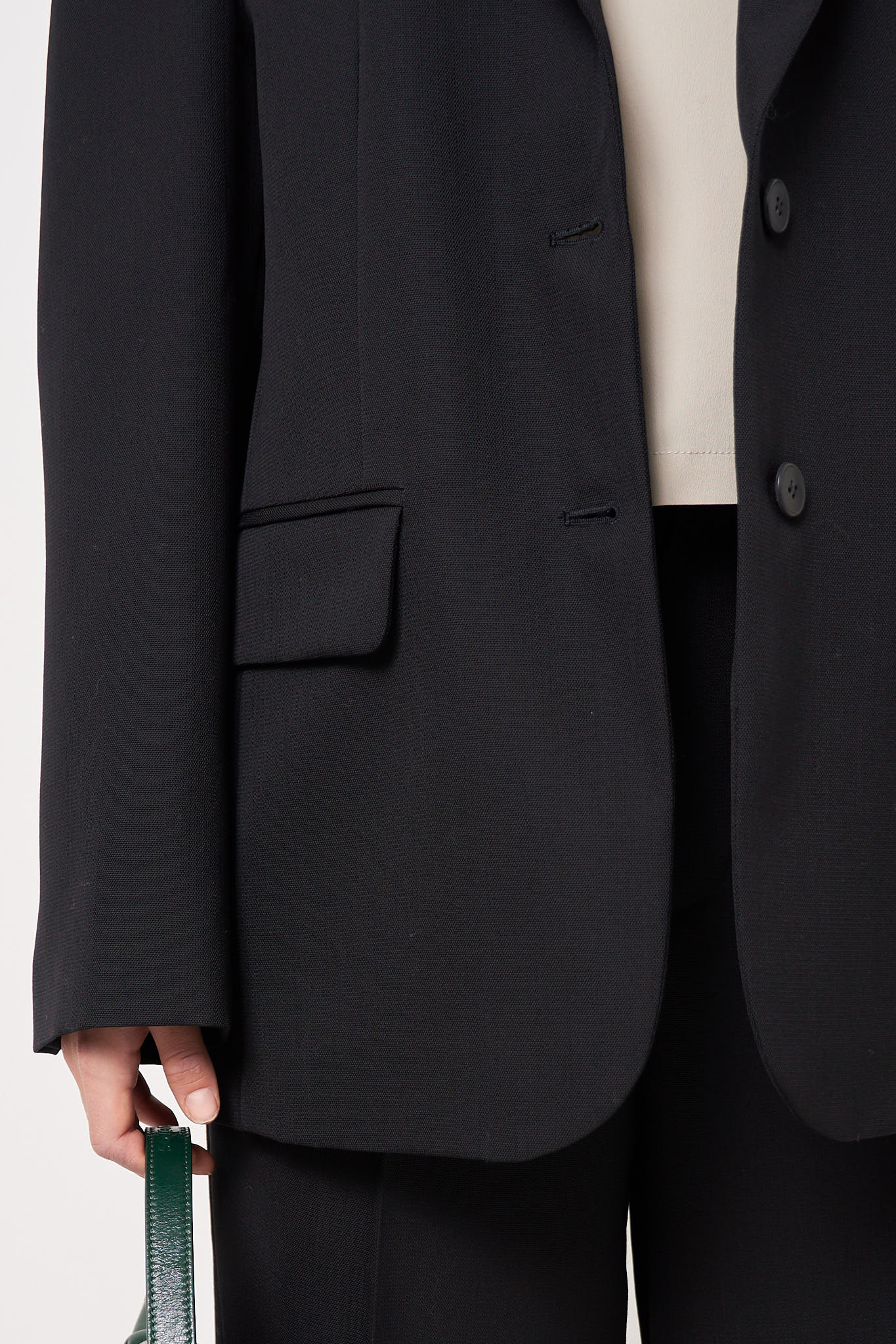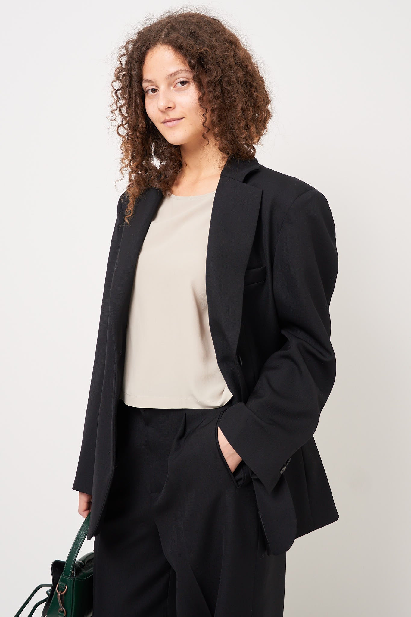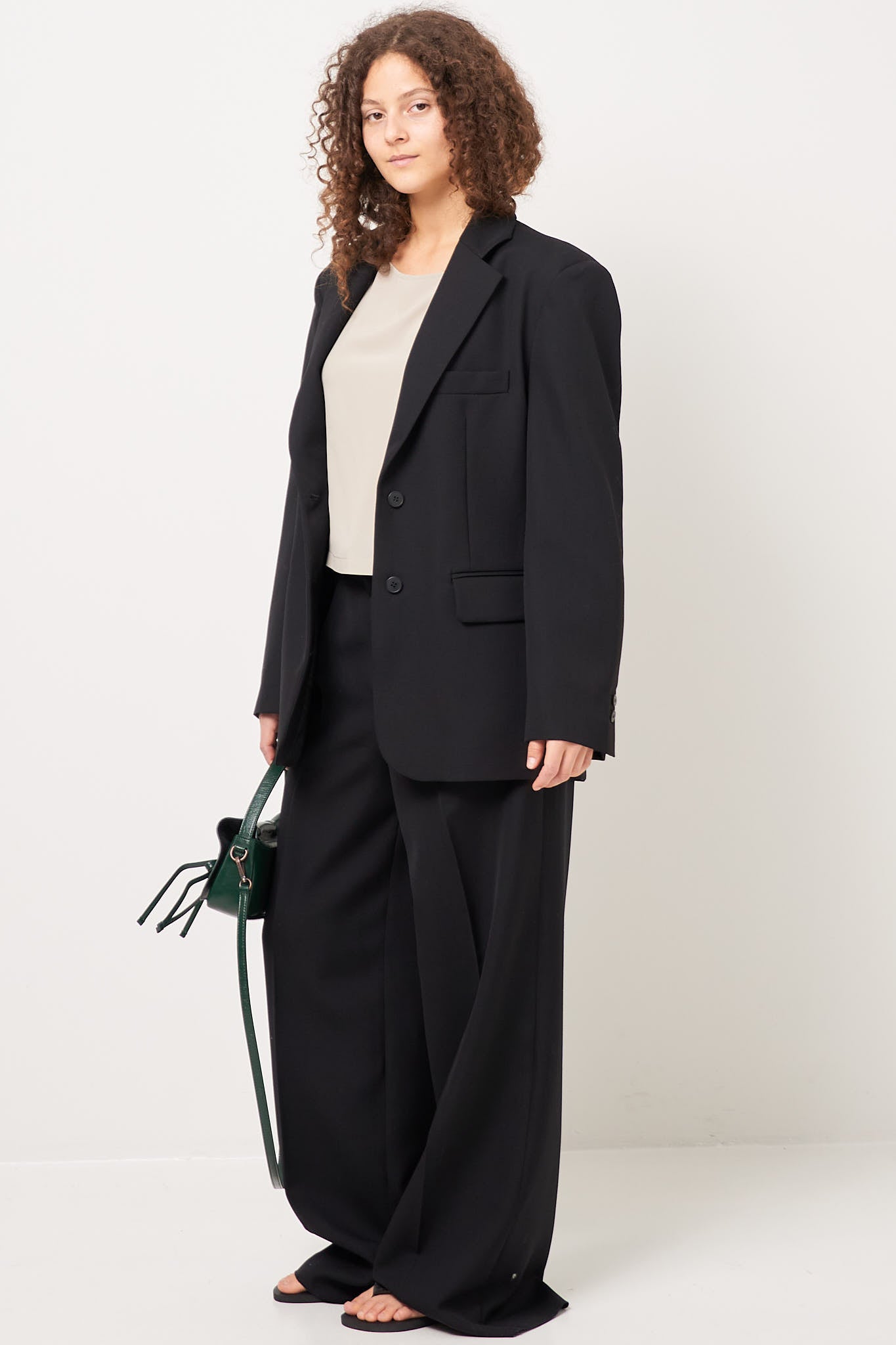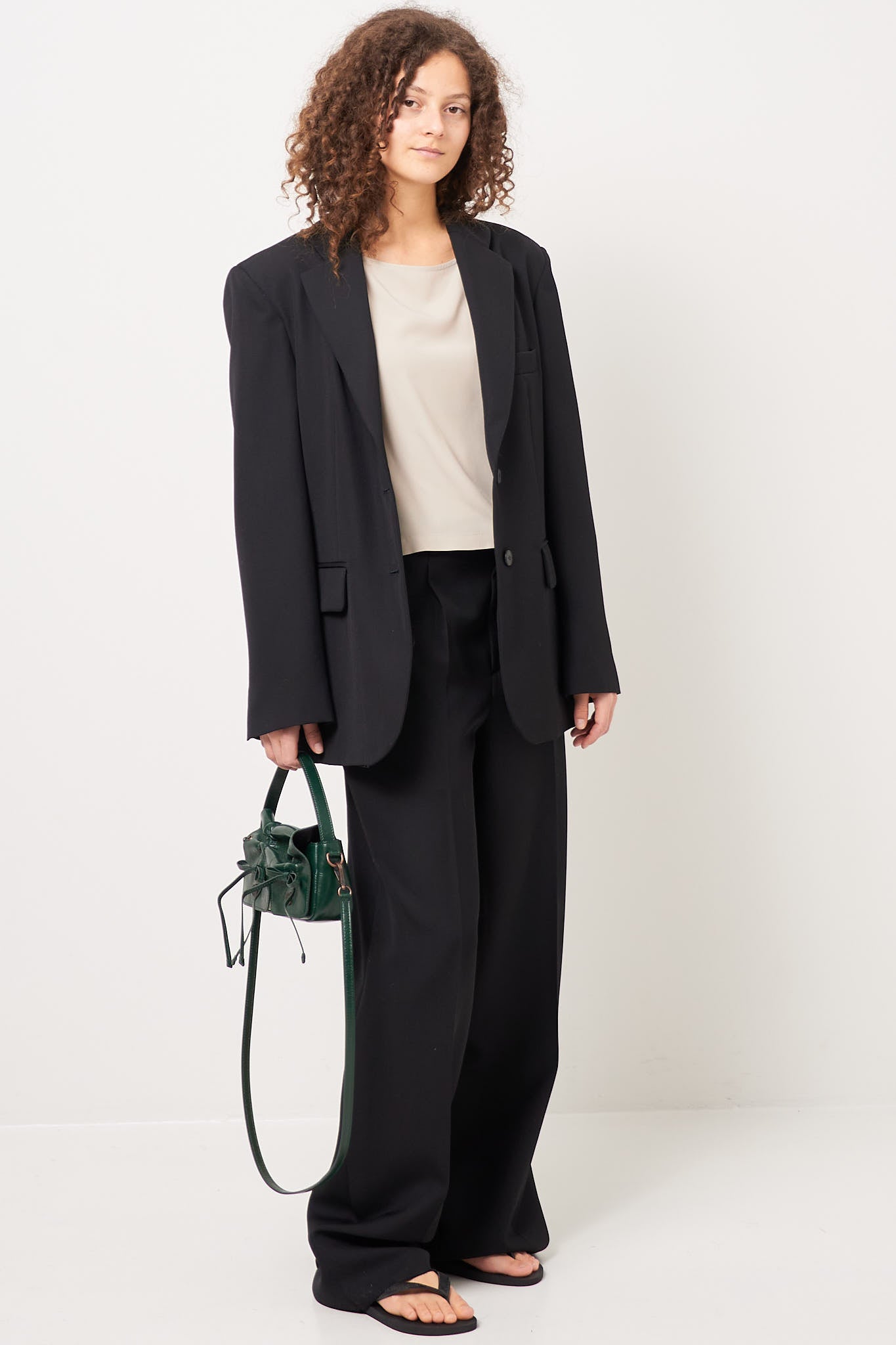 Friday Blazer Black from STRØM. This blazer is made in Italy and made from deadstock fabric from an internationally renowned fashion house and comes in a limited number. The blazer is made from a cotton with a denim finish. It has an oversized fit with shoulder pads and front pockets.