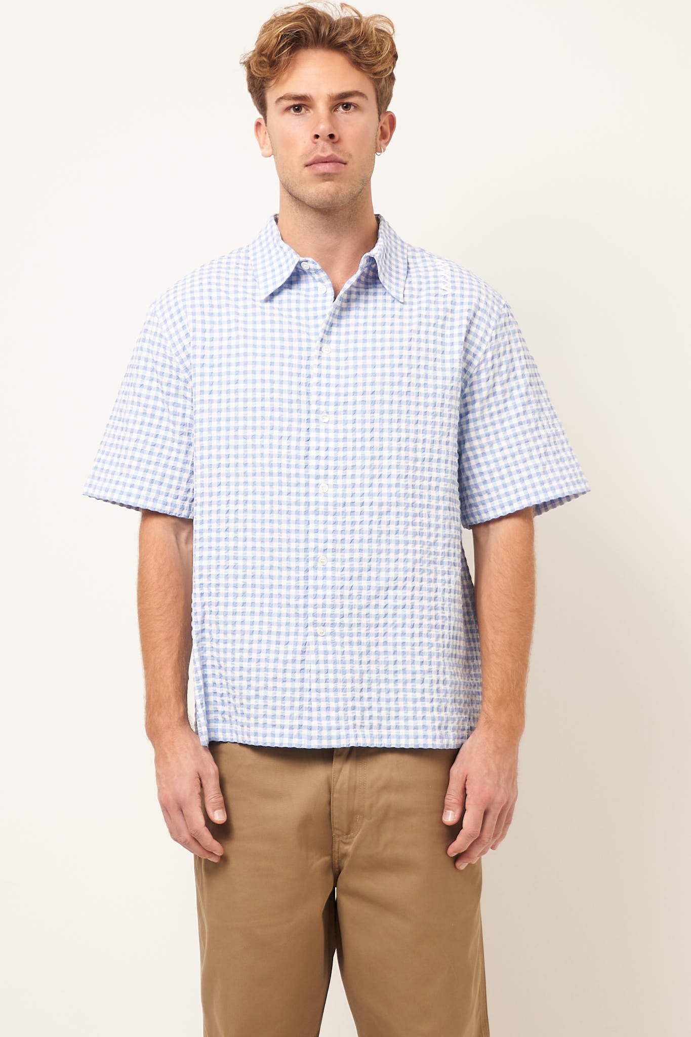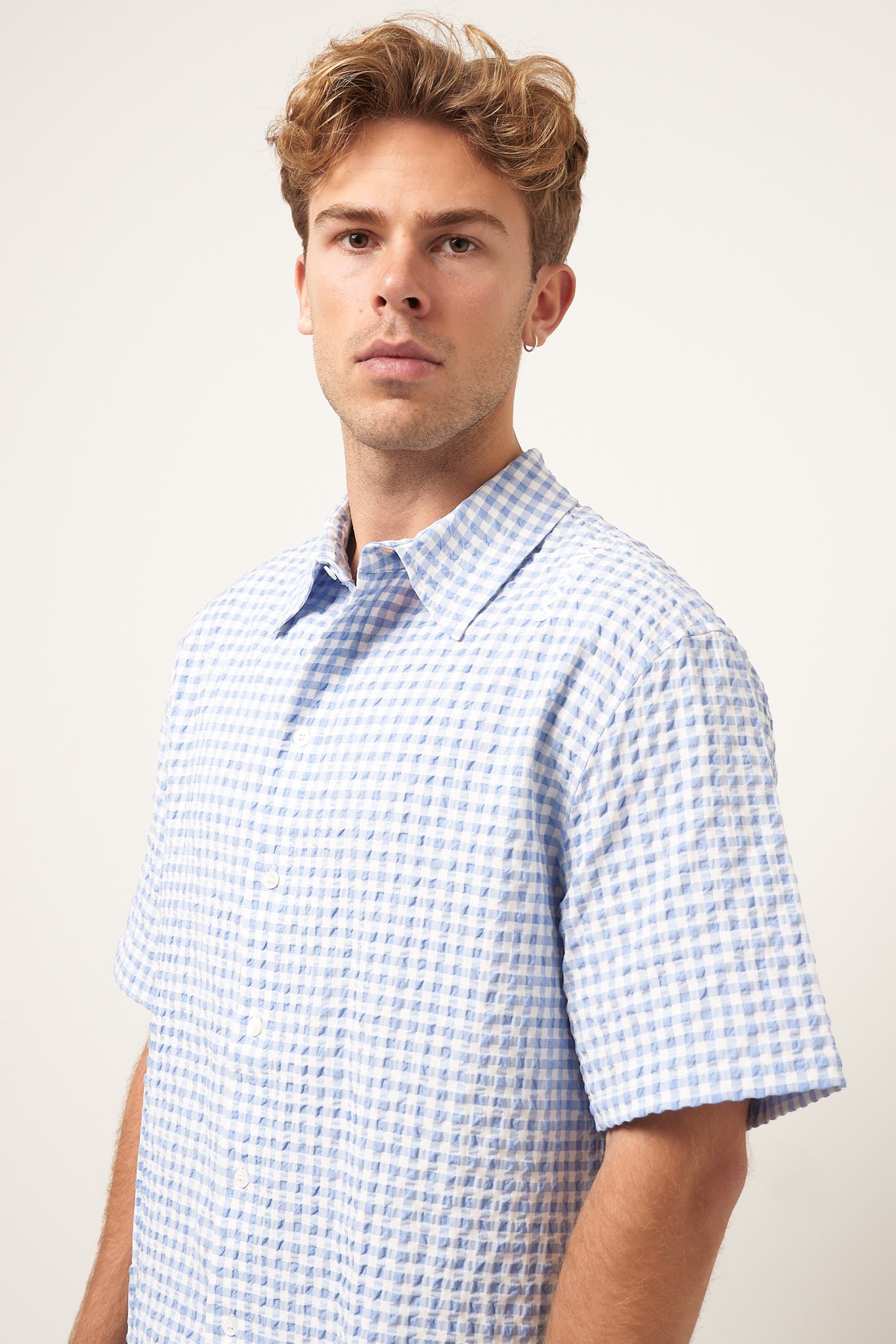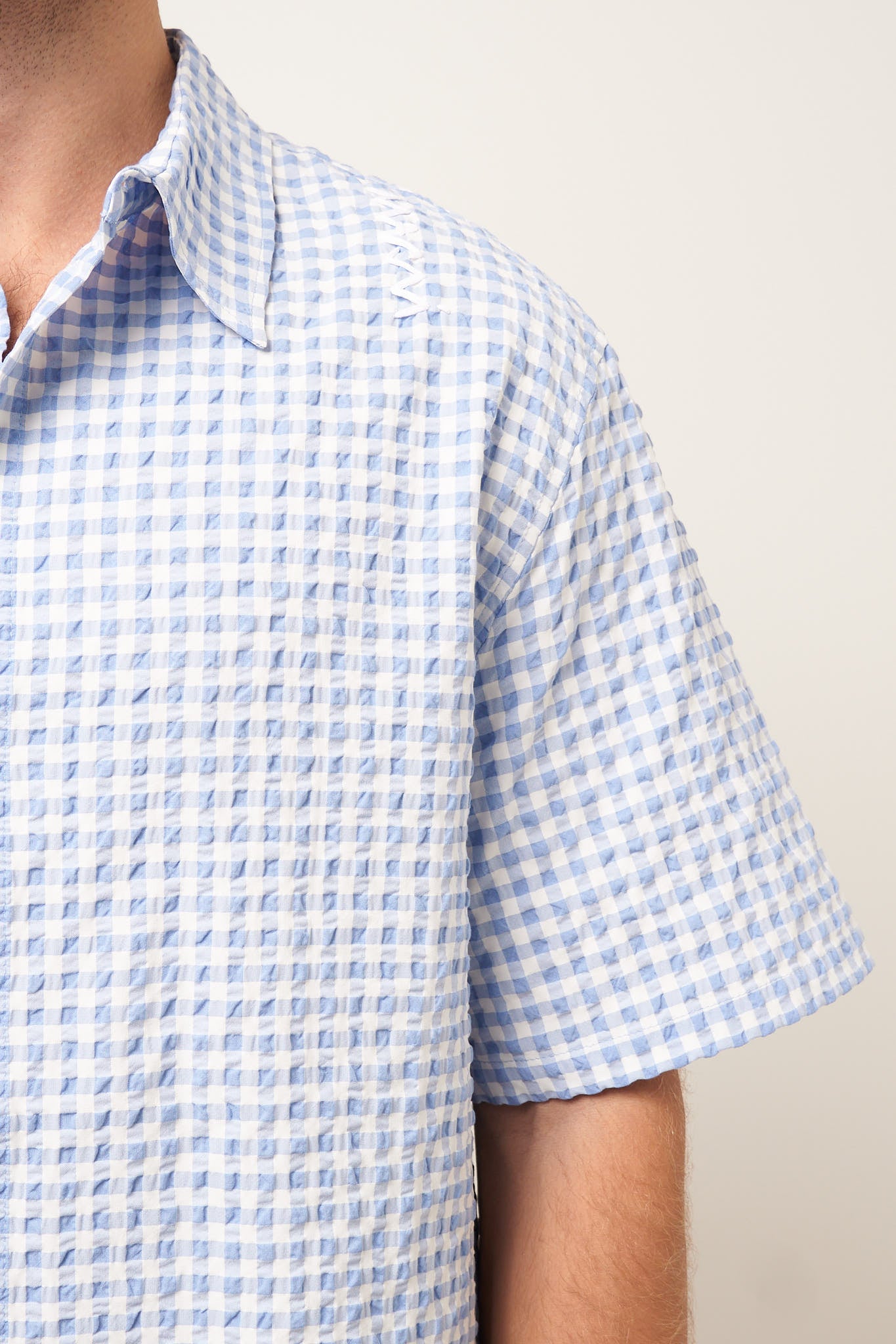 Gingham Seersucker Shirt Light Blue from Marni. This shirt is made from a soft seersucker. It is designed with short sleeves and a Marni logo on one shoulder. The shirt closes with buttons.