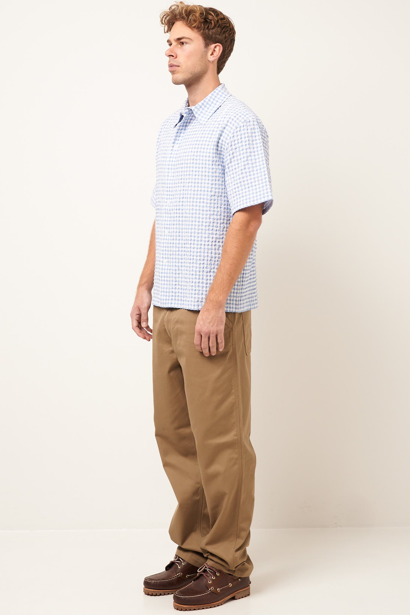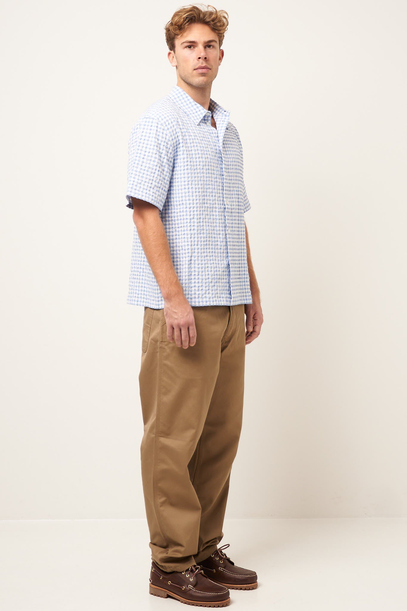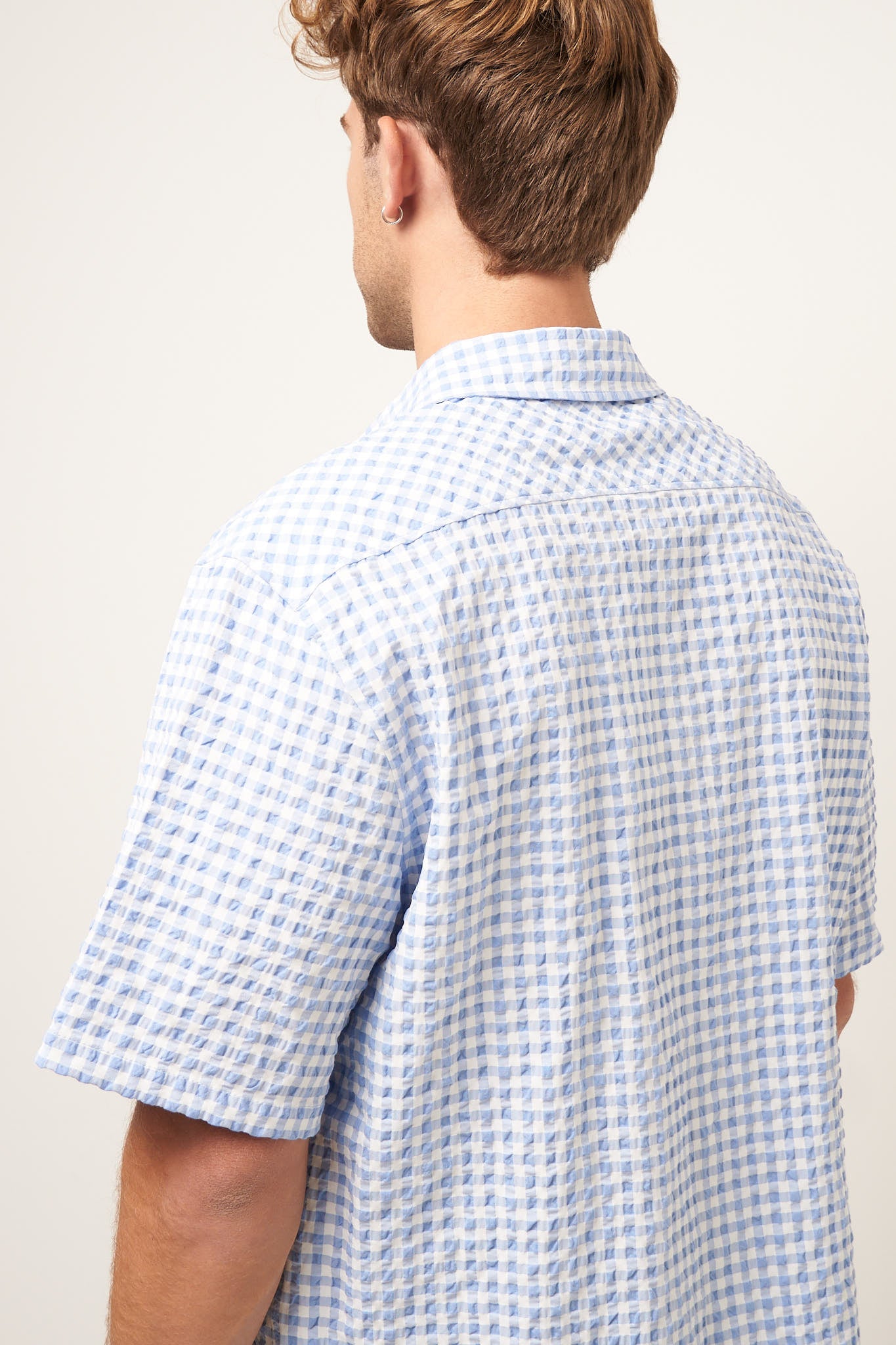 Gingham Seersucker Shirt Light Blue from Marni. This shirt is made from a soft seersucker. It is designed with short sleeves and a Marni logo on one shoulder. The shirt closes with buttons.