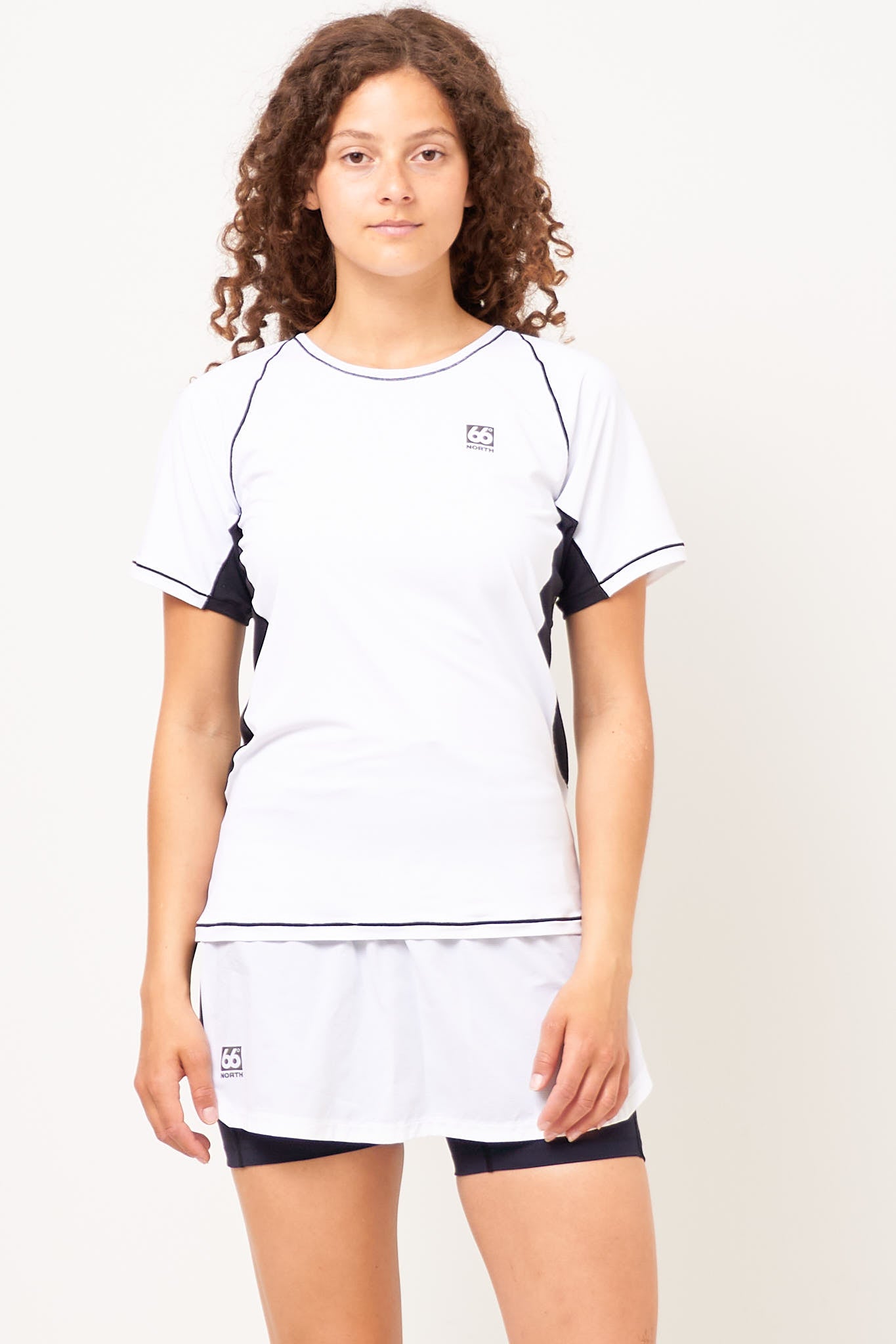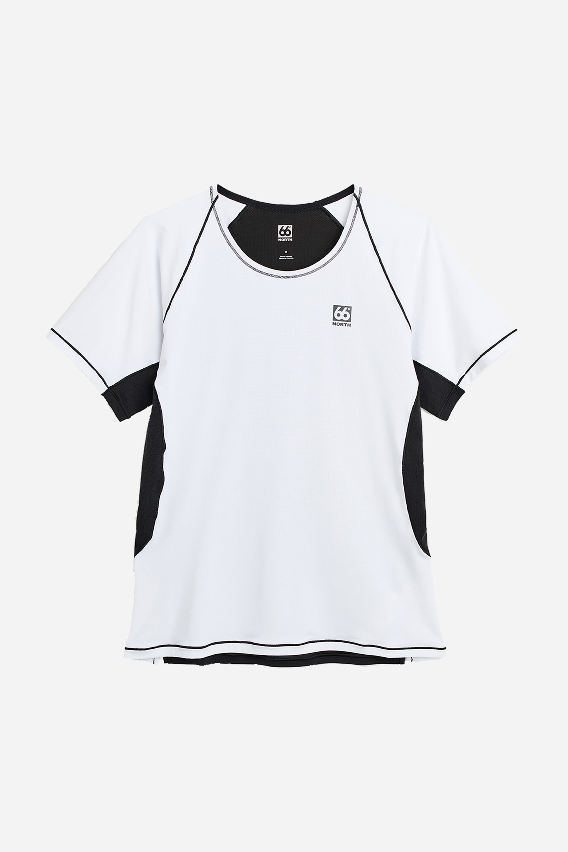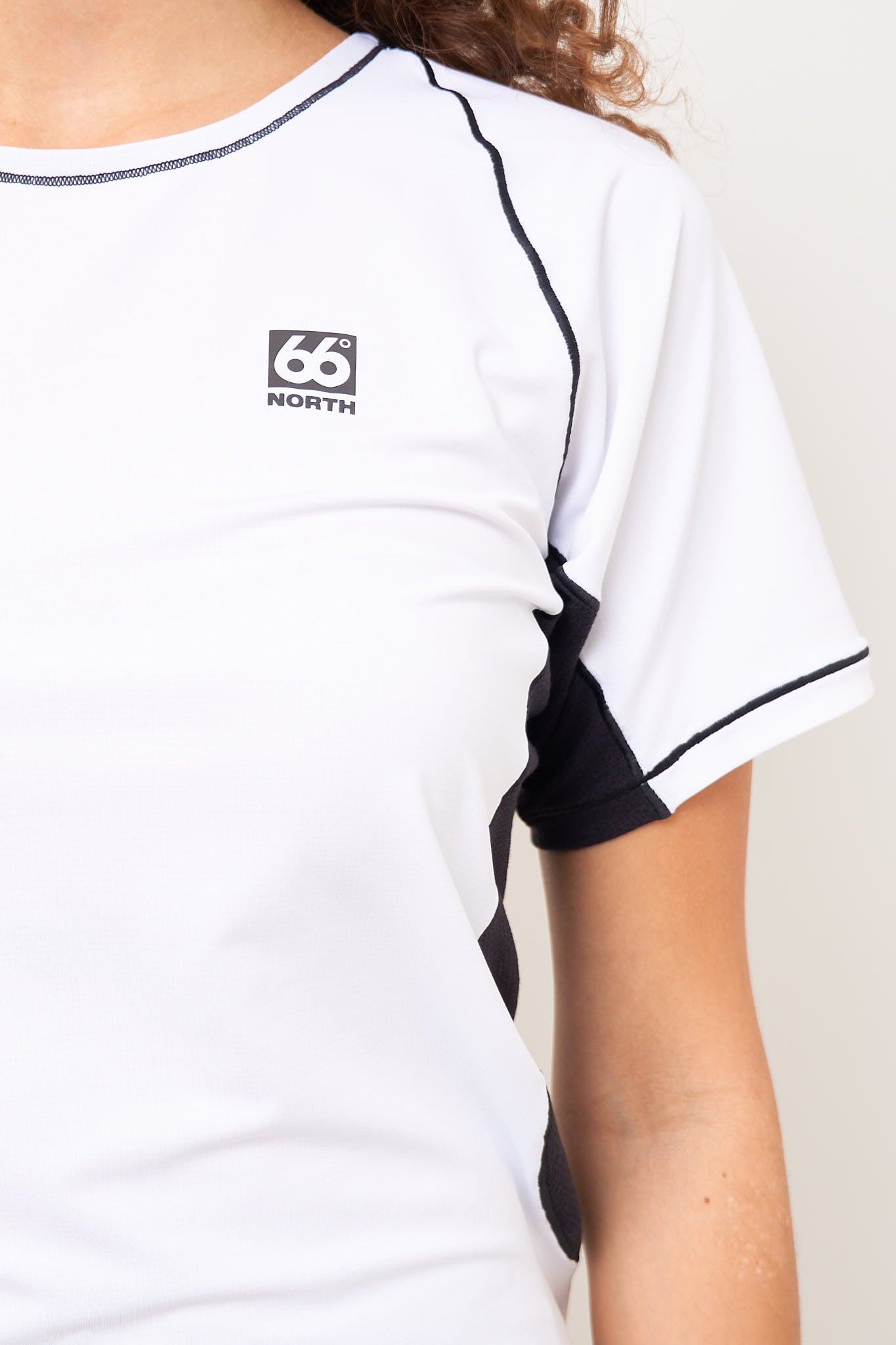 Helgafell W T-Shirt White from 66°North. This t-shirt is made from a lightweight polyester blend. It has a regular and relaxed fit with short sleeves and a 66°North logo on the chest.