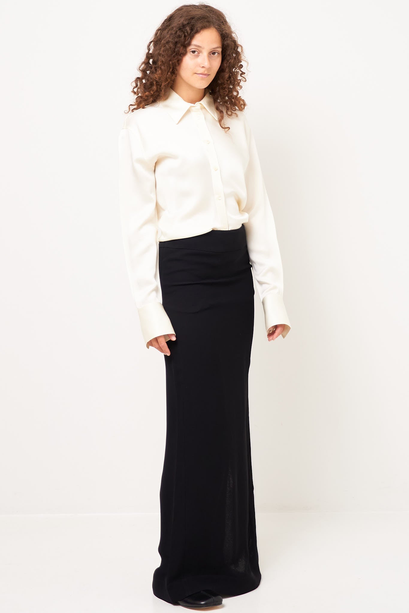 High Slit Skirt Black from TOTEME. This skirt is designed in a light viscose. The skirt is designed with a mid-high waist and a high slit in the side. This skirt closes with a zipper and hook in the side.